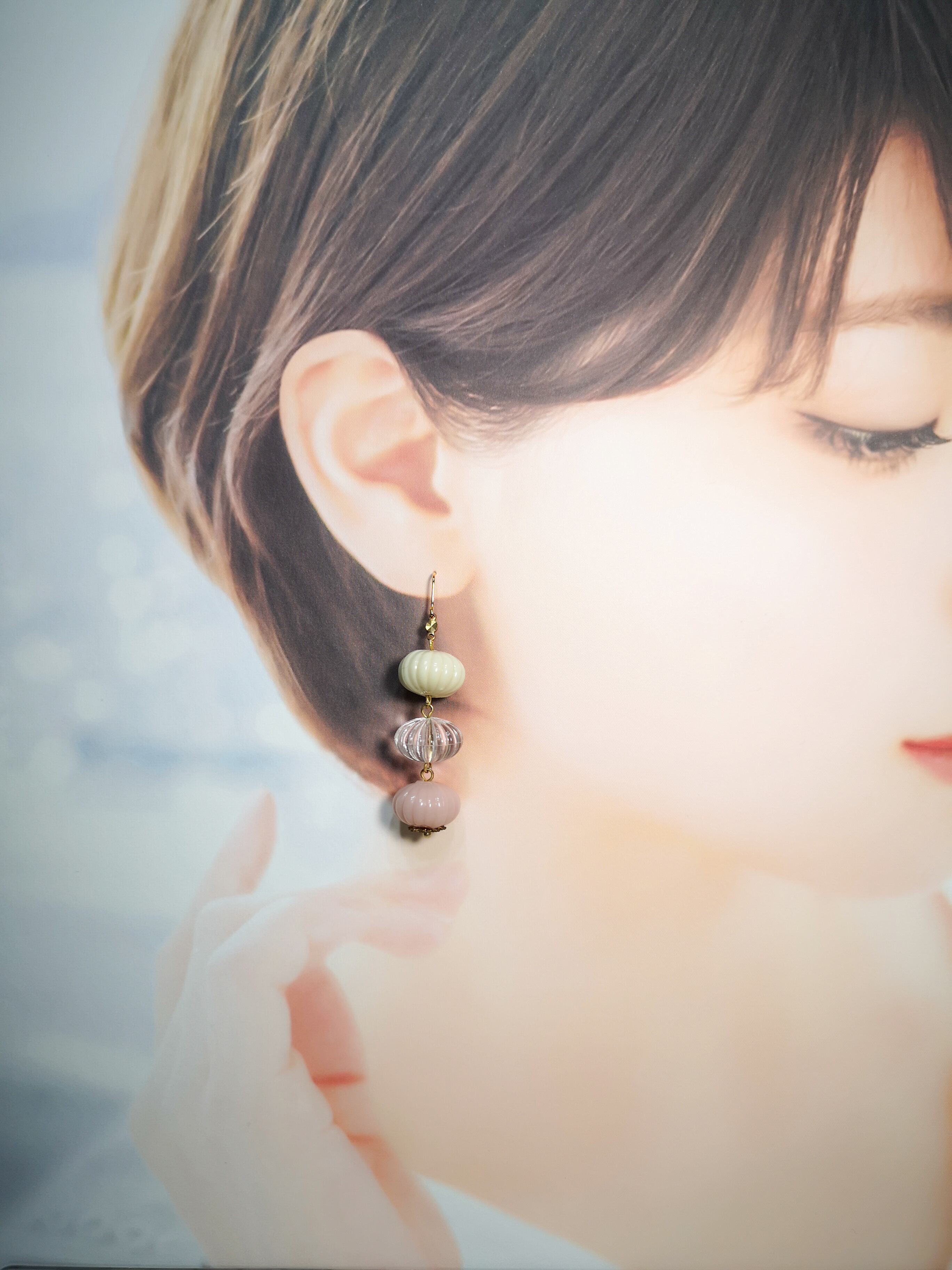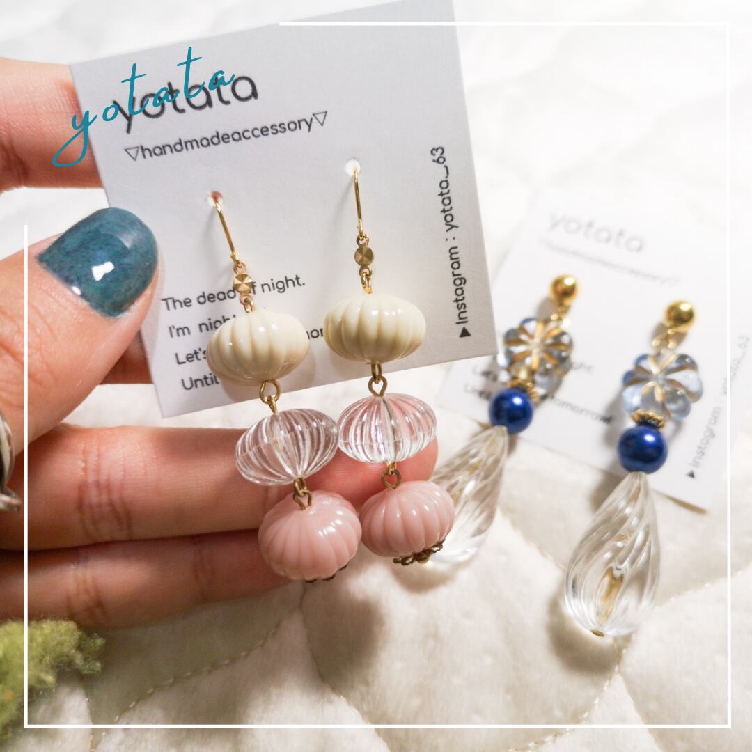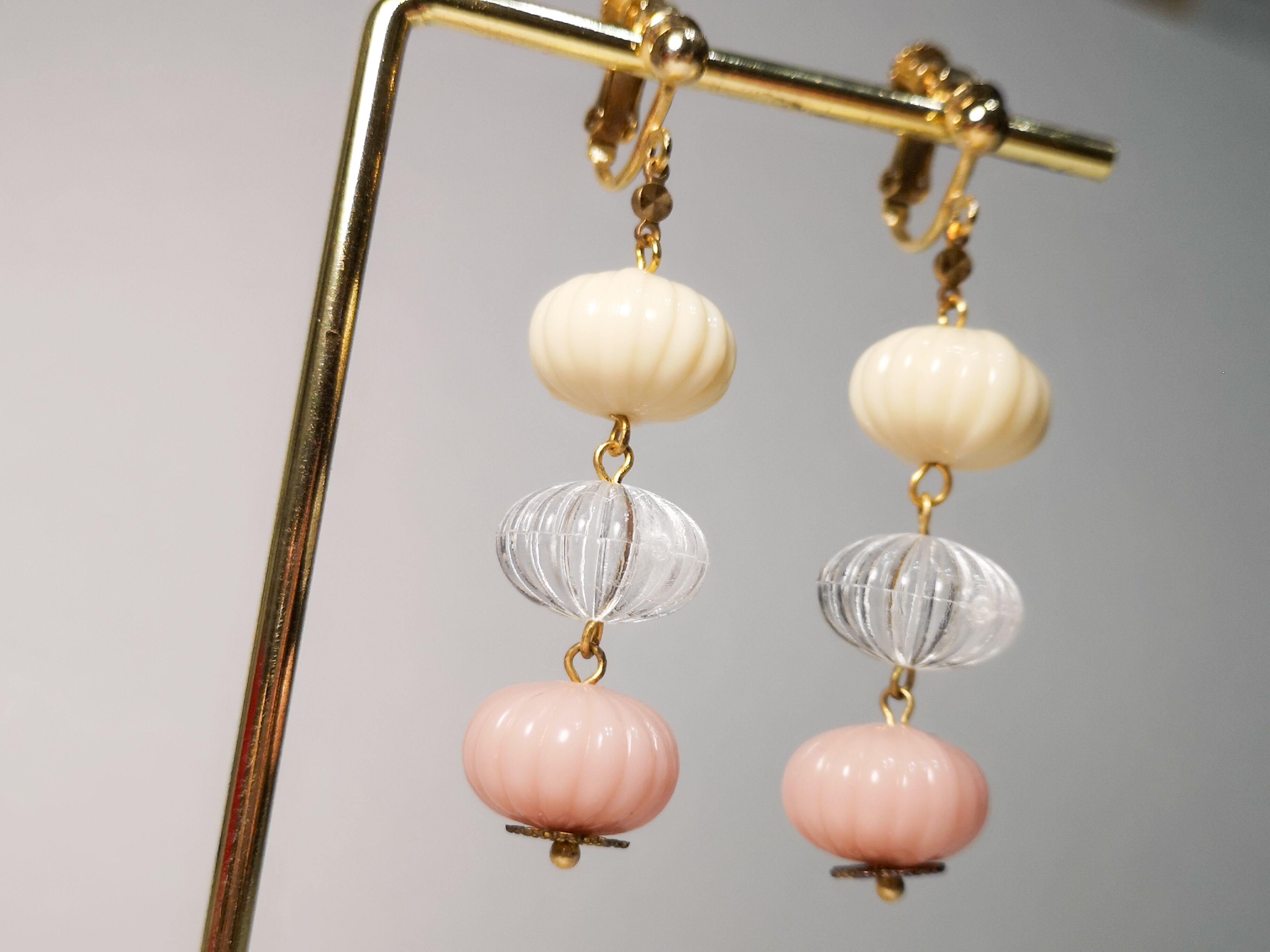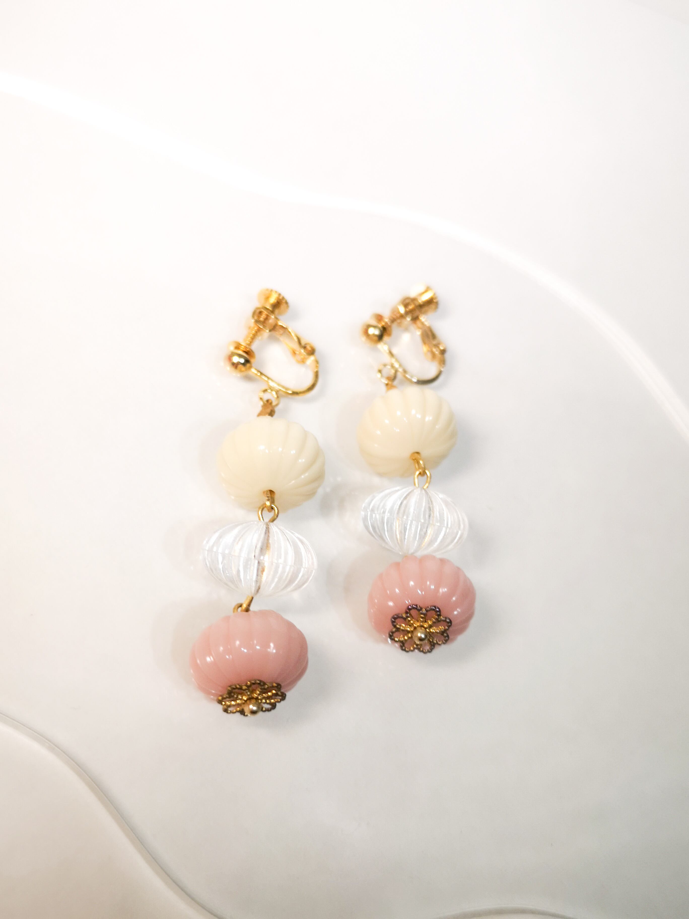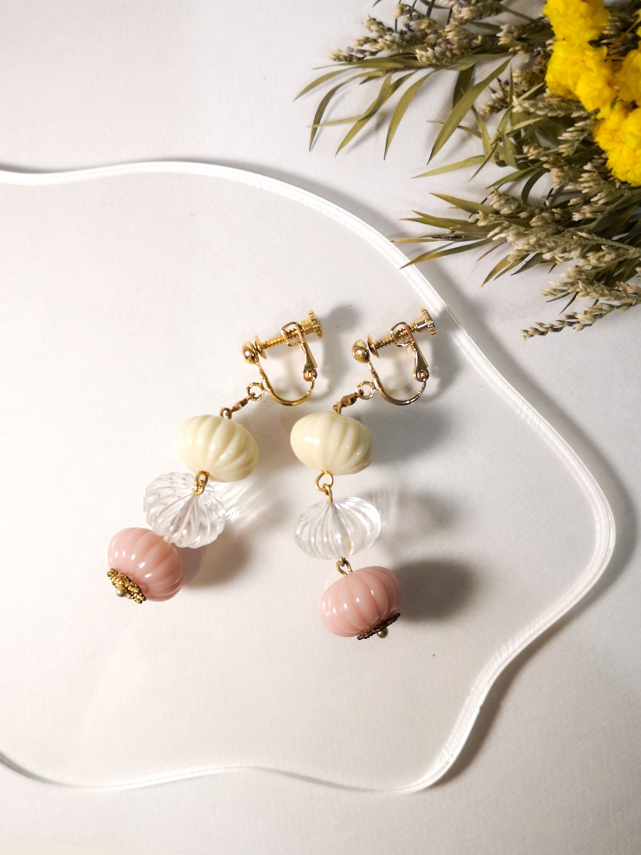個性豊かな3つ子のパンプキンが、耳元で楽し気に揺れ、周囲に温かみのある印象を与えます。