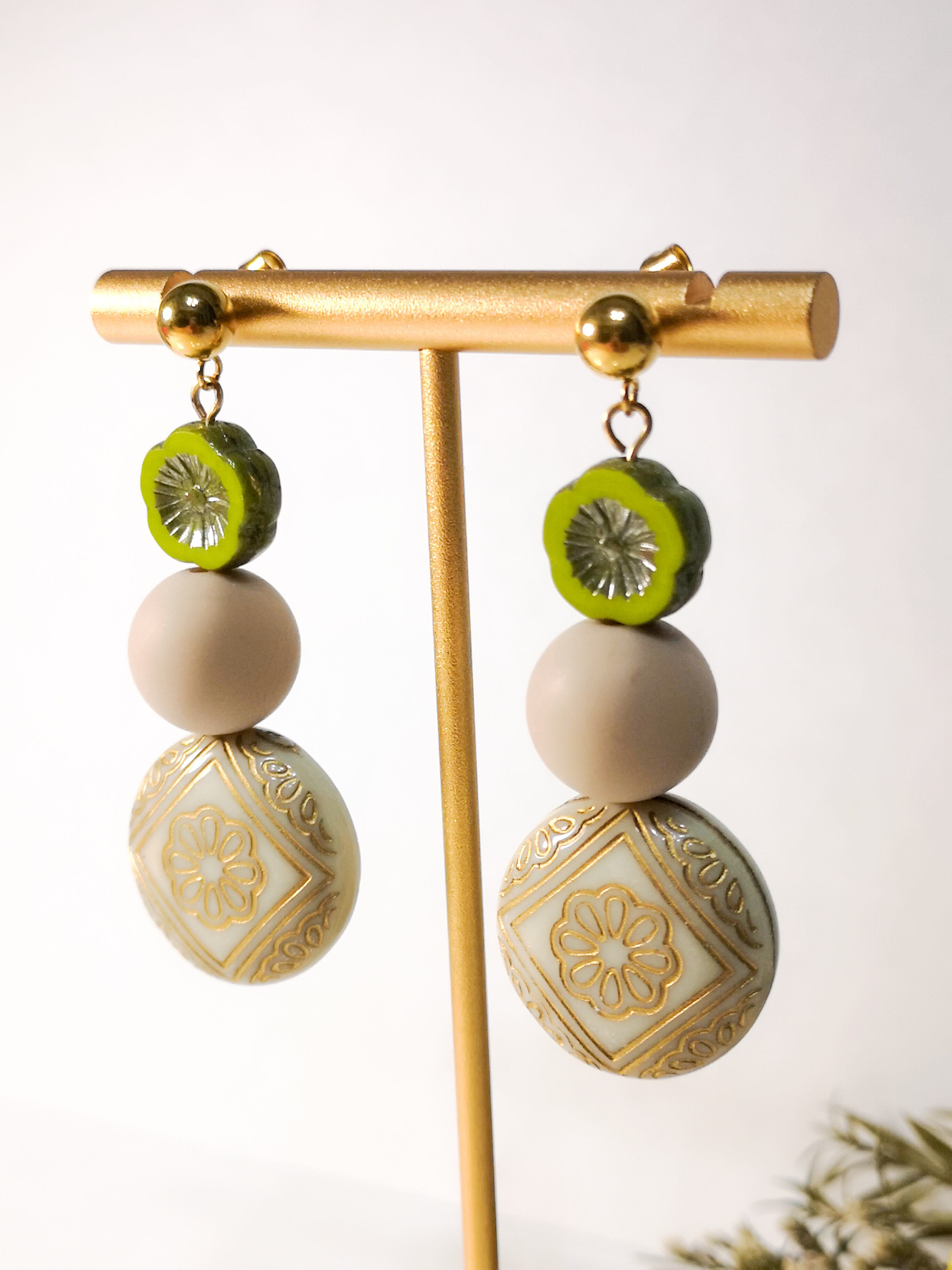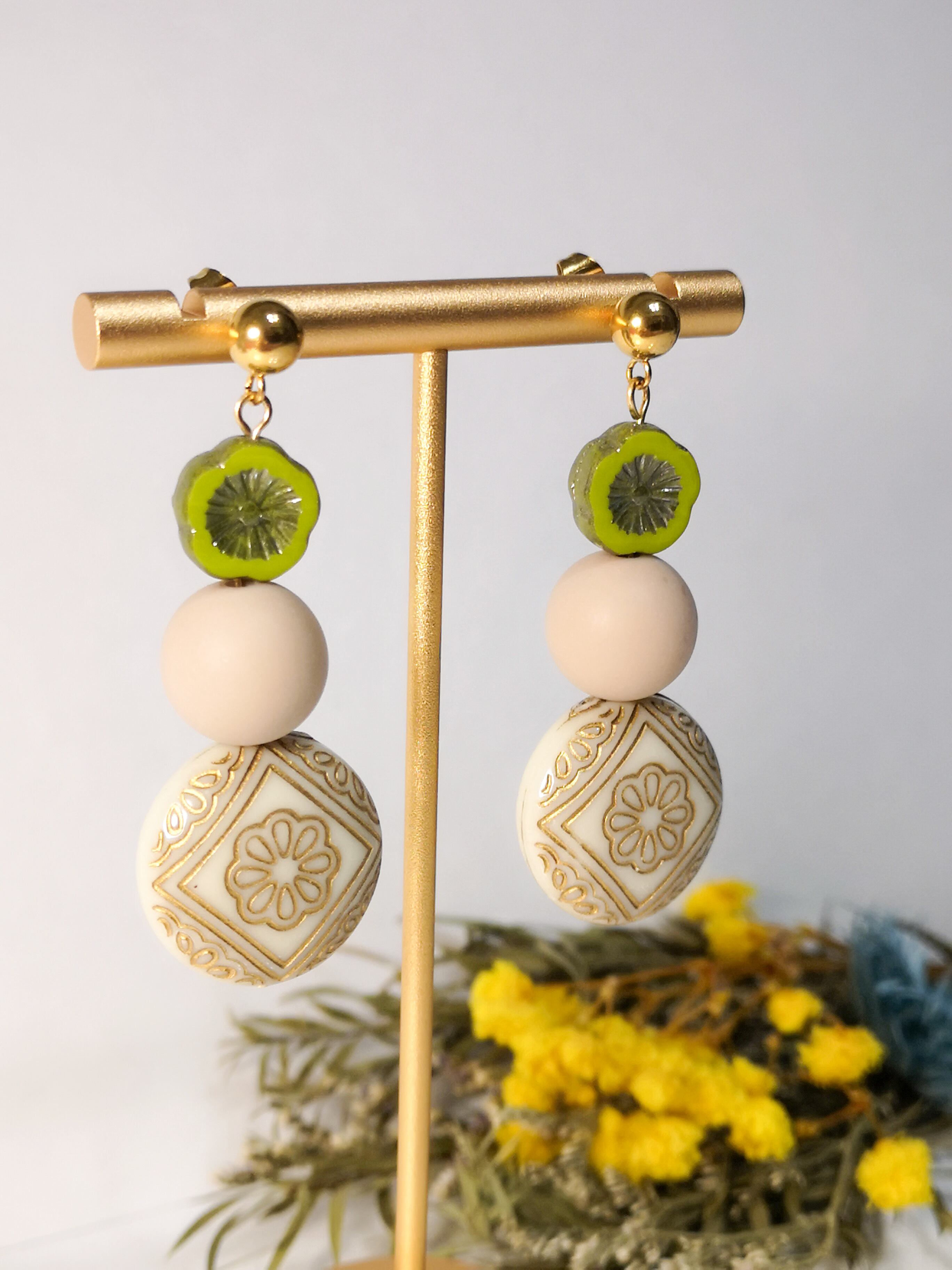 チェコ製のお花のビーズは、両面にカットされた柄と、サイドに施されたコーティングがヴィンテージ感漂うデザインです。デザイン全体にアンティークな雰囲気が漂っていて、シンプルなファッションに華やかさをプラスしてくれます。特別なシーンでもカジュアルな日常使いでも、幅広く活躍してくれること間違いなしです❁︎