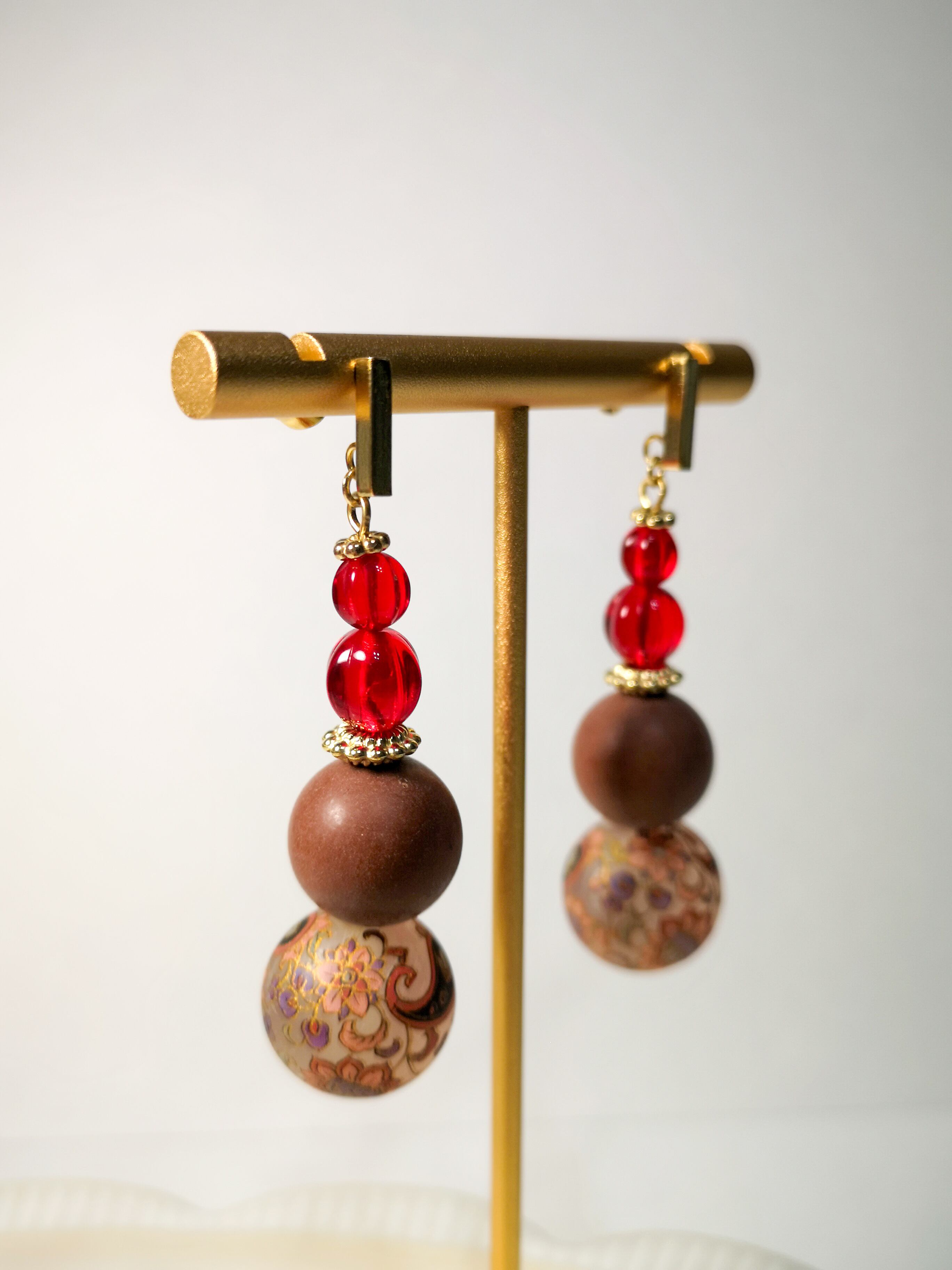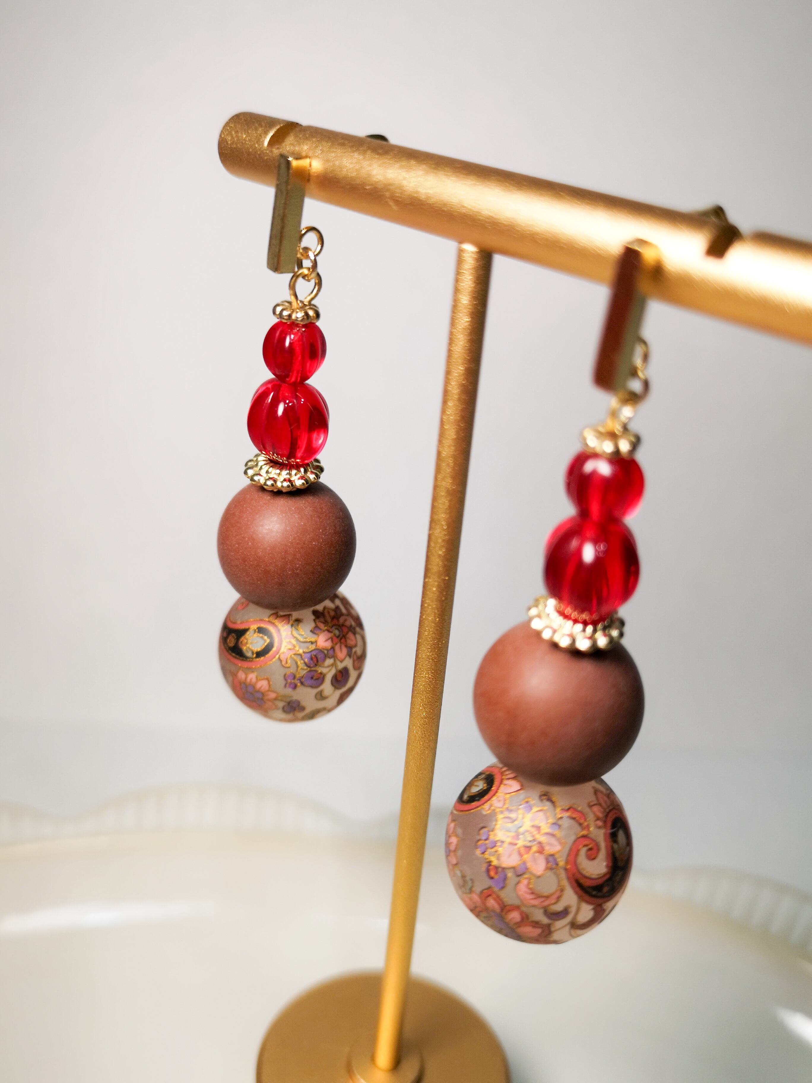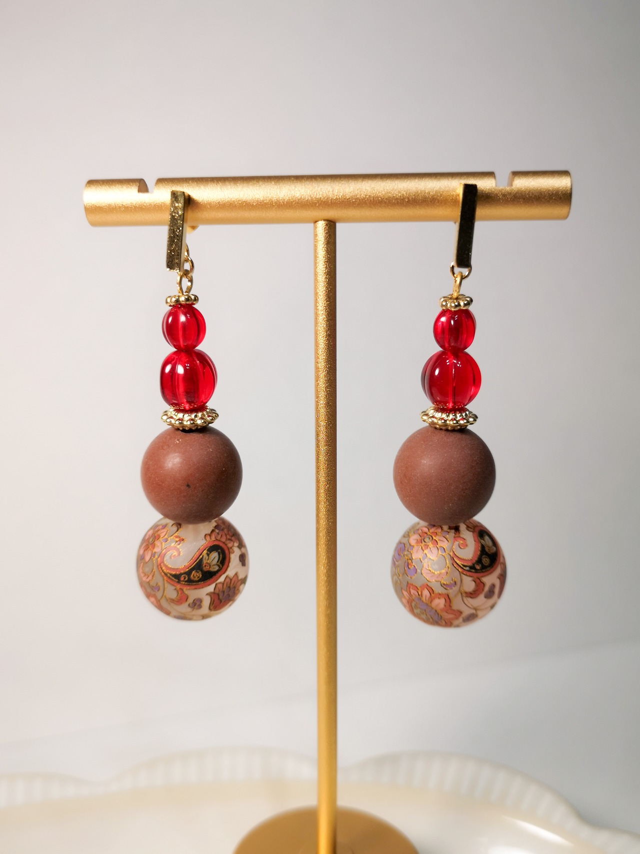 透明度の高いチェコ製の真っ赤なガラスビーズと繊細なペイズリー柄が融合した、魅力溢れるアクセサリーです❁︎
