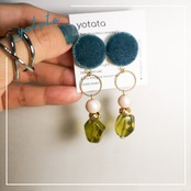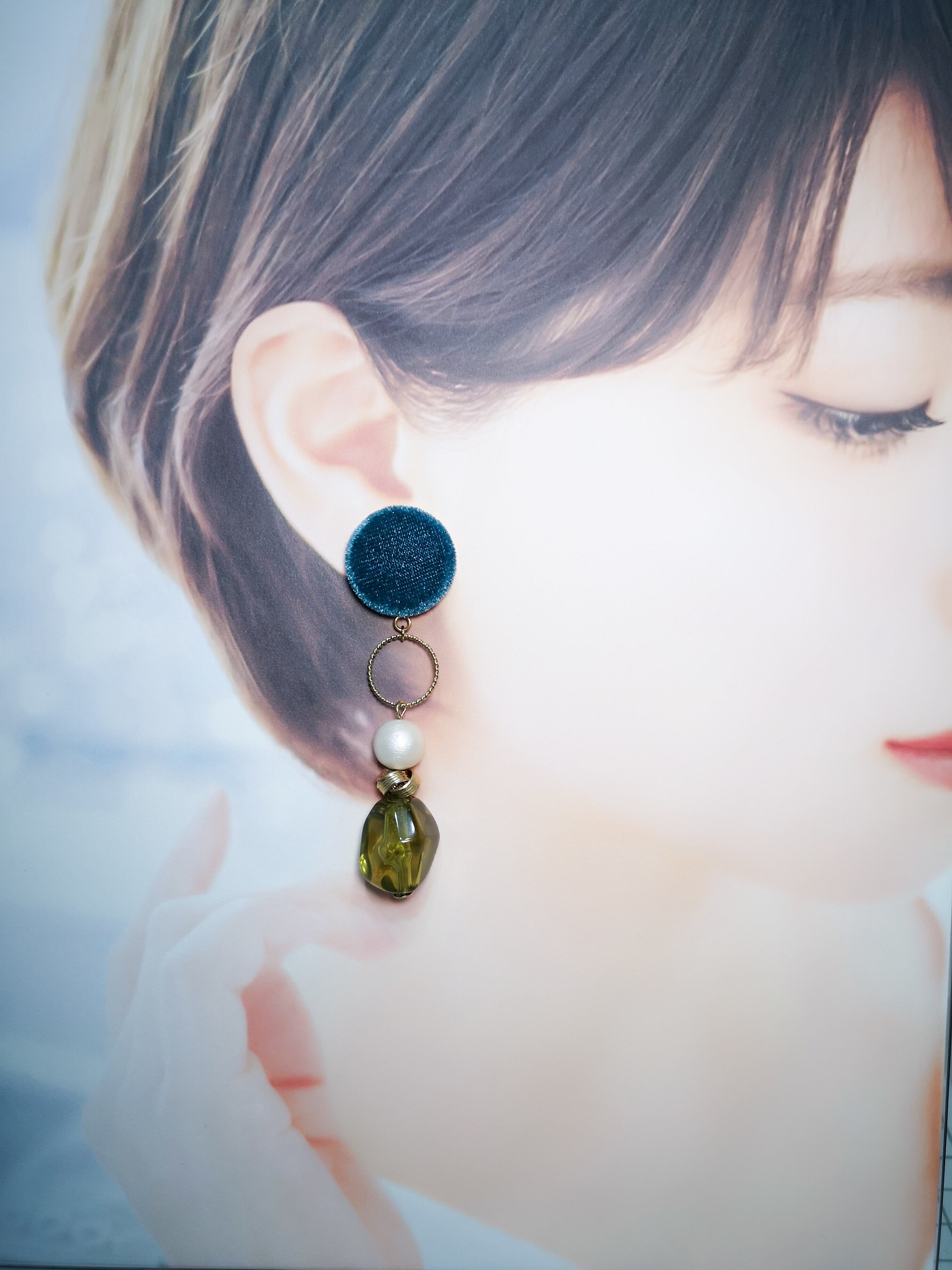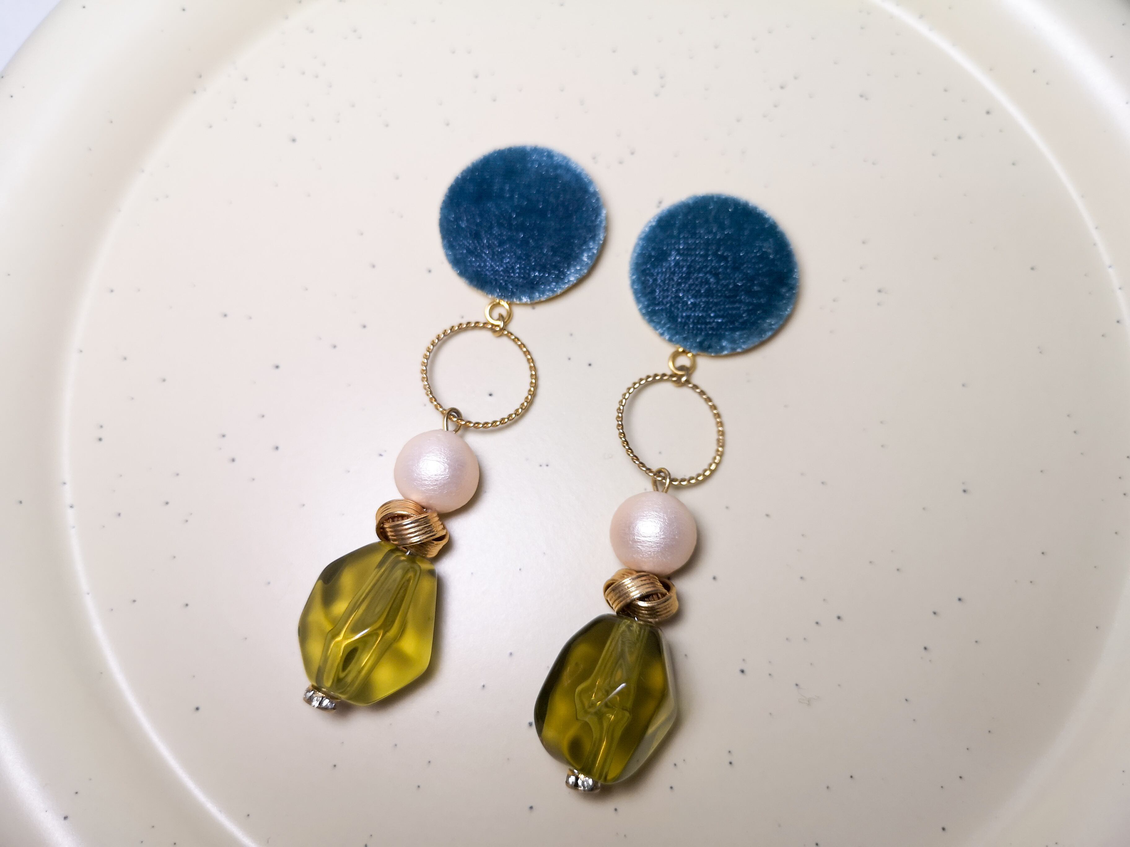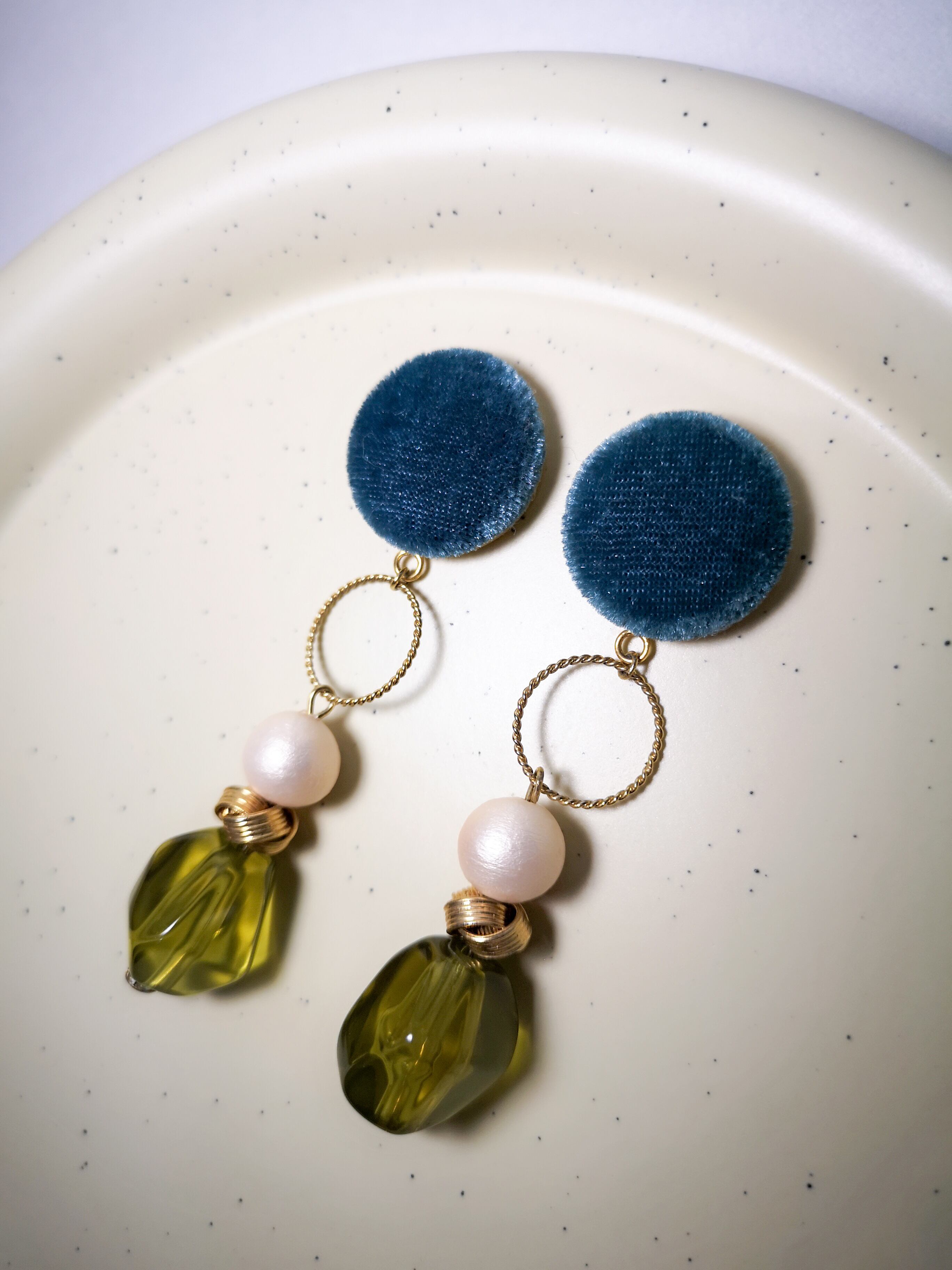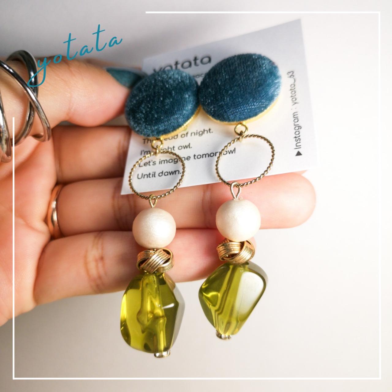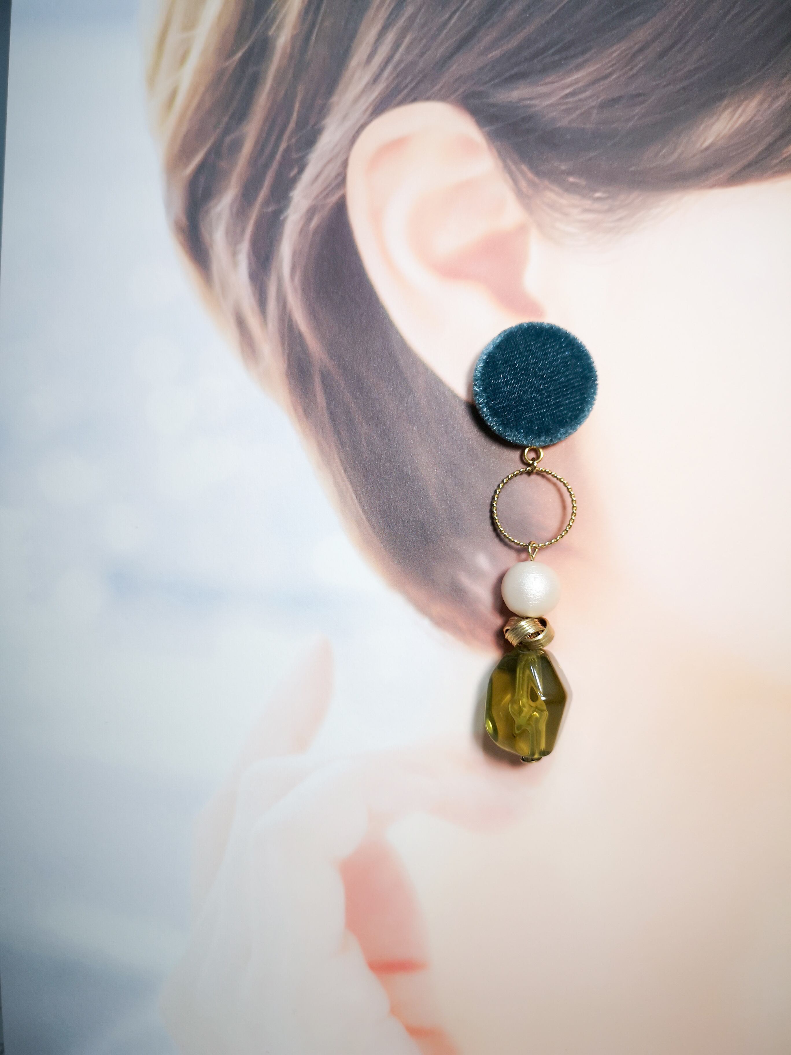 ビリジアンカラーの柔らかなベルベットボタンと清楚なコットンパール、ドイツ製のグリーンの変形アクリルパーツを使用した一点物の特別なアクセサリーです❁︎