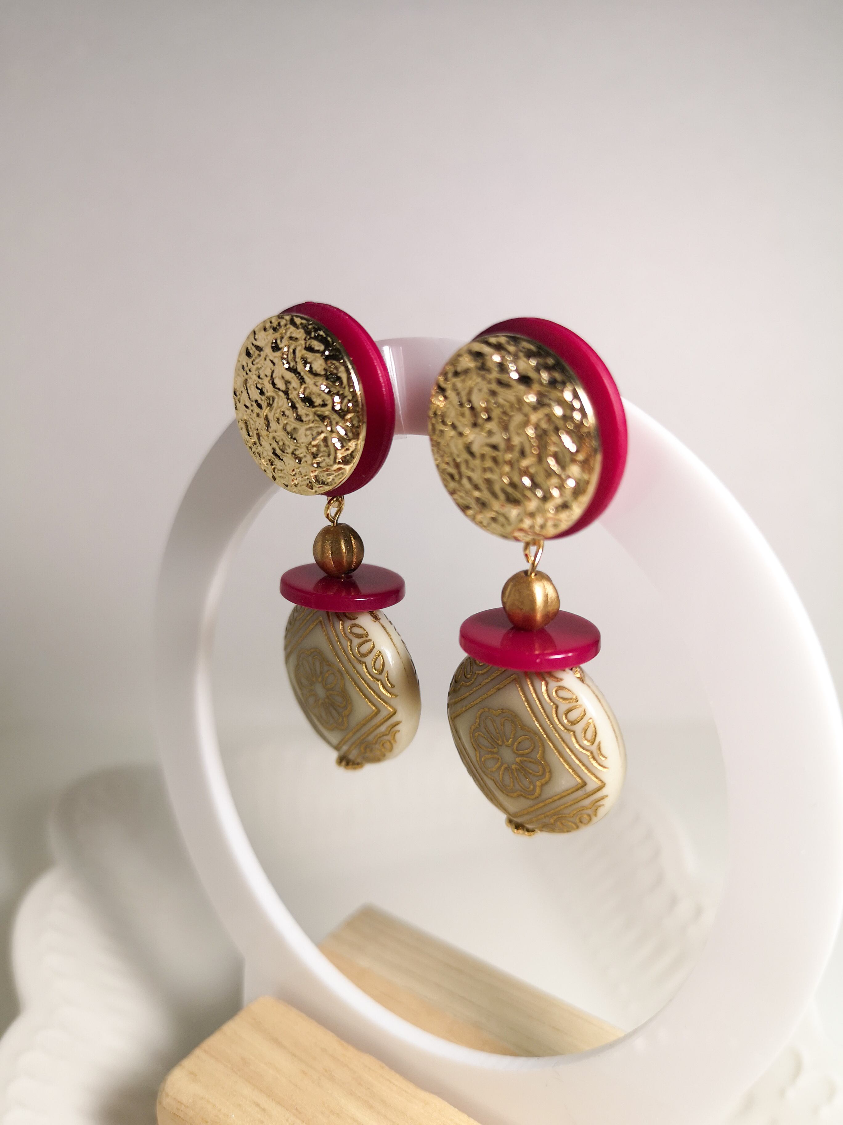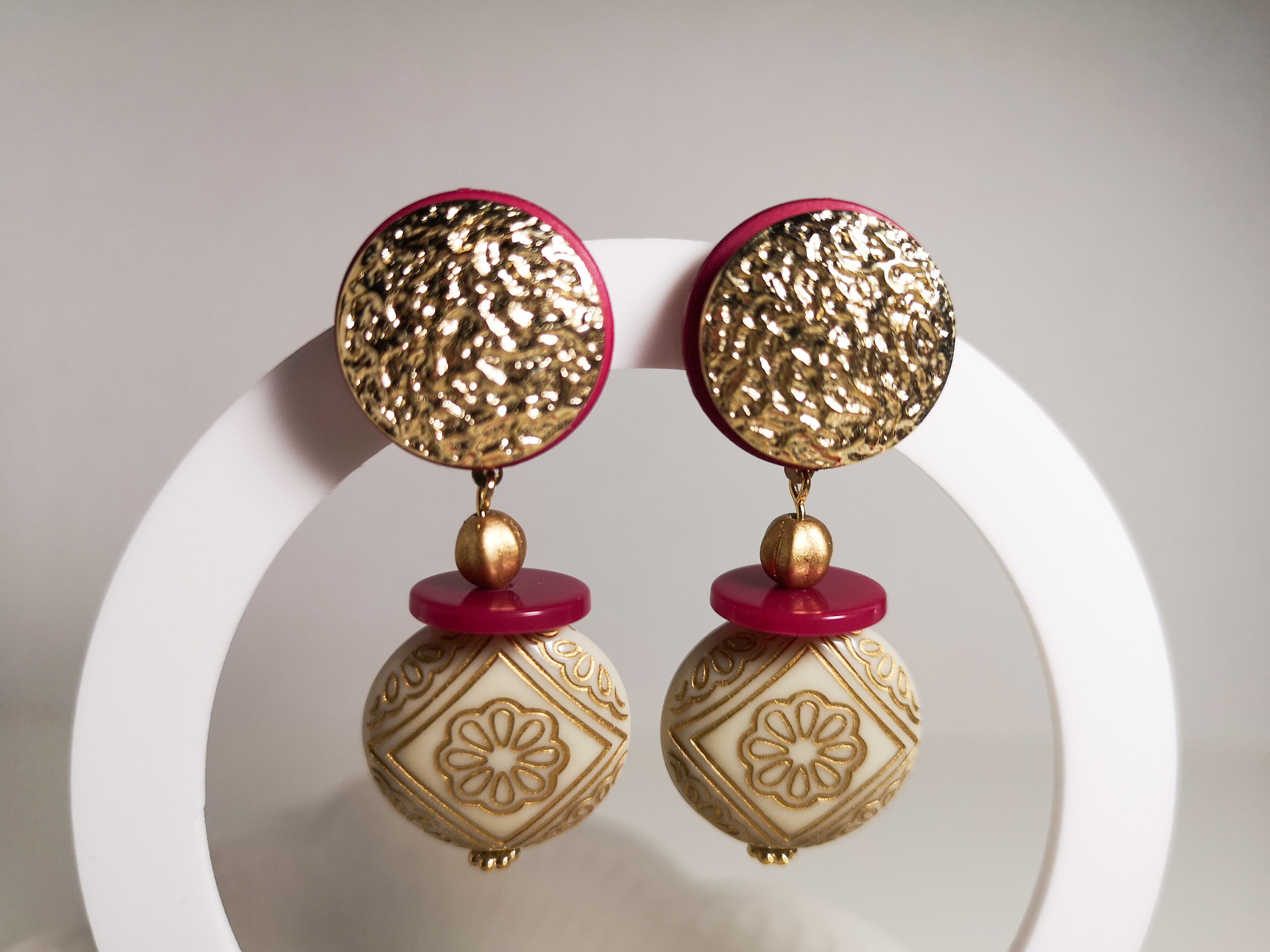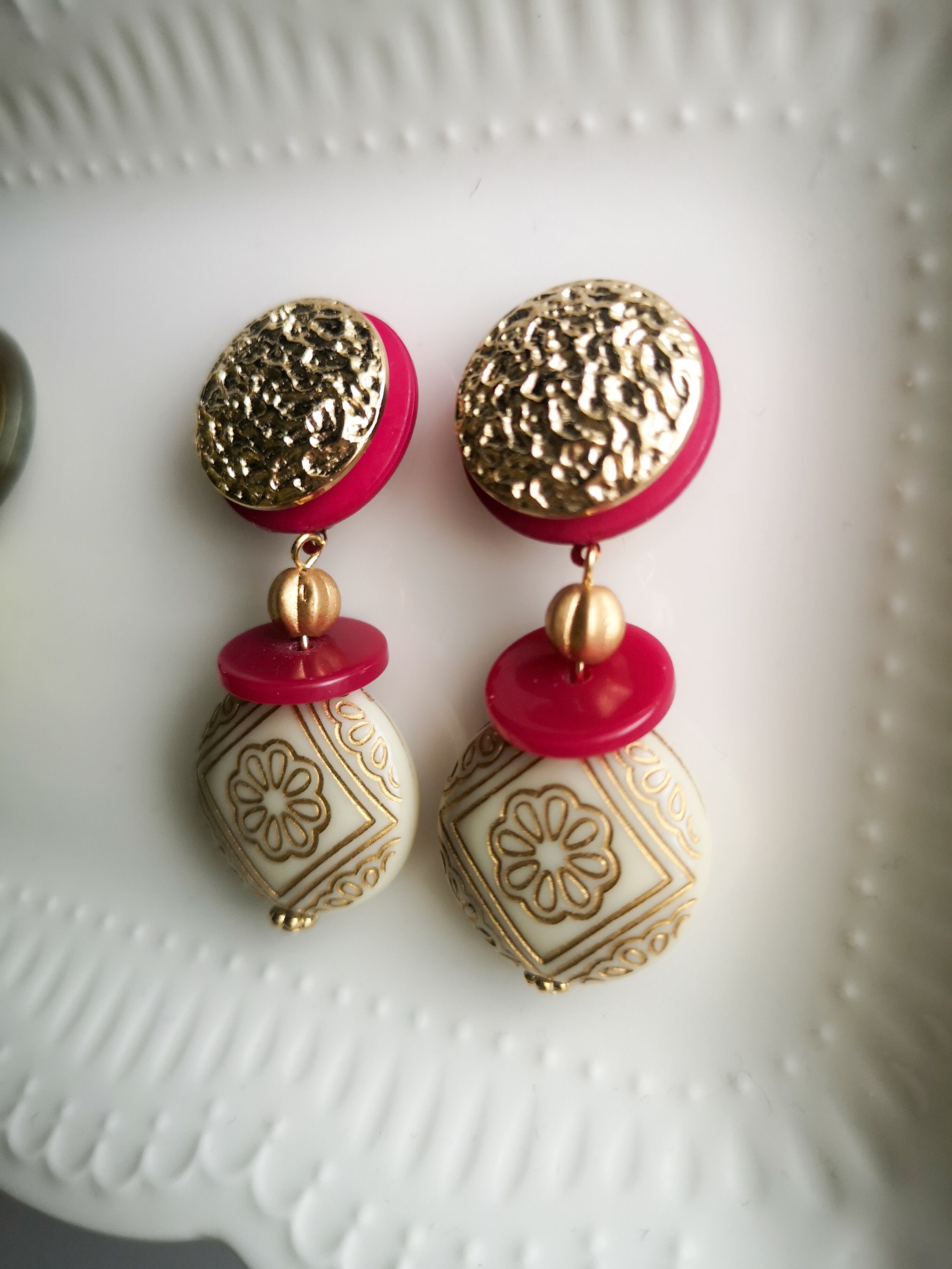 ゴールド×レッドの個性的なヴィンテージボタンとドイツ製の美しいアクリルパーツを使用した一点限りの特別なアクセサリーです!