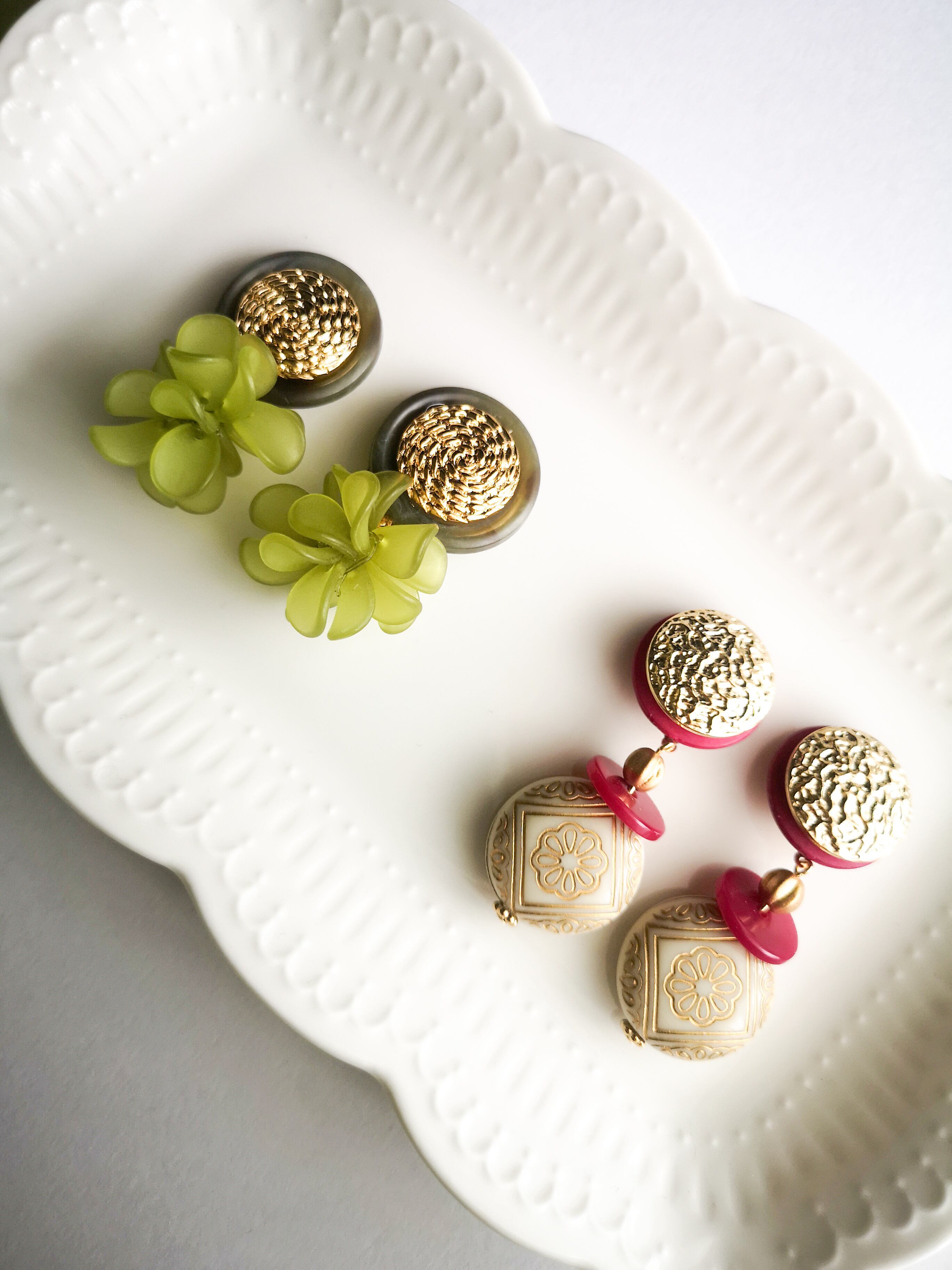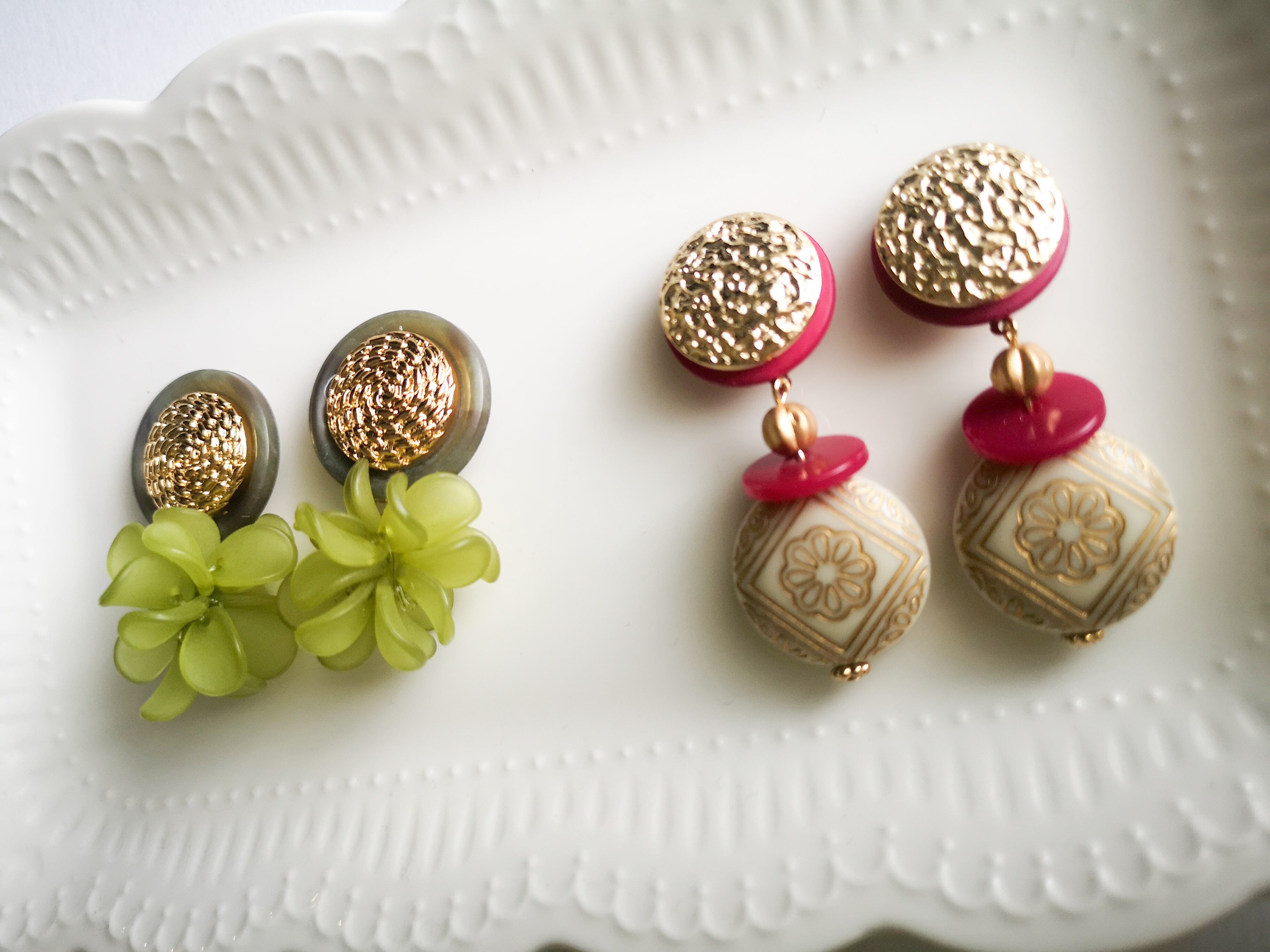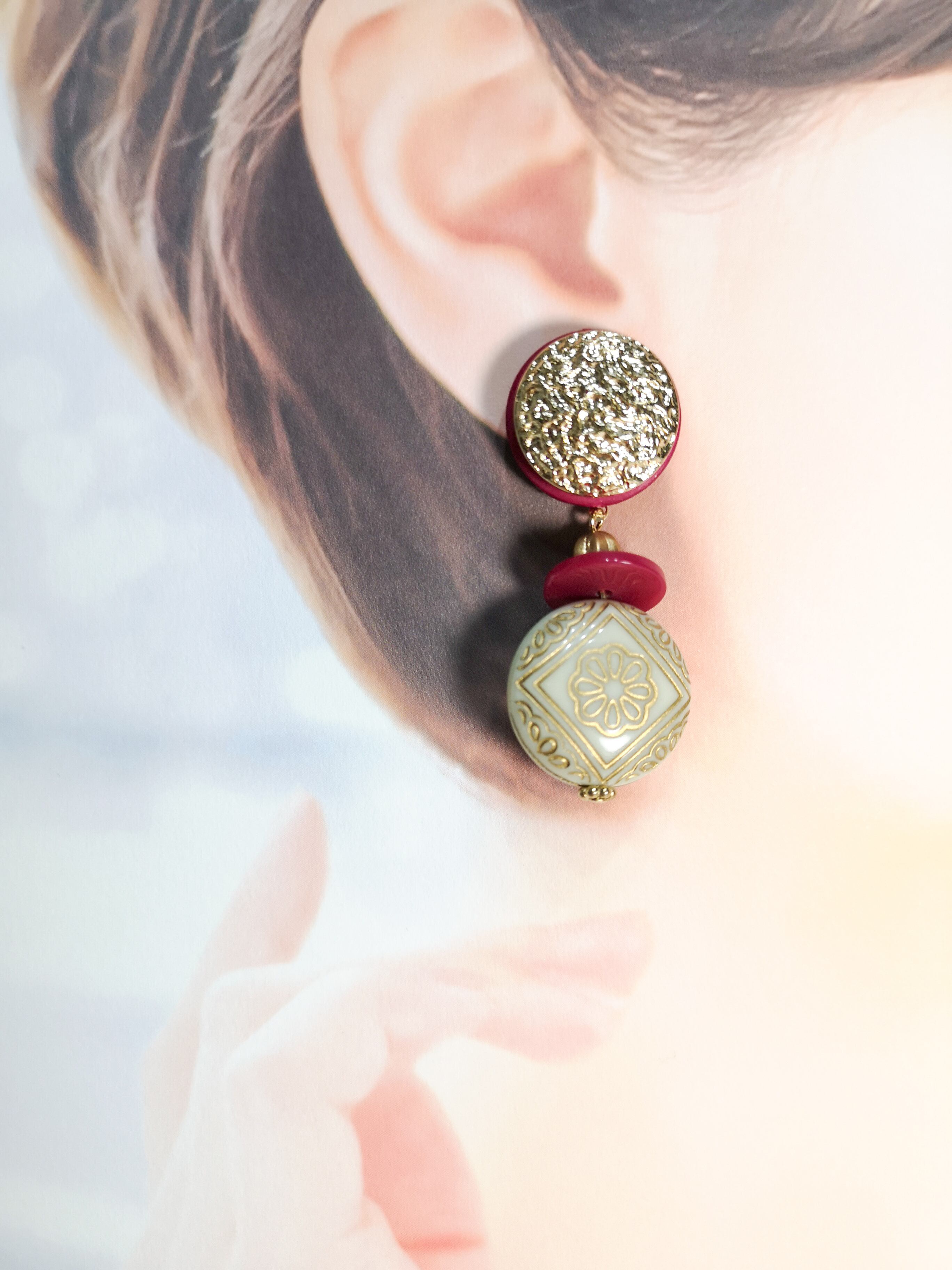 古き良き時代の香り漂うヴィンテージボタンが、耳元で華やかさを演出します。