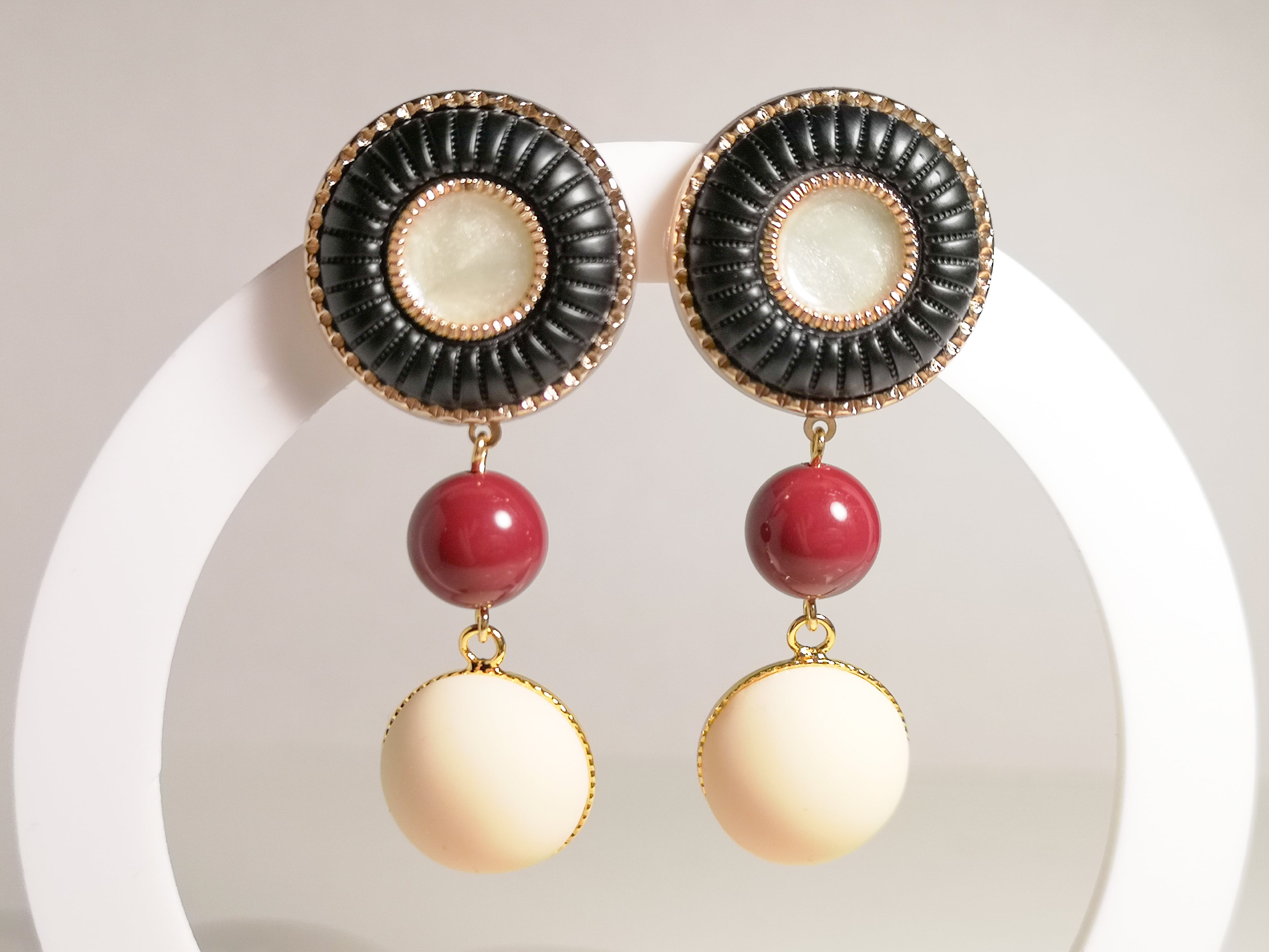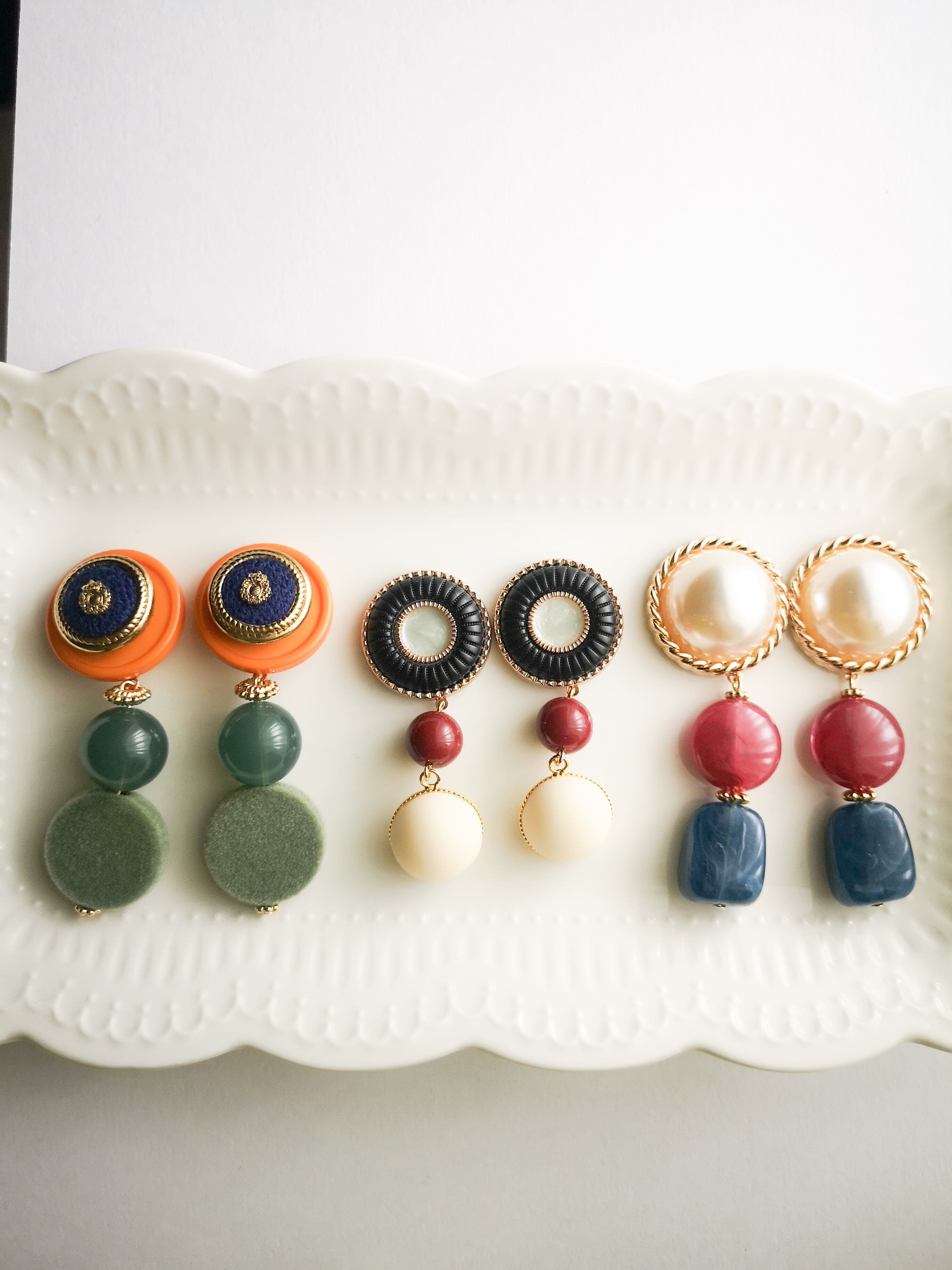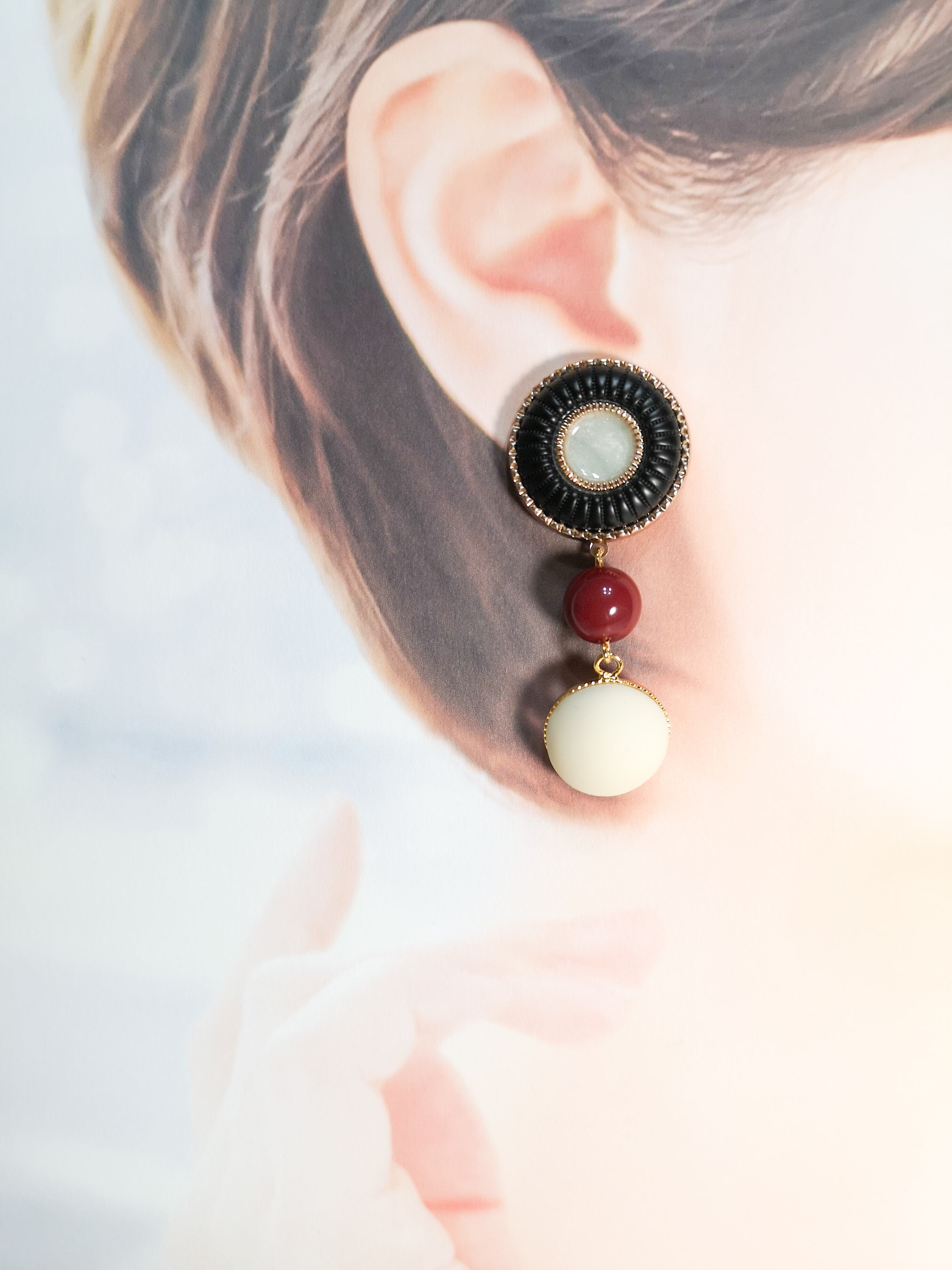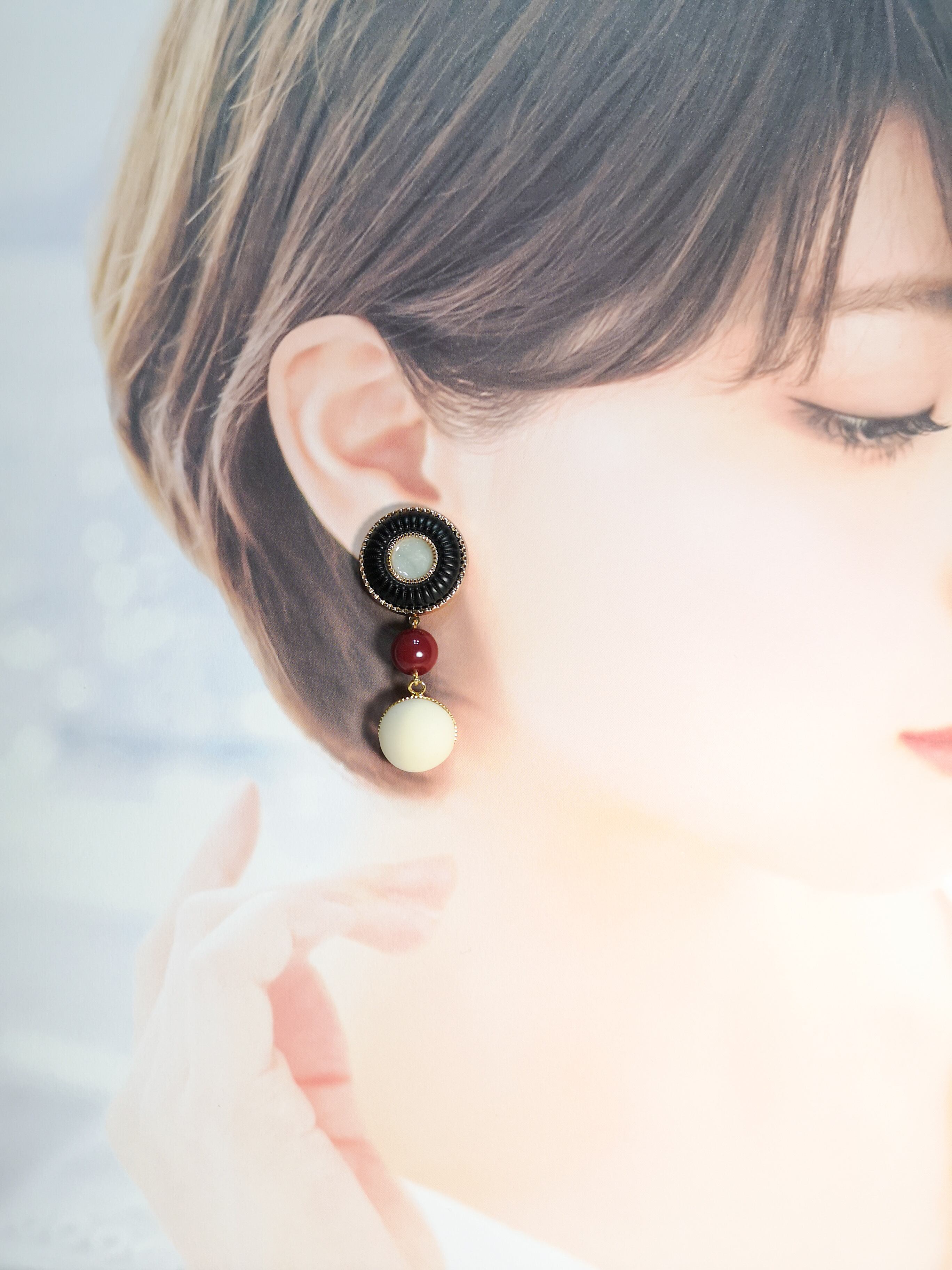 レッドベルベットの柔らかな色味が耳元で華やかに揺れ、ヴィンテージボタンのクラシカルな印象が相まって、一際エレガントな存在感を放ちます。