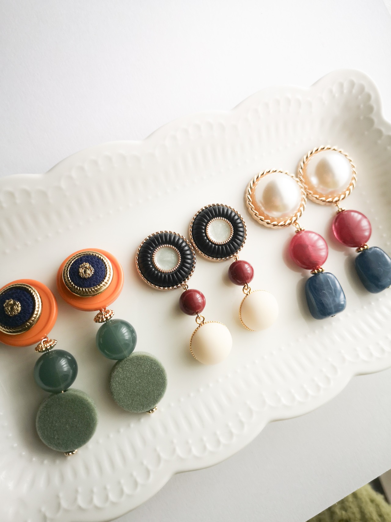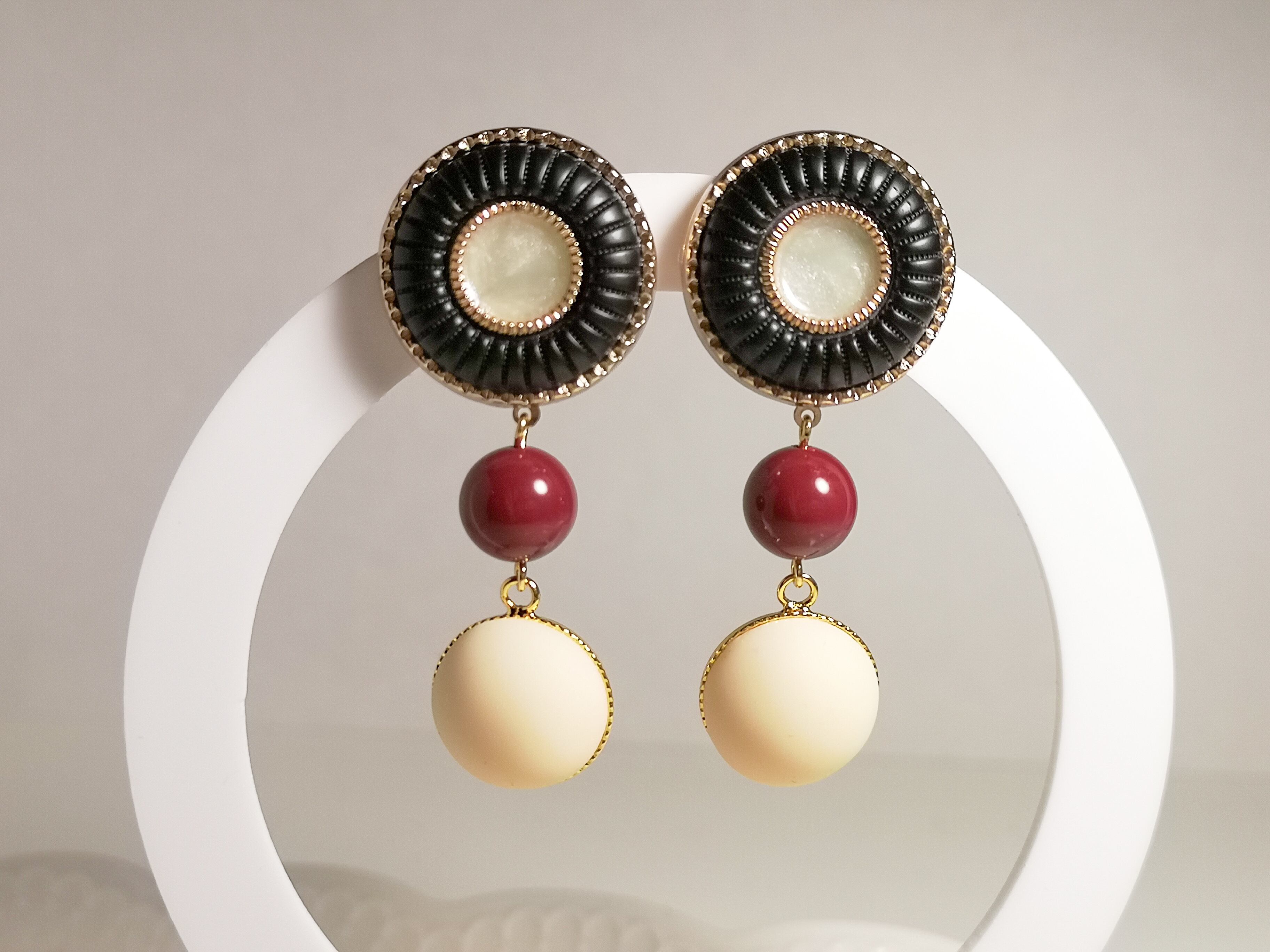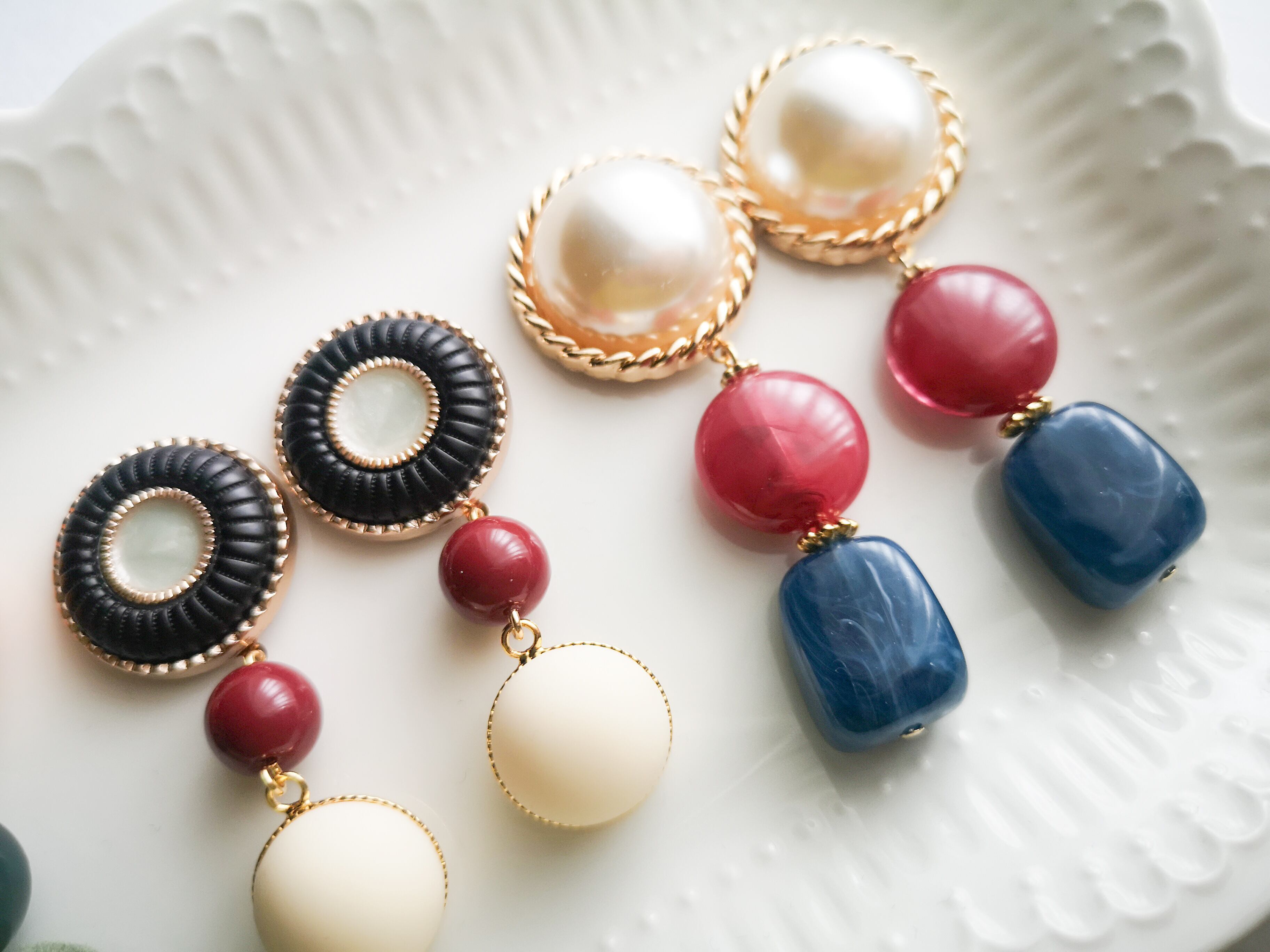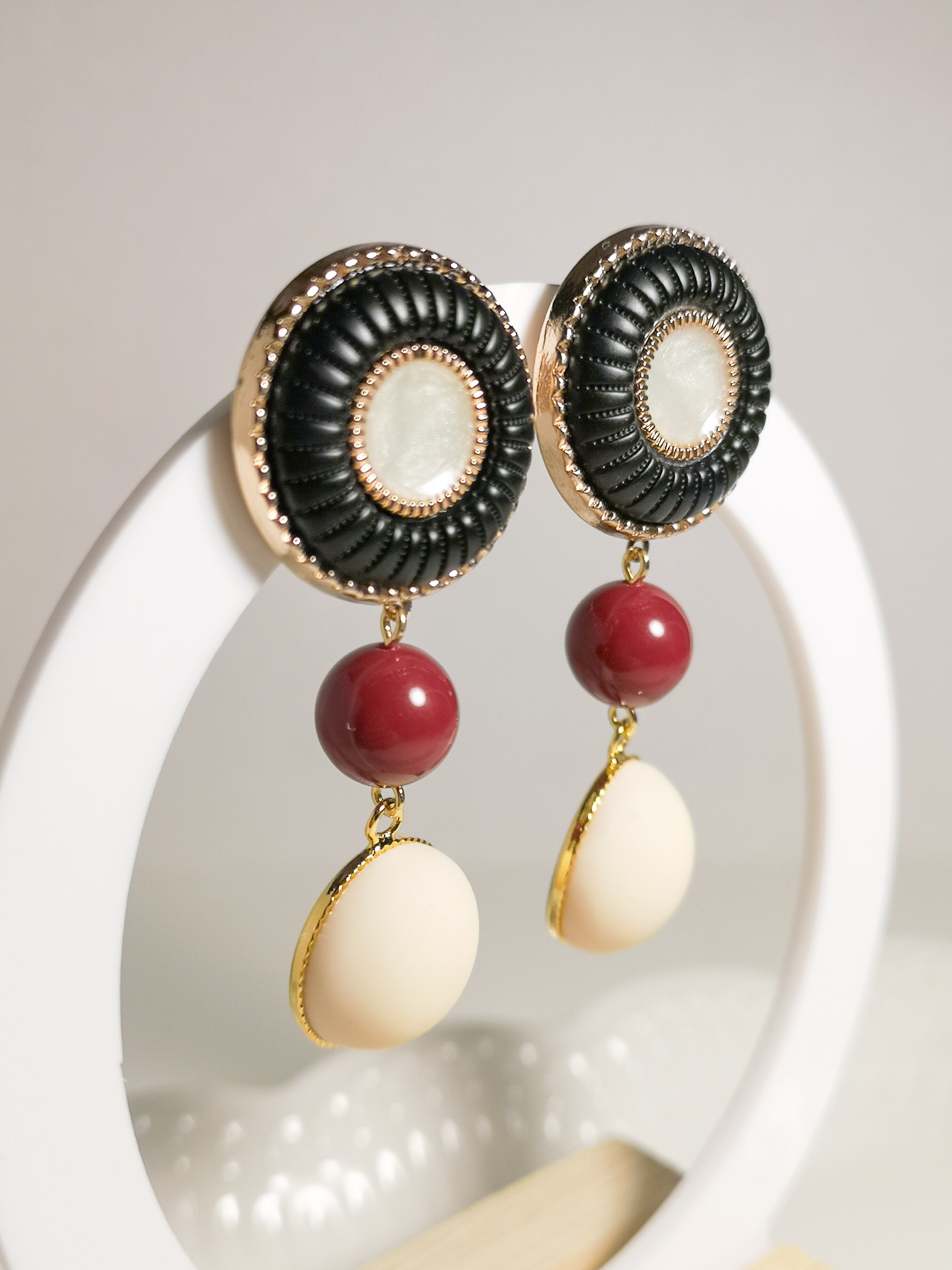 レッドベルベットの柔らかな色味が耳元で華やかに揺れ、ヴィンテージボタンのクラシカルな印象が相まって、一際エレガントな存在感を放ちます。