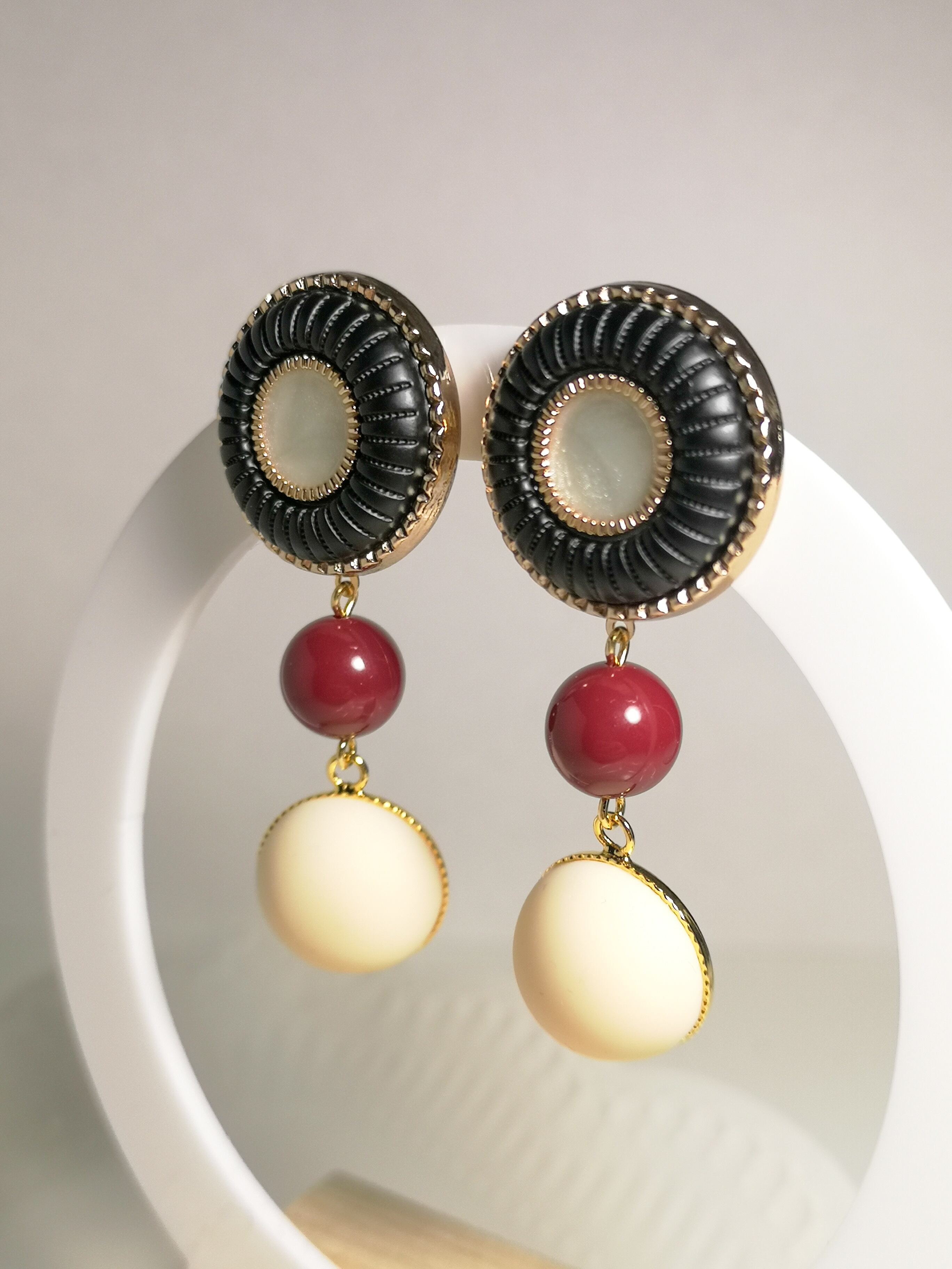 魅力的なヴィンテージの丸ボタンと深みのあるレッドベルベットカラーのドイツ製アンティークビーズを使用した独特のデザインのアクセサリーです❁︎