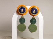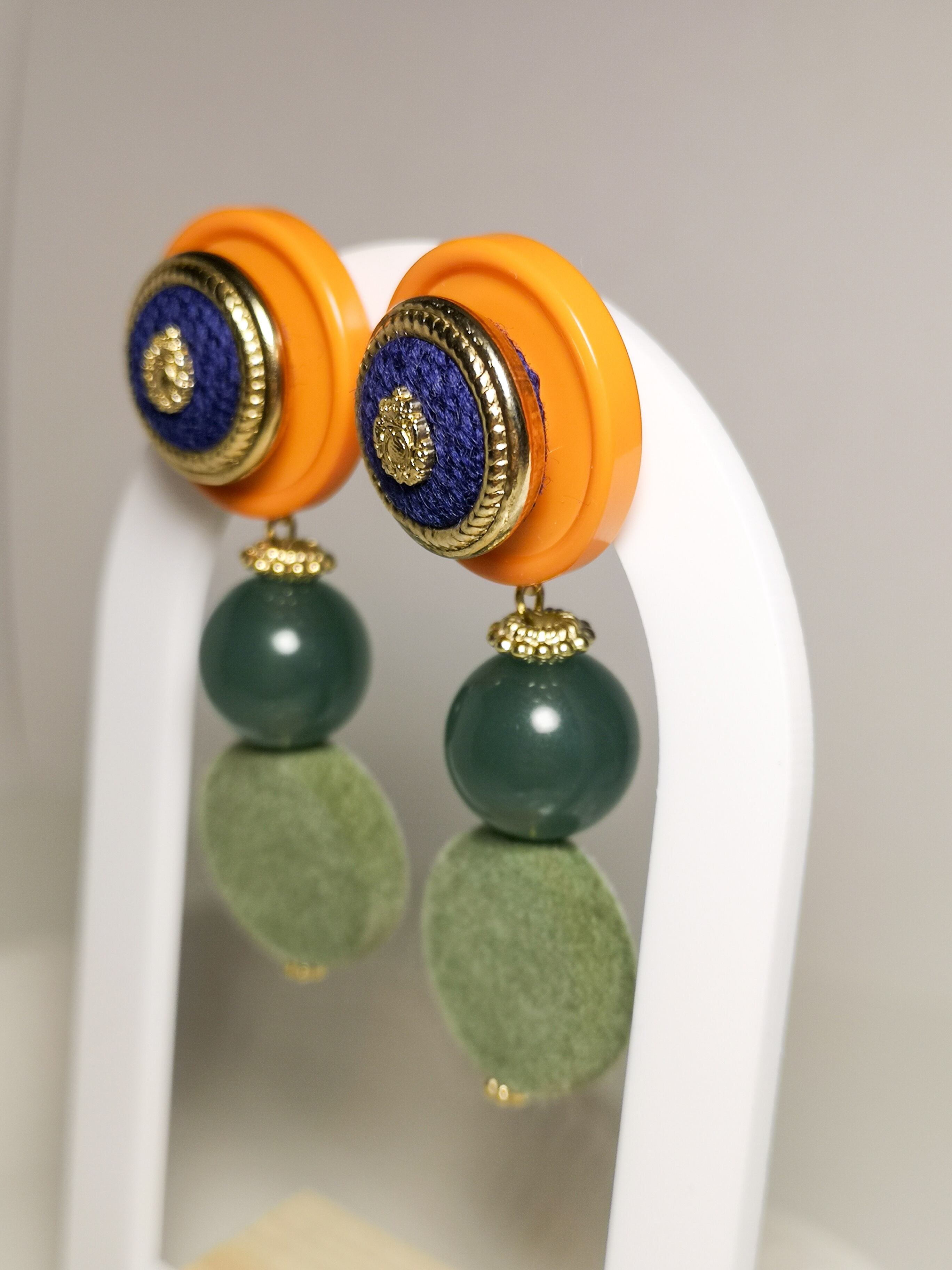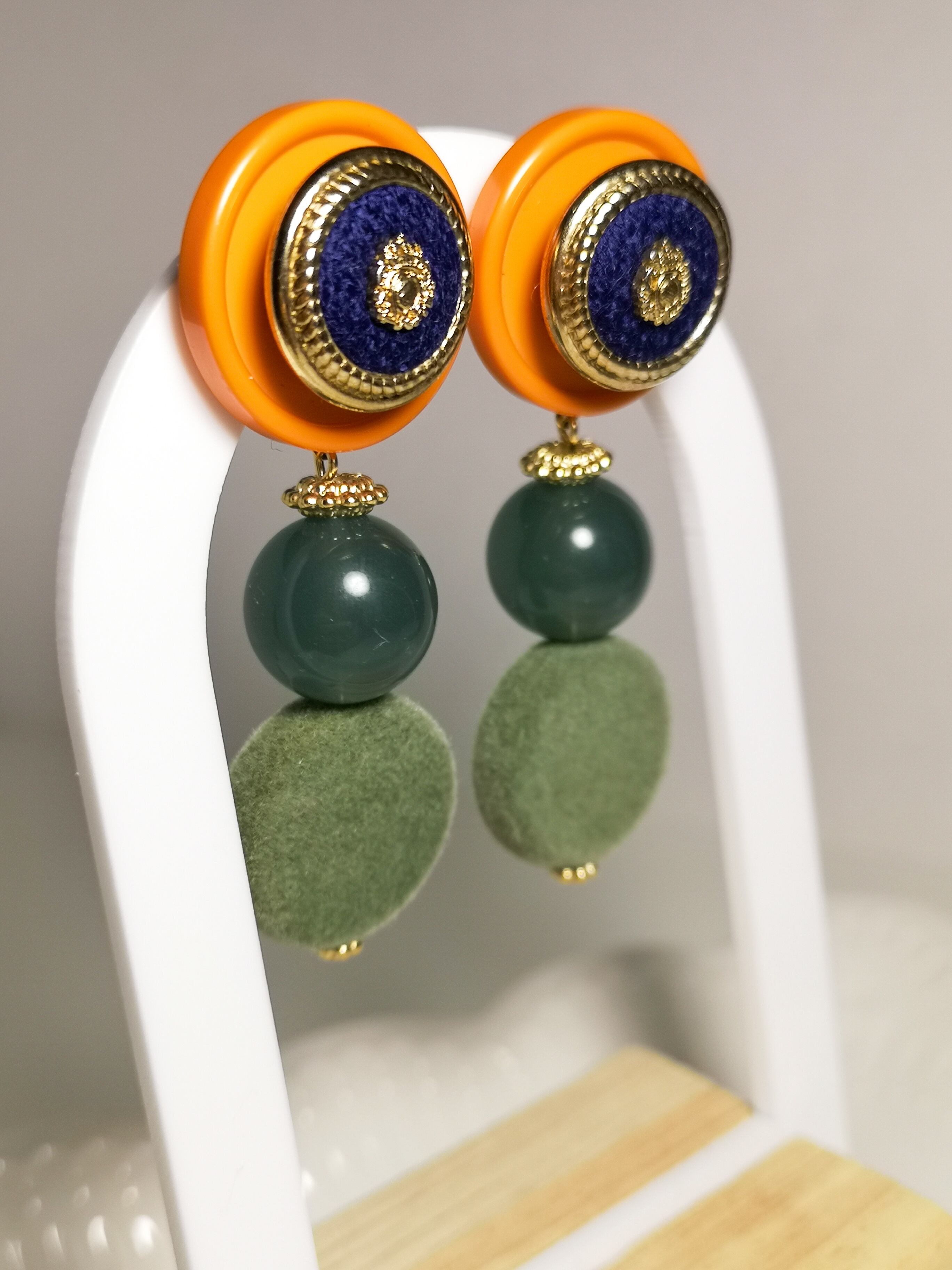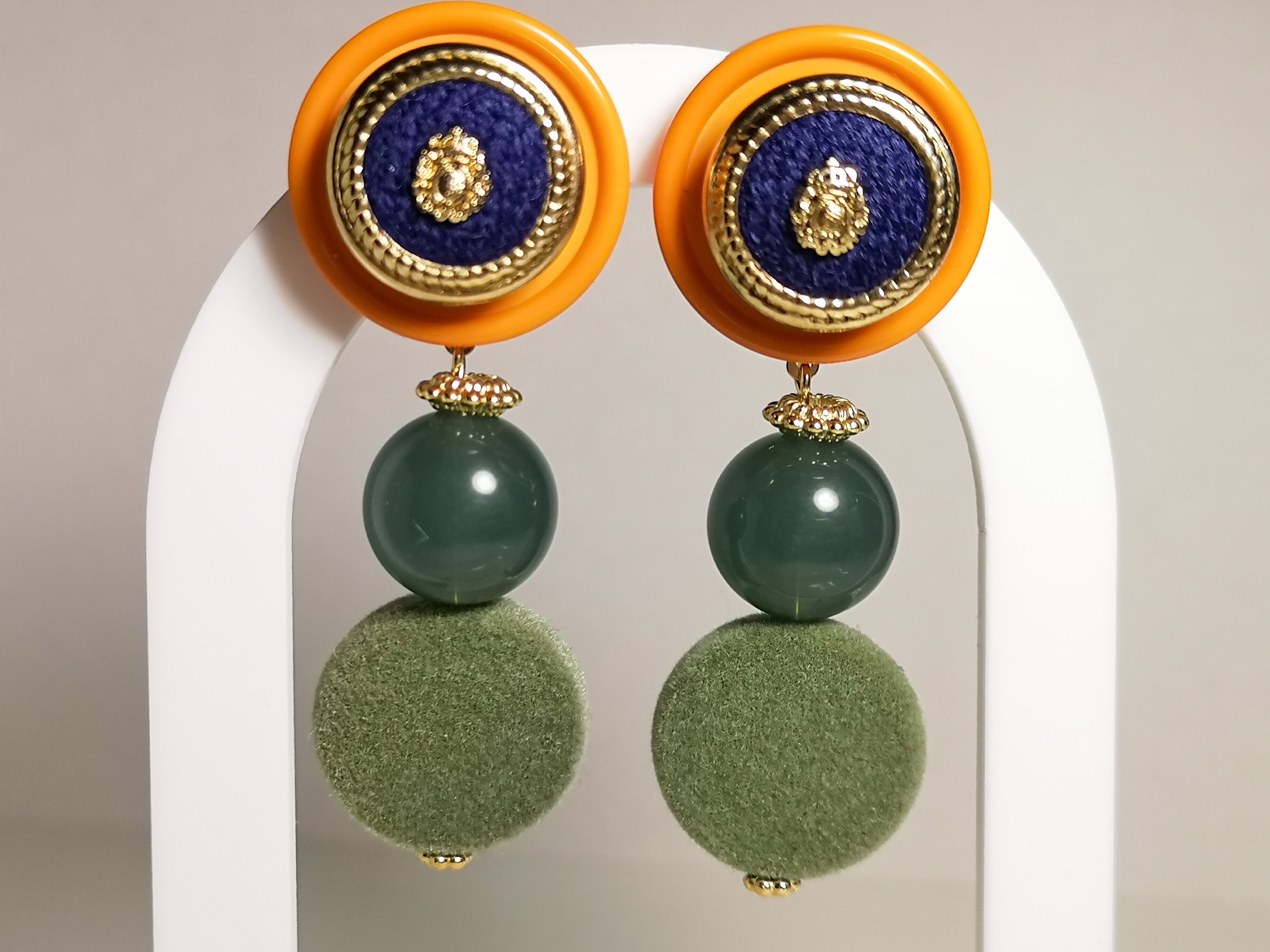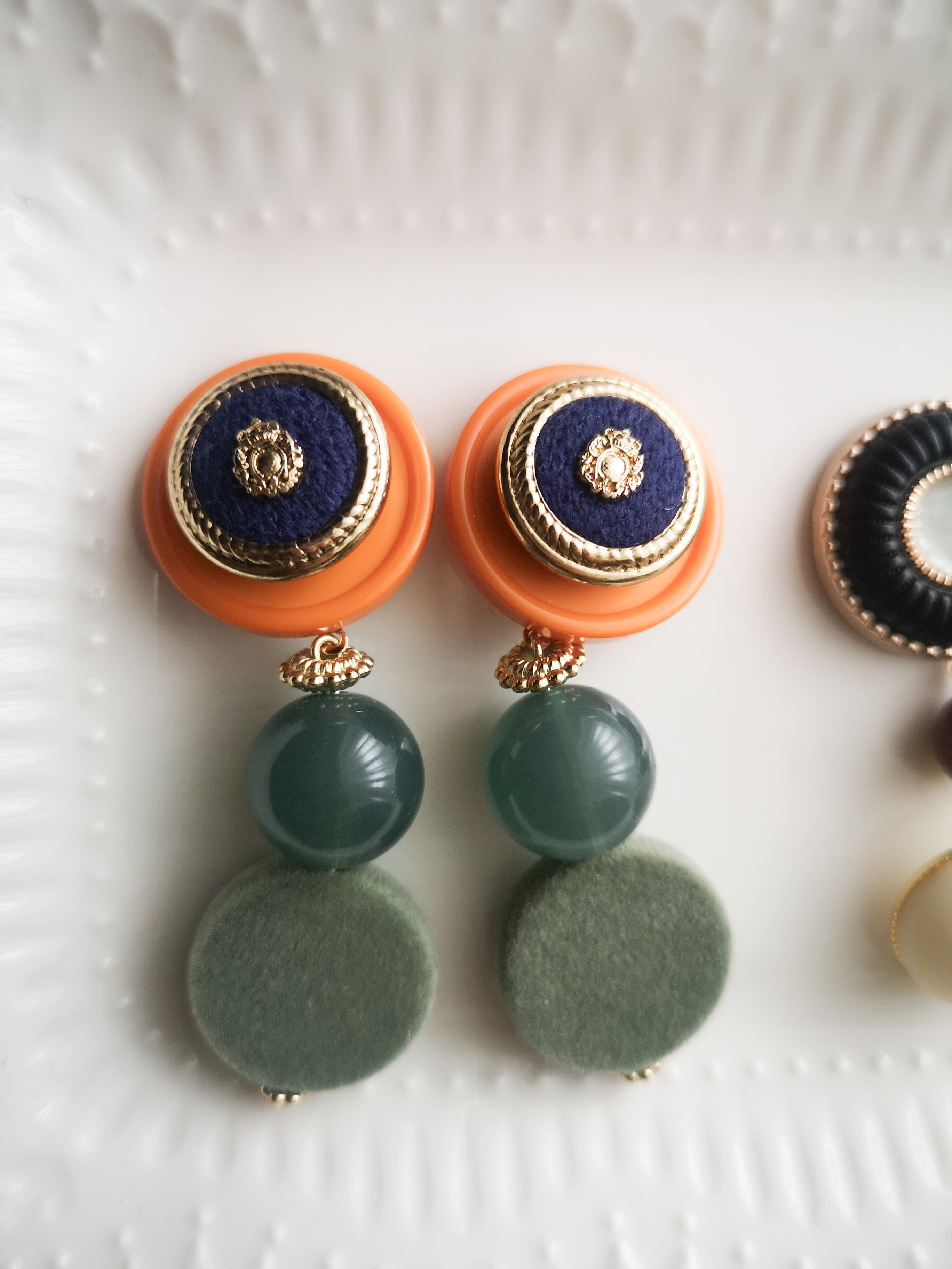 No.21オレンジヴィンテージボタン×ベロアグリーンのアンティークピアス&イヤリングは、魅力的なオレンジ色のヴィンテージボタンと深いベロアグリーンのパーツを使用した、レトロ感溢れる個性的なアクセサリーです❁︎