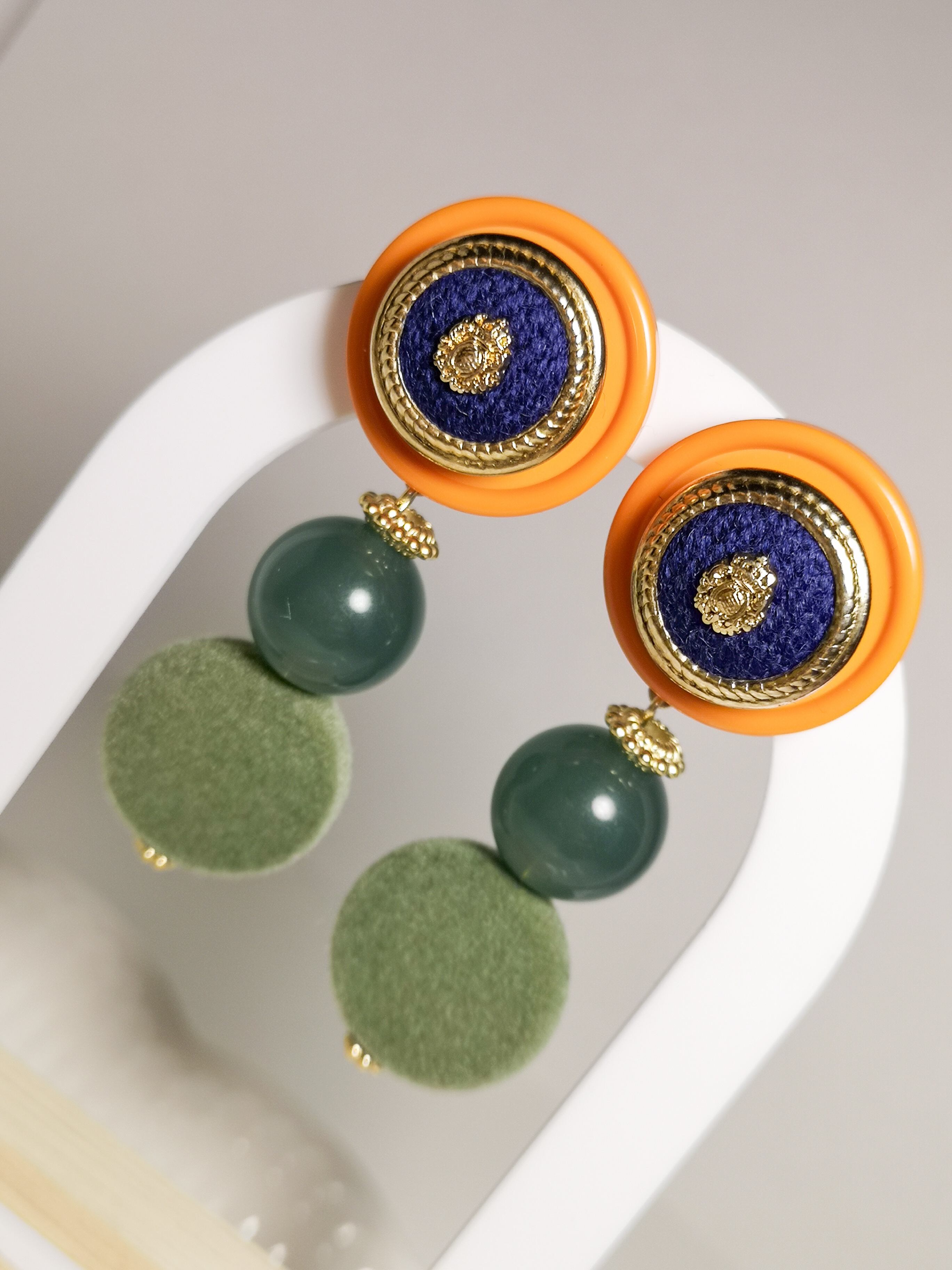 温かみのあるオレンジが優しく耳元を彩り、グリーンのドイツ製のアクリルと柔らかいベロアが洗練された印象を与えます。カジュアルな装いにも、フォーマルなシーンにもマッチし、幅広いスタイルでお楽しみいただけます。