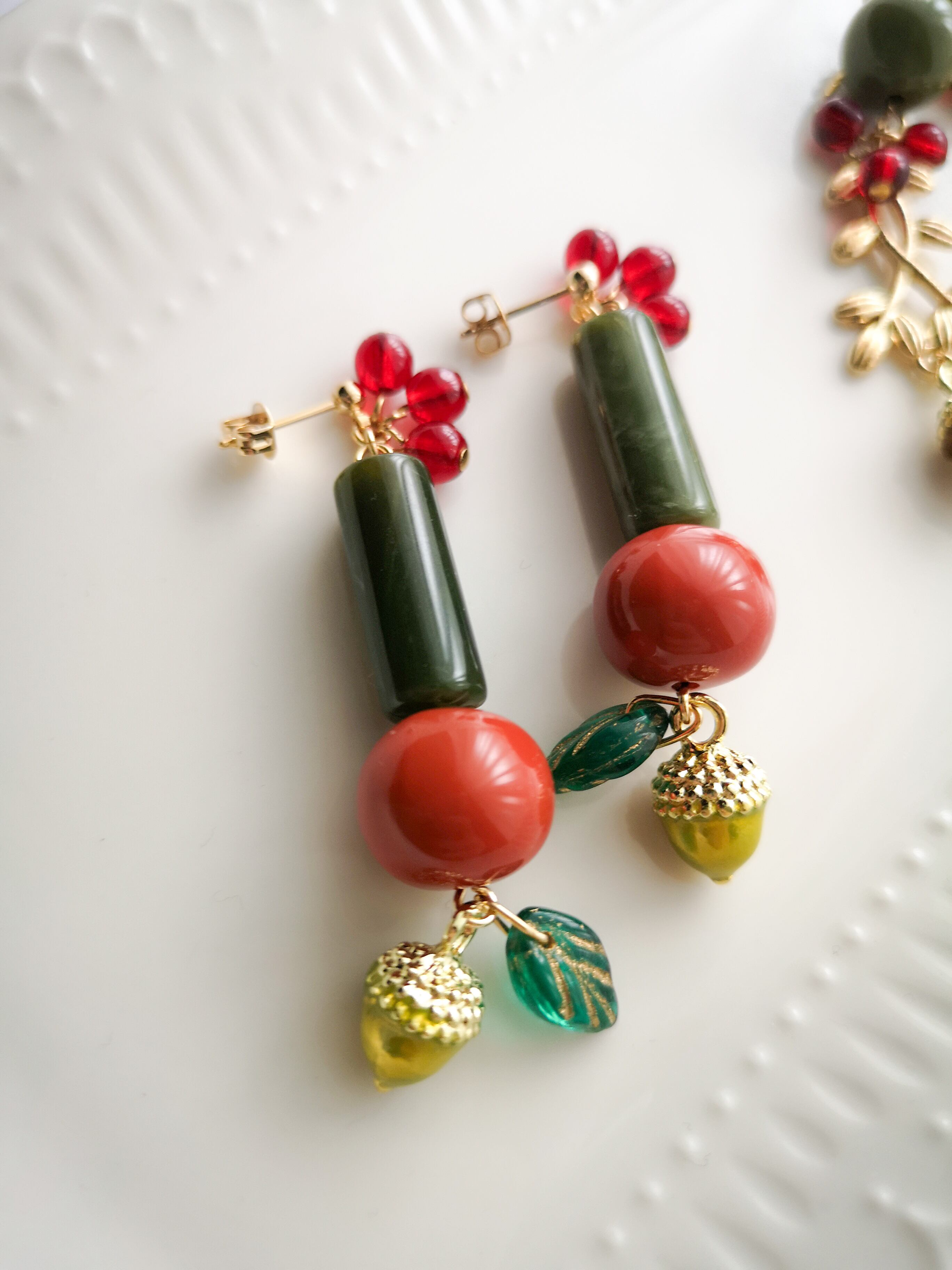 どんぐりのモチーフと真っ赤な木の実をイメージしたチェコ製のガラスを使用しています。