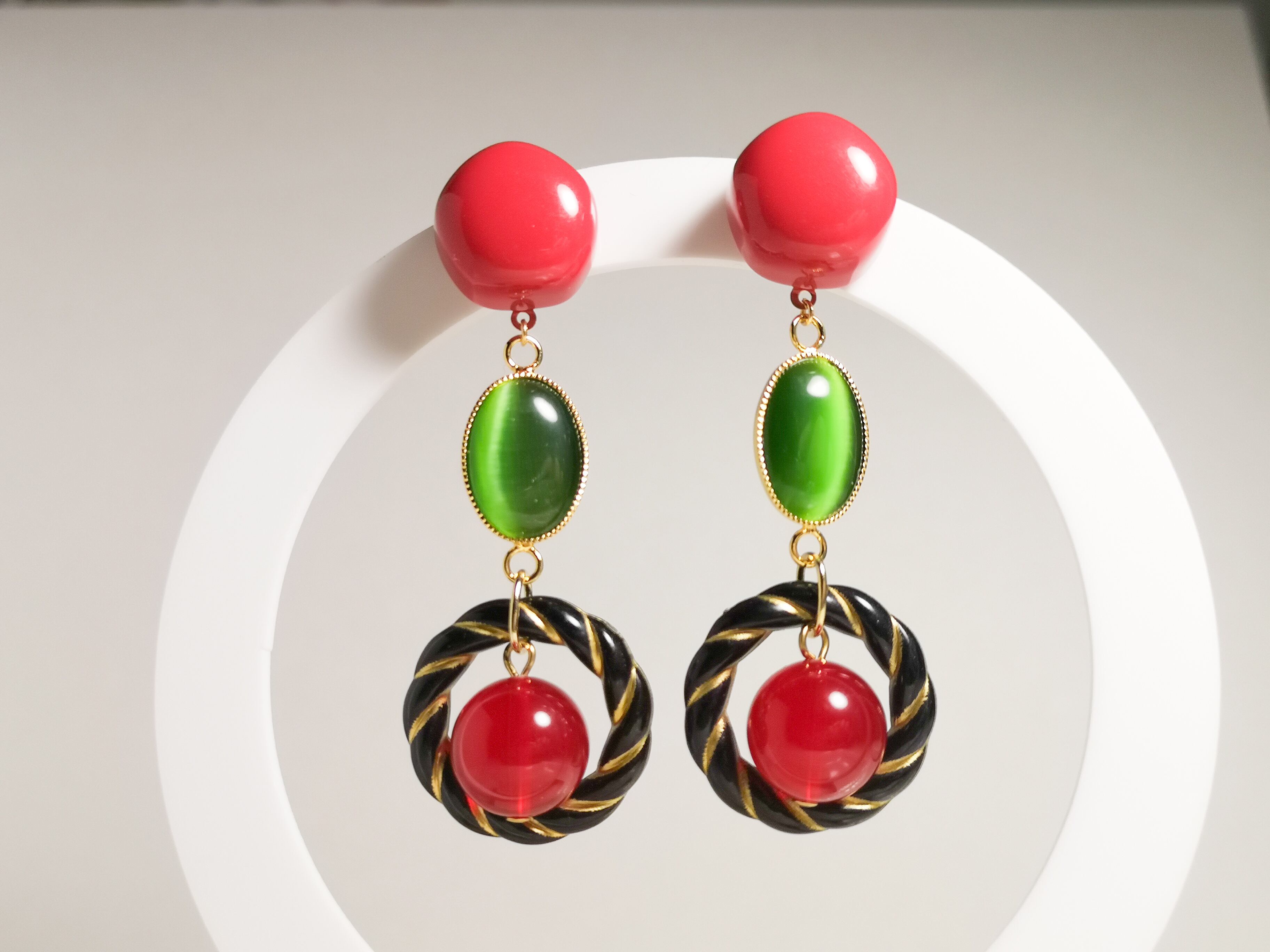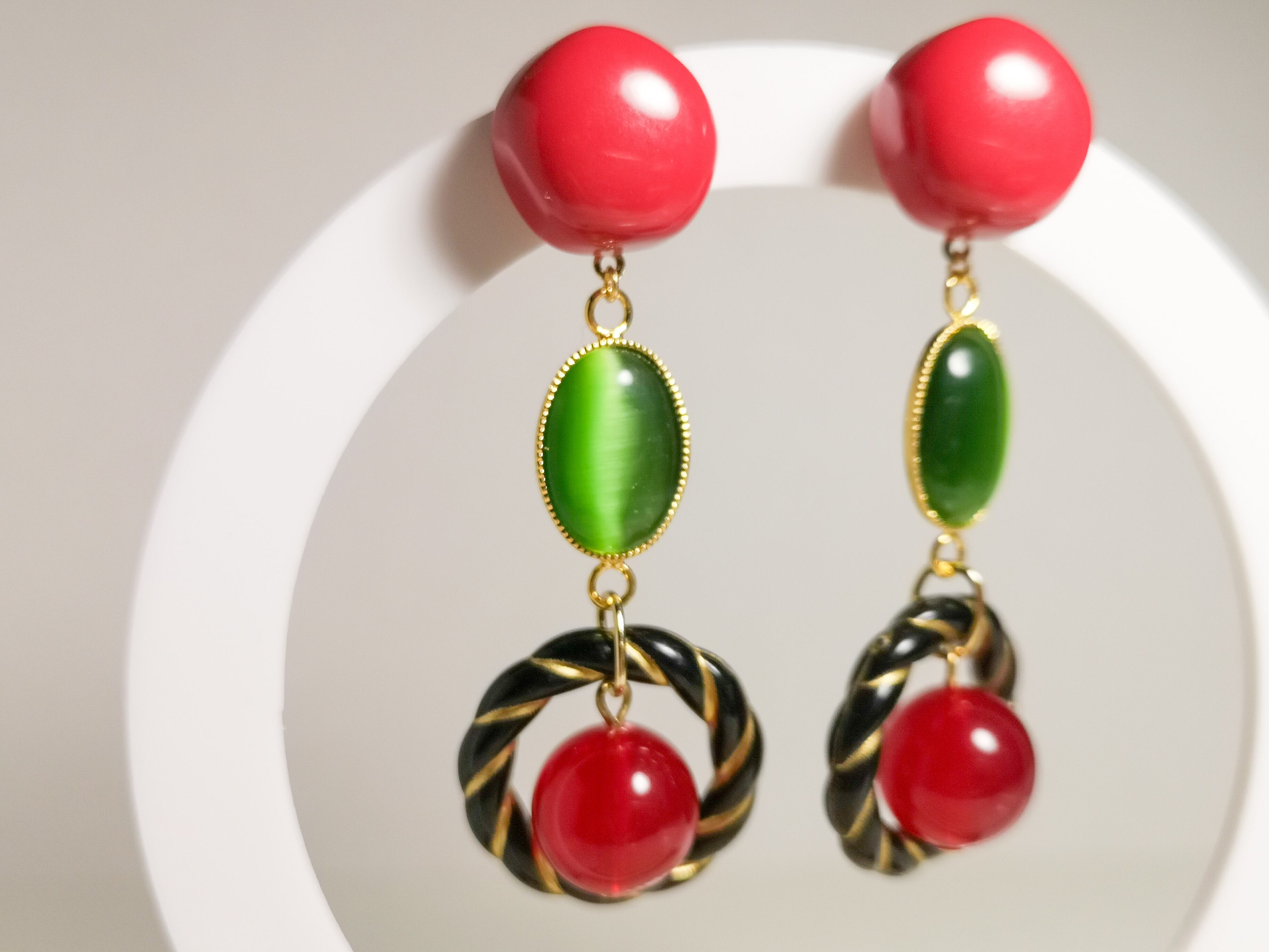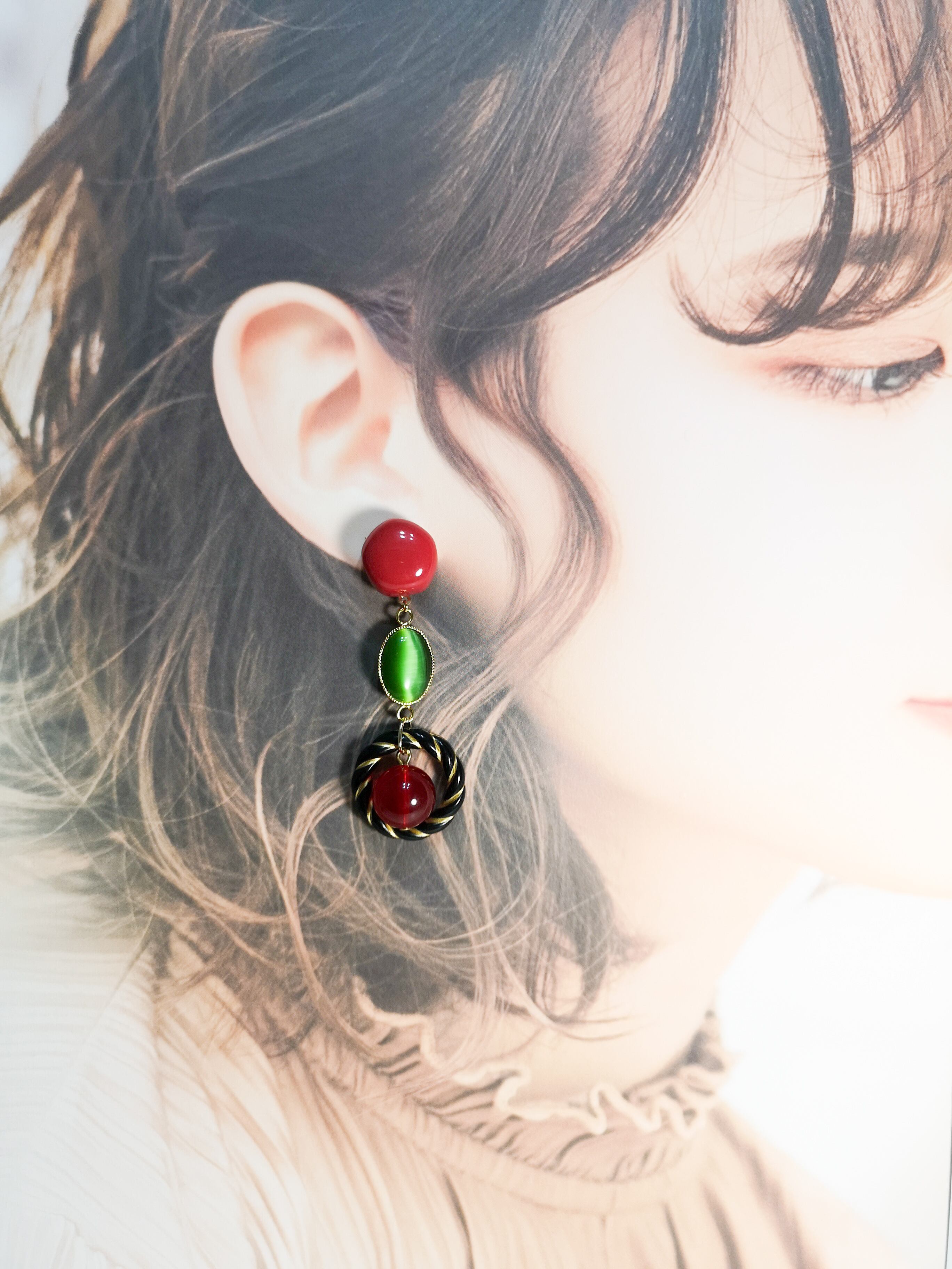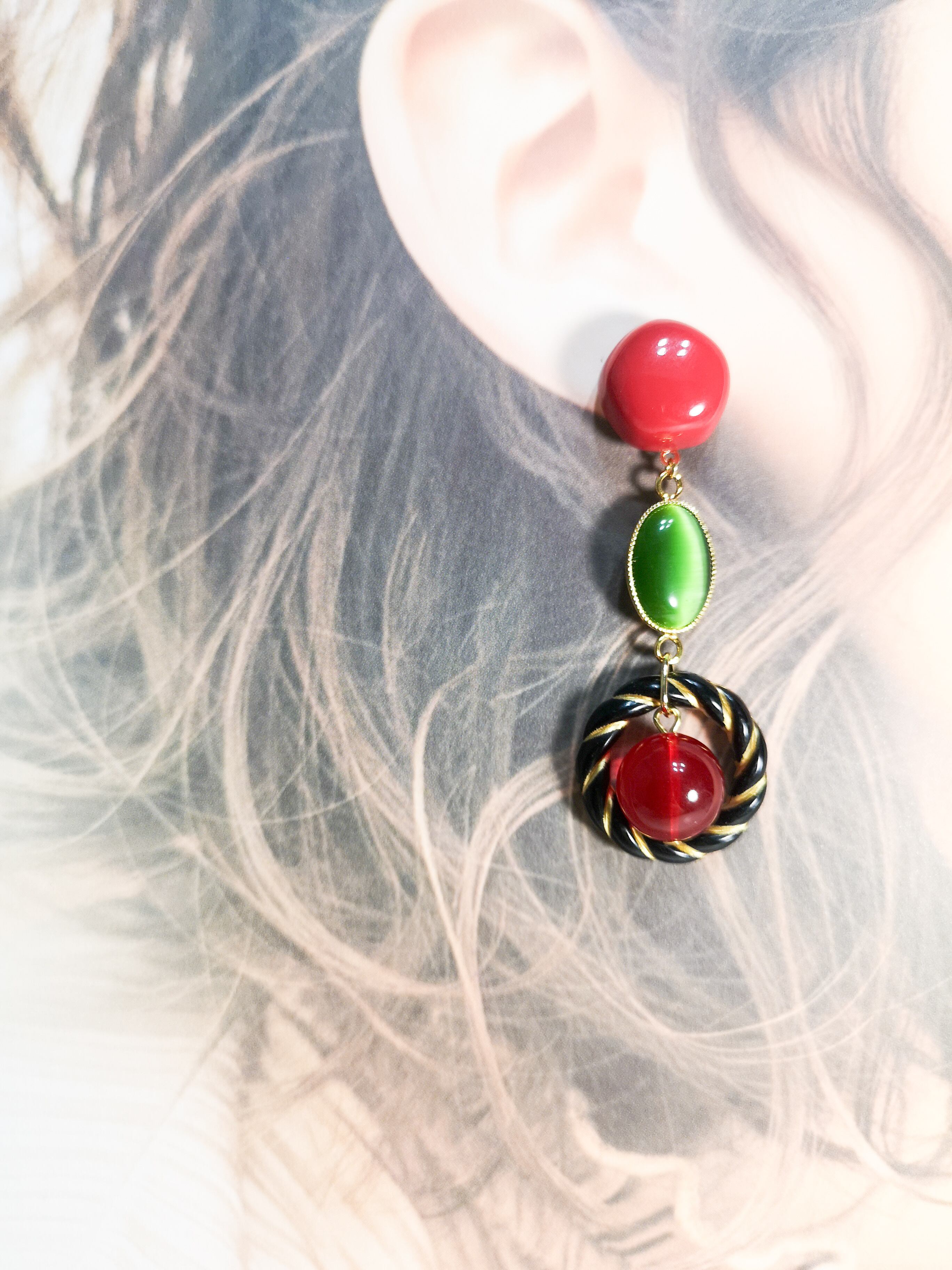 No.38 チェリーレッド&グリーンキャッツアイの煌めくカボションピアス&イヤリング