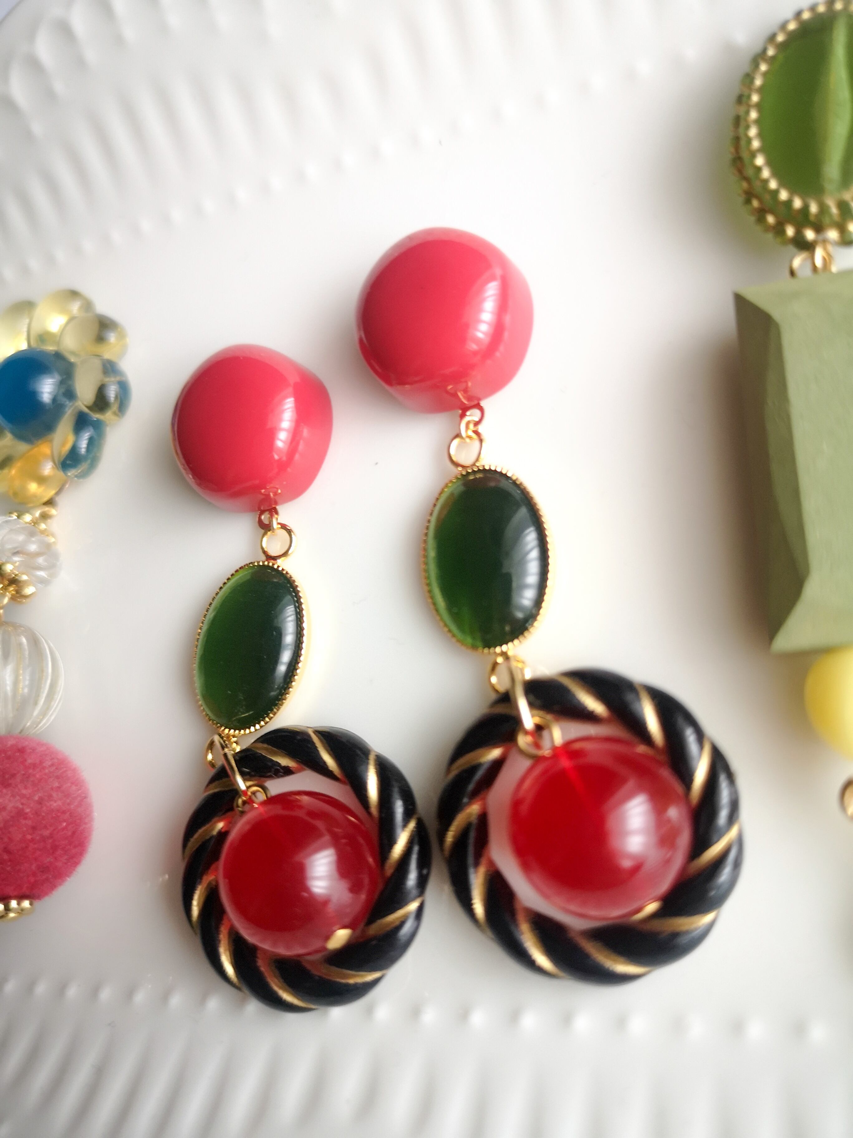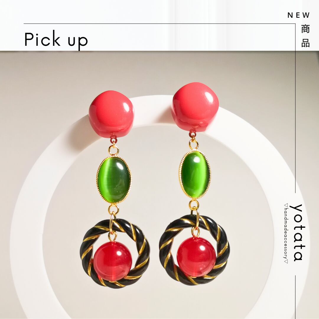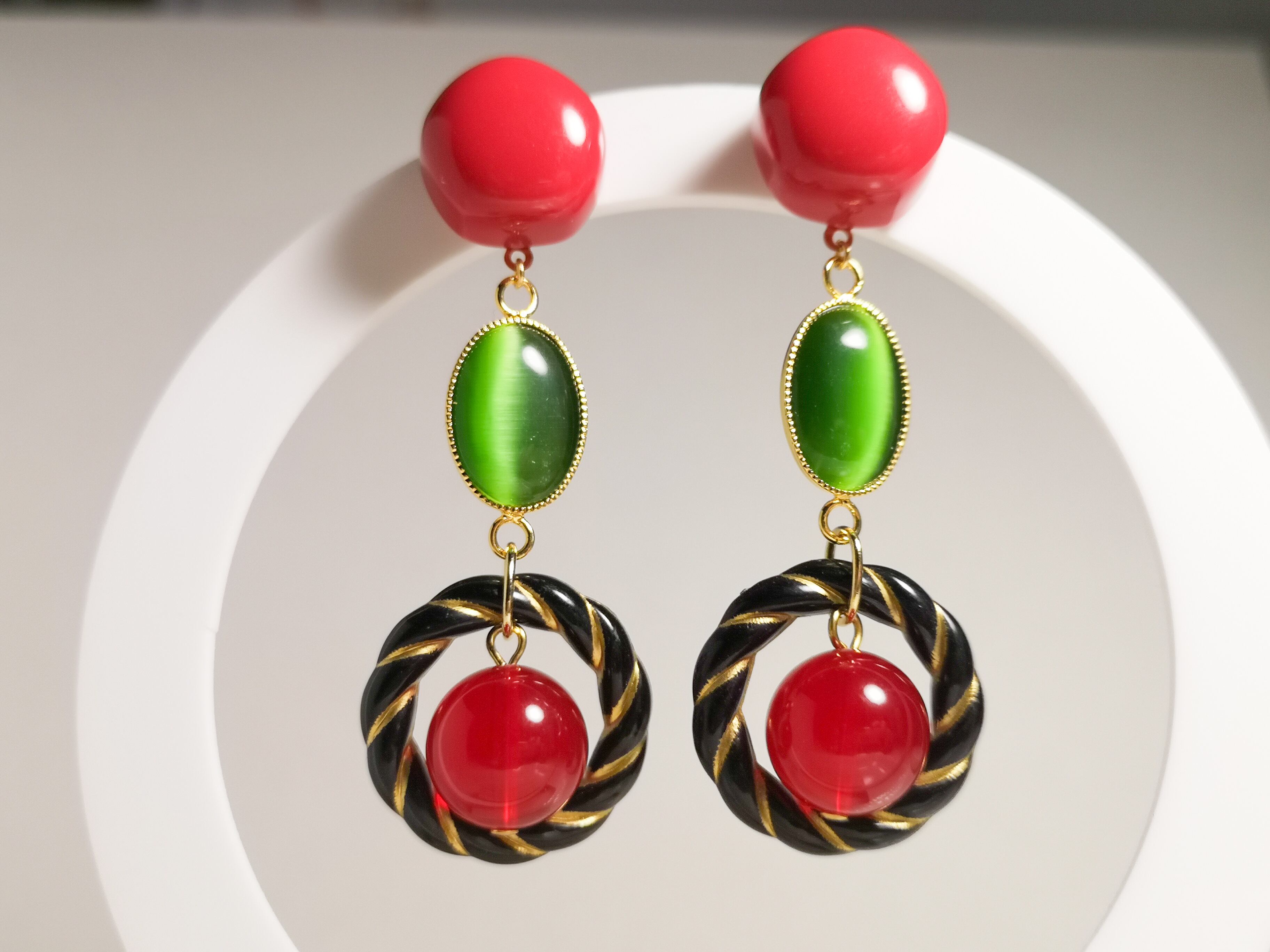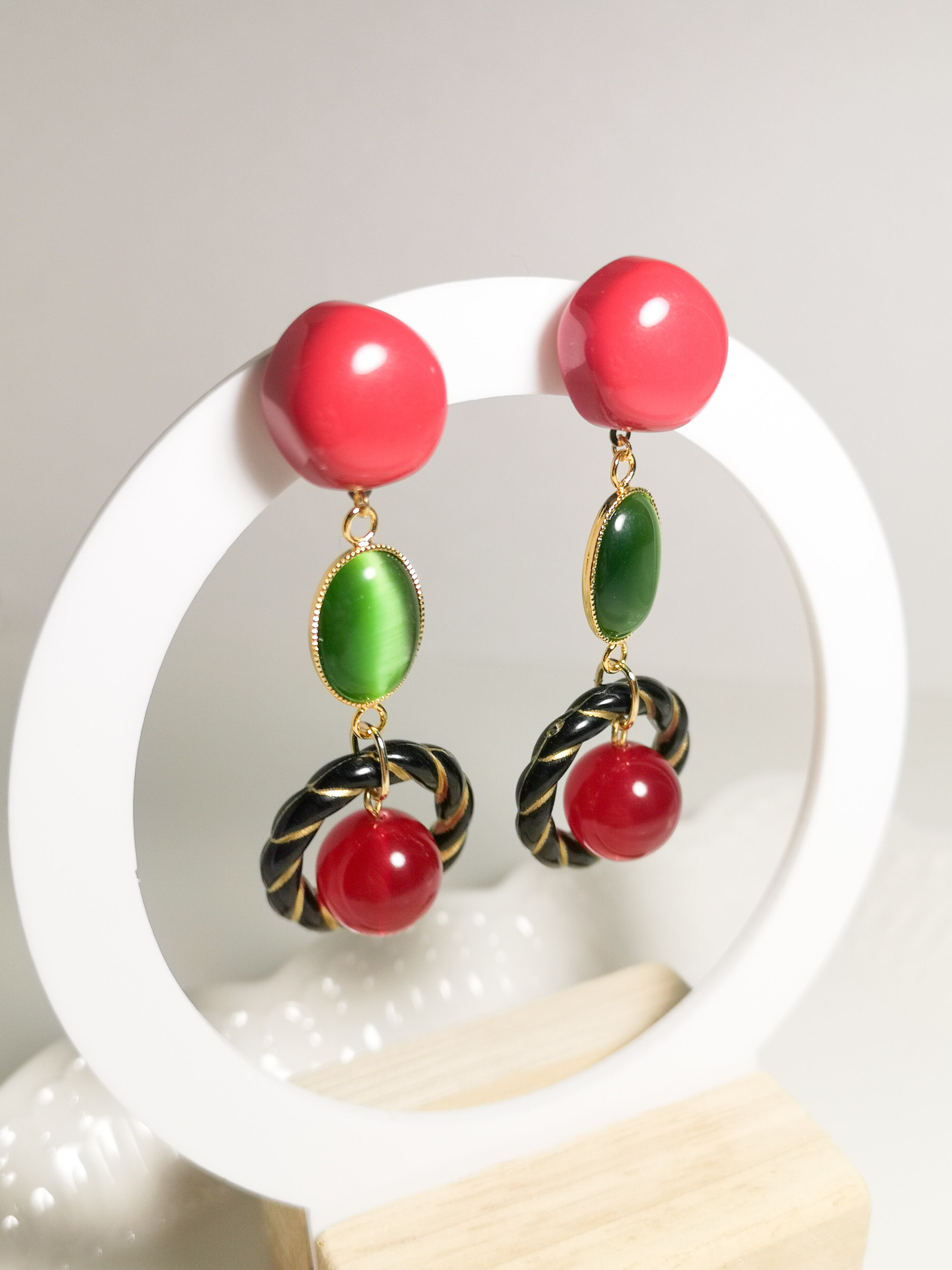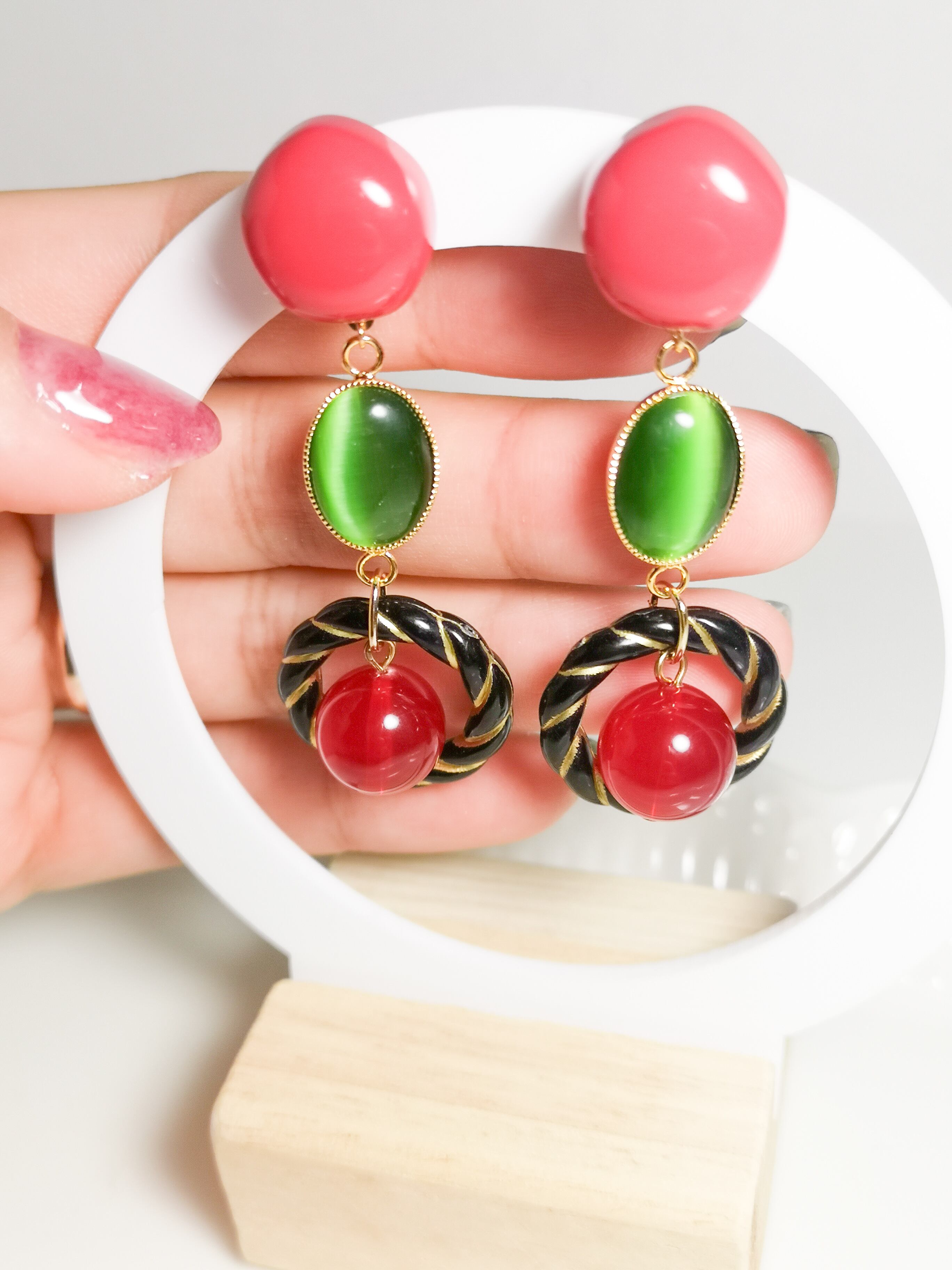 No.38 チェリーレッド&グリーンキャッツアイの煌めくカボションピアス&イヤリング