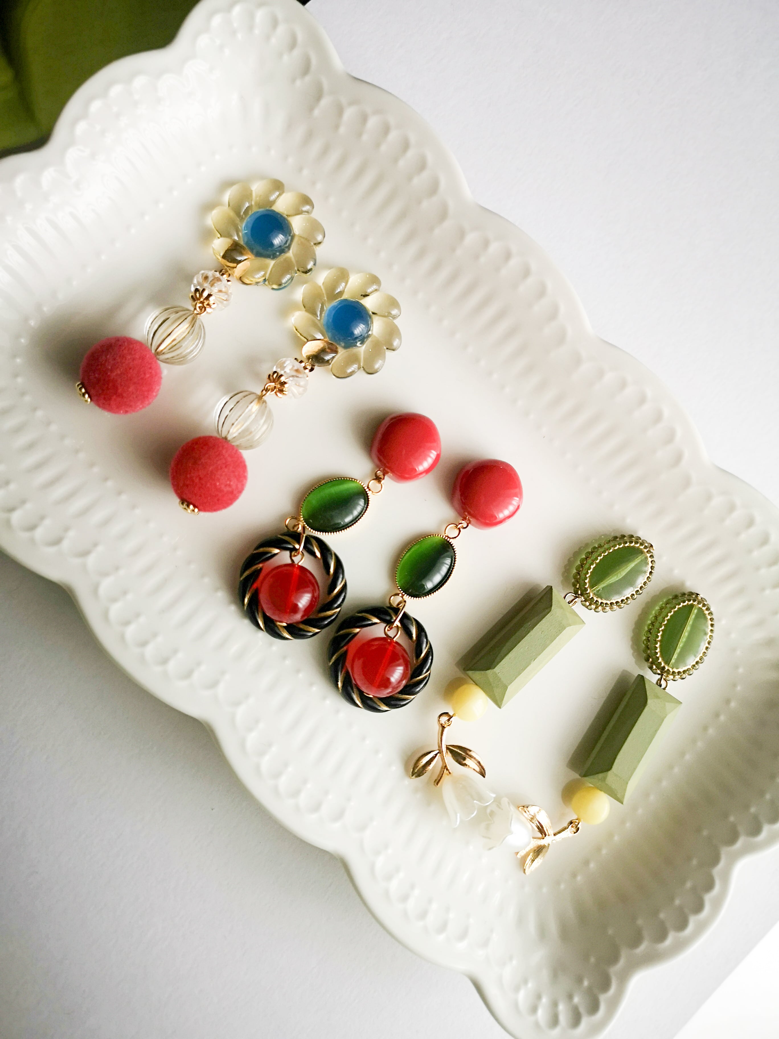 グリーンカラーをベースに、黄色い変形アクリルとお花のチャームを組み合わた、どこかレトロ感漂うデザインは、どんなコーディネートにもエレガントさをプラスします⸜❁︎⸝