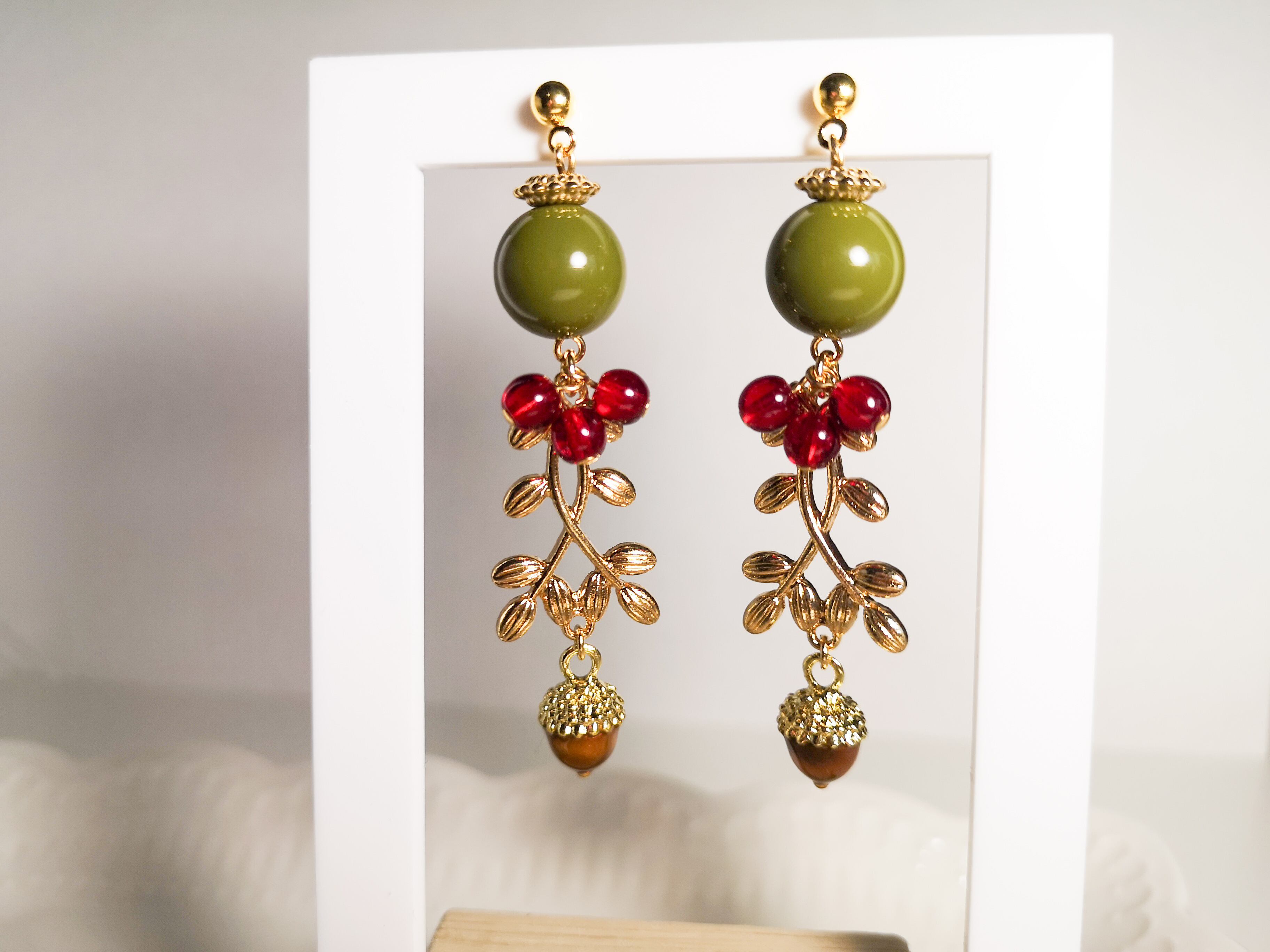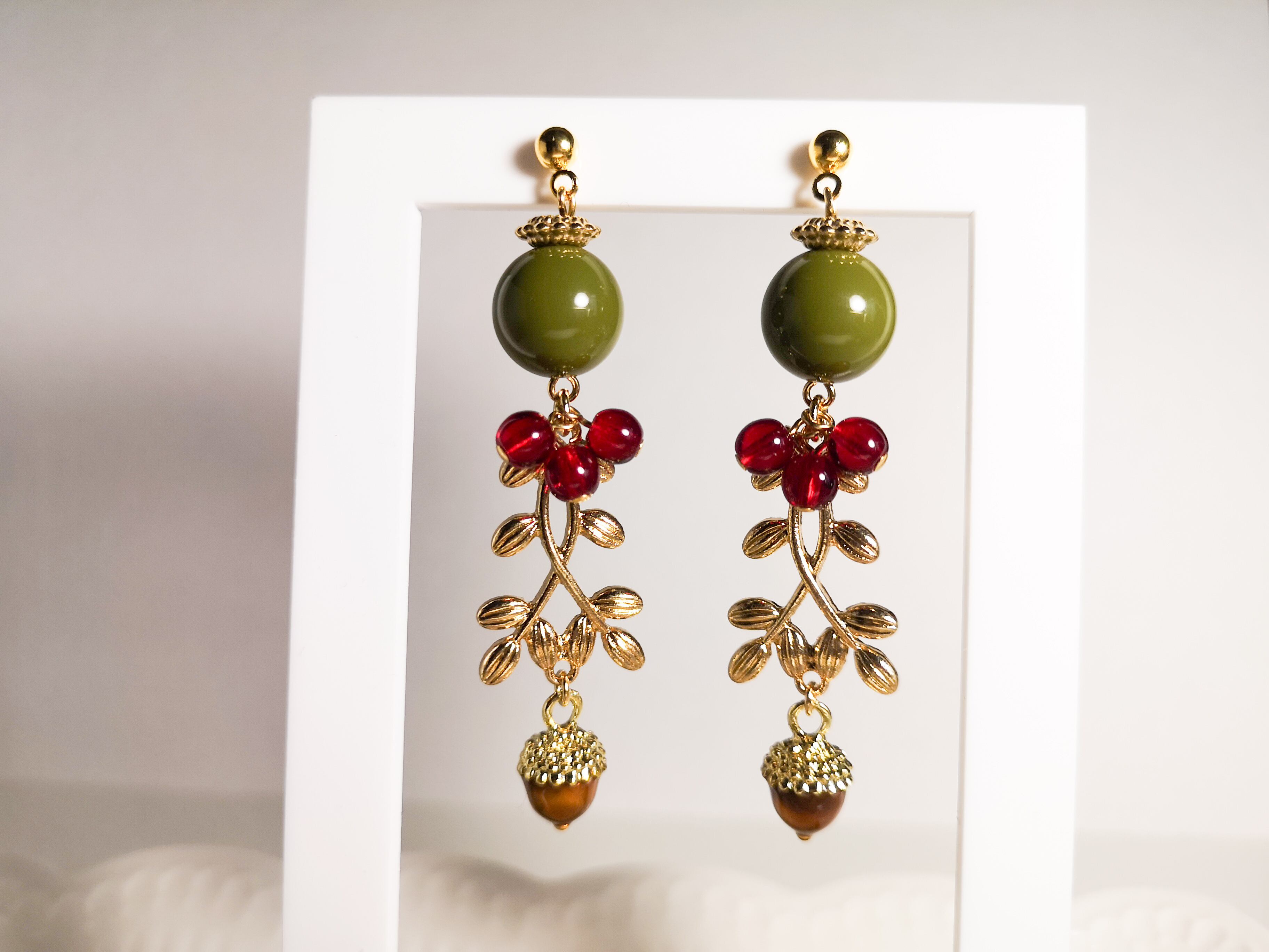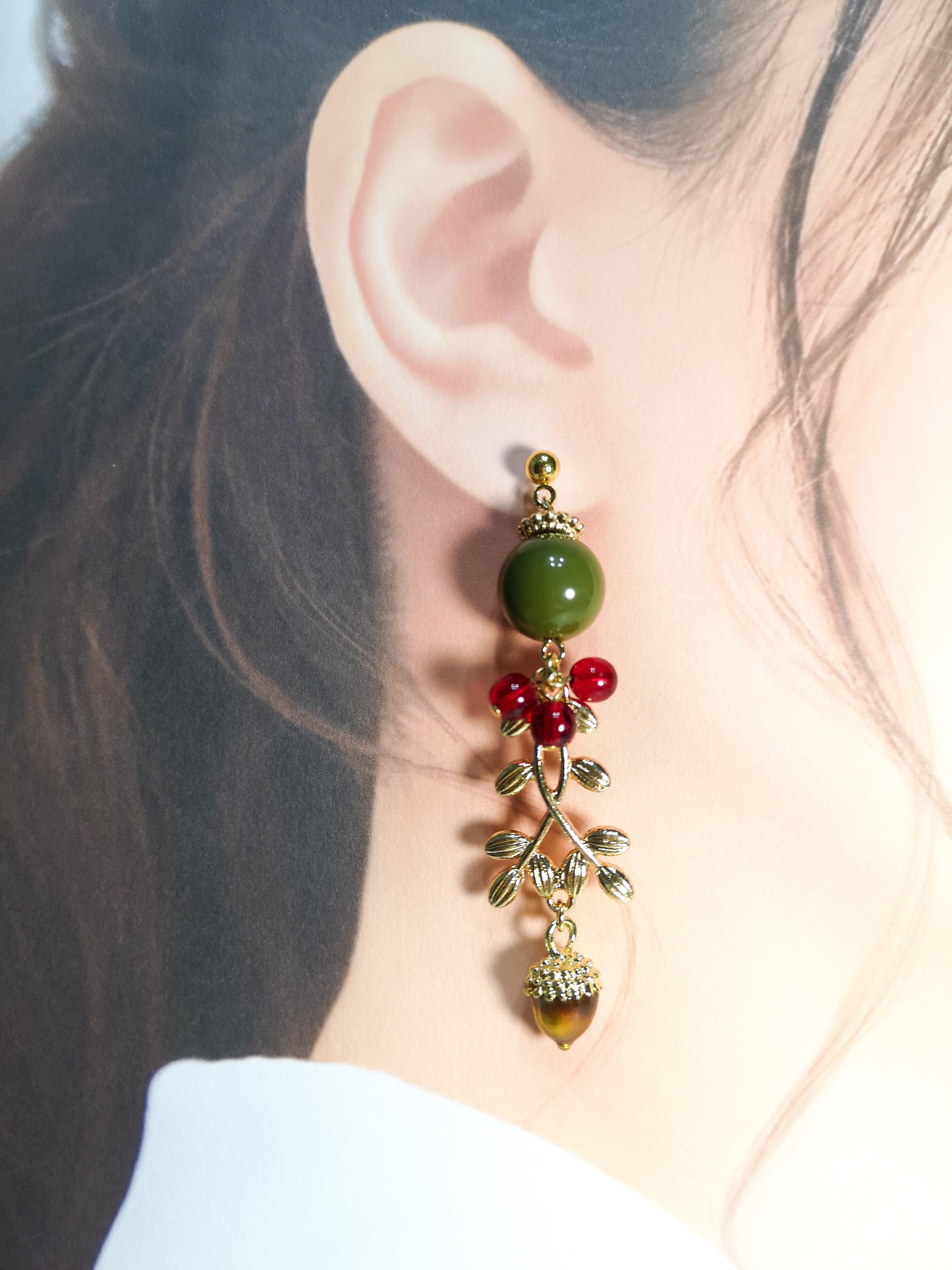 どんぐりとガラスで出来た真っ赤な木の実をモチーフにした、特別なアクセサリーが耳元を華やかに演出します。