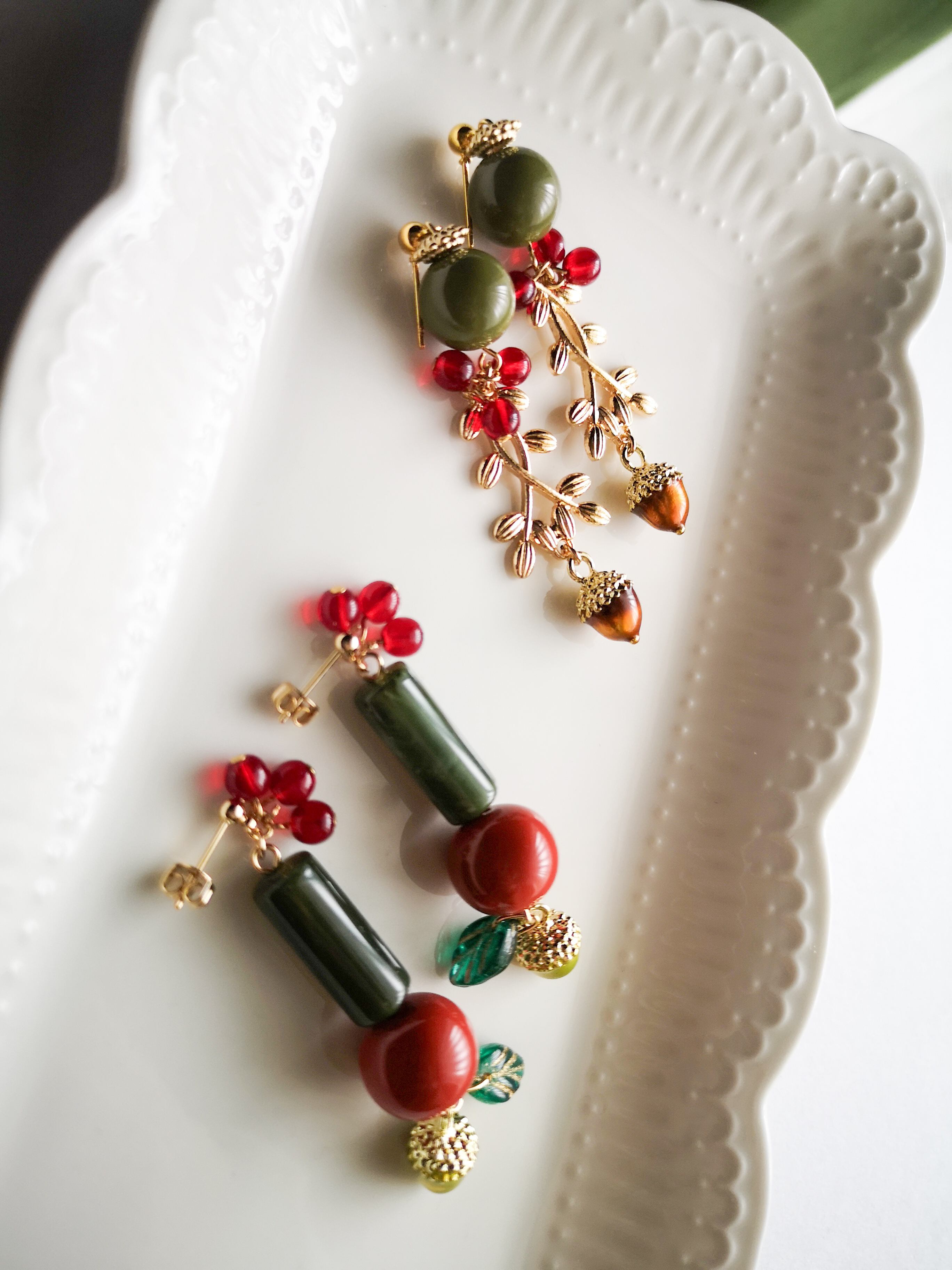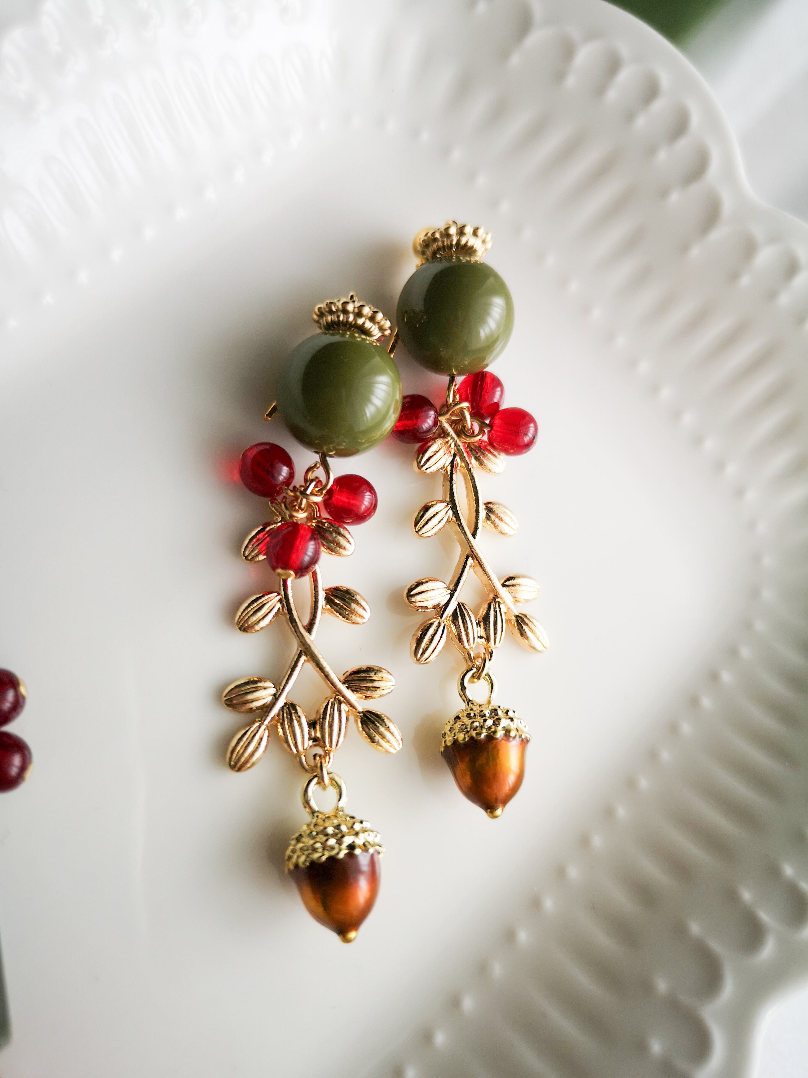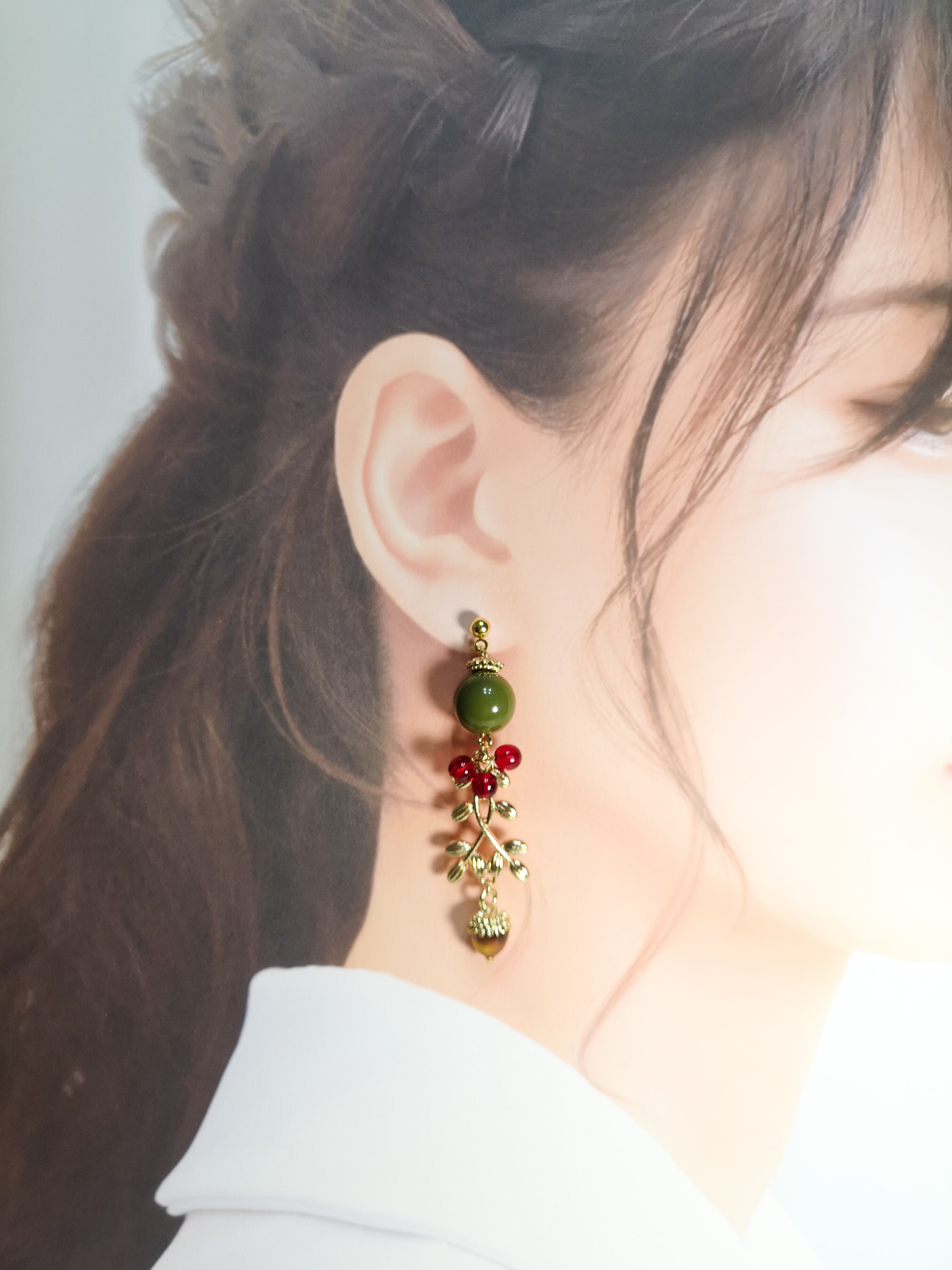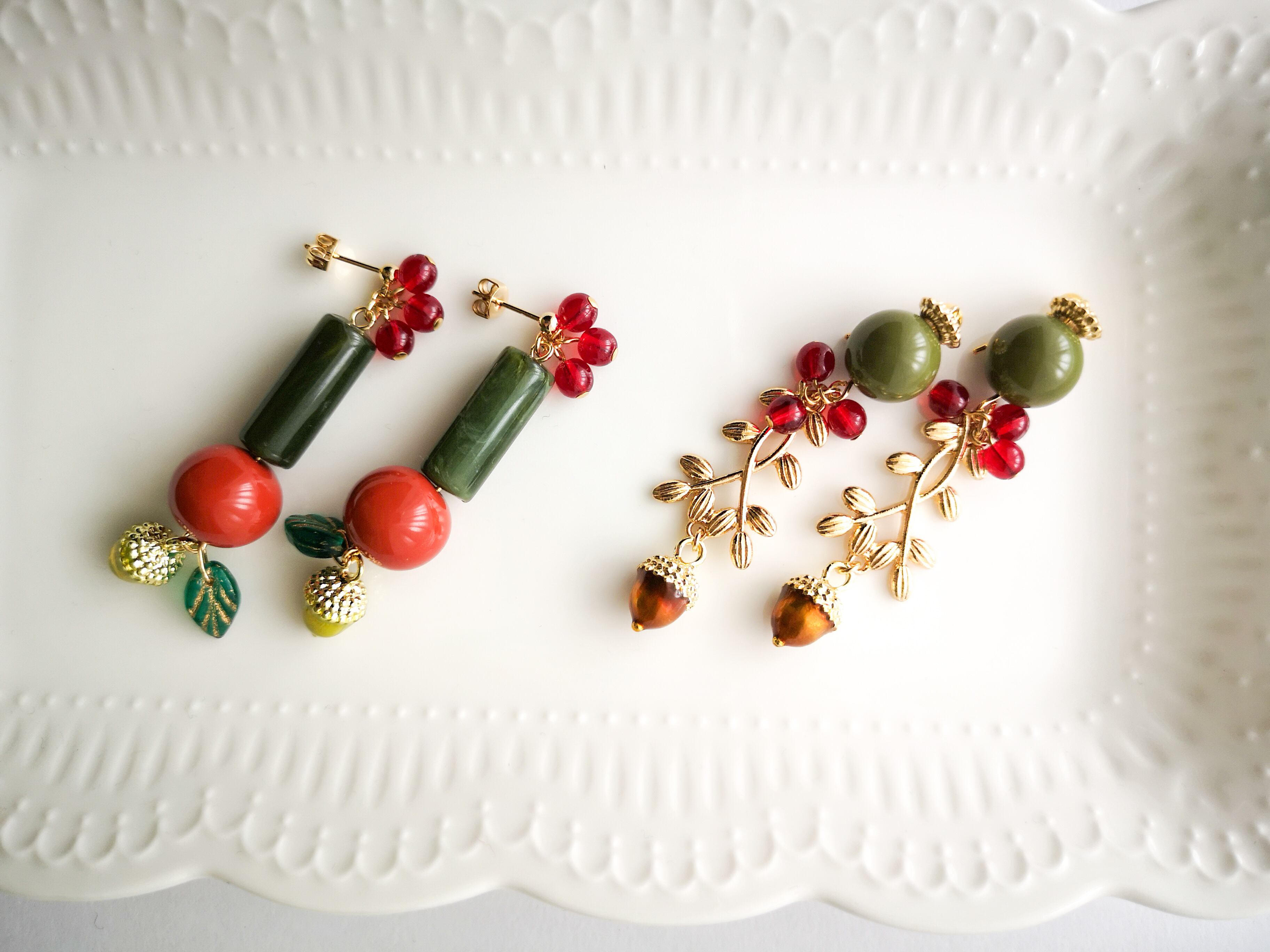 どんぐりとガラスで出来た真っ赤な木の実をモチーフにした、特別なアクセサリーが耳元を華やかに演出します。