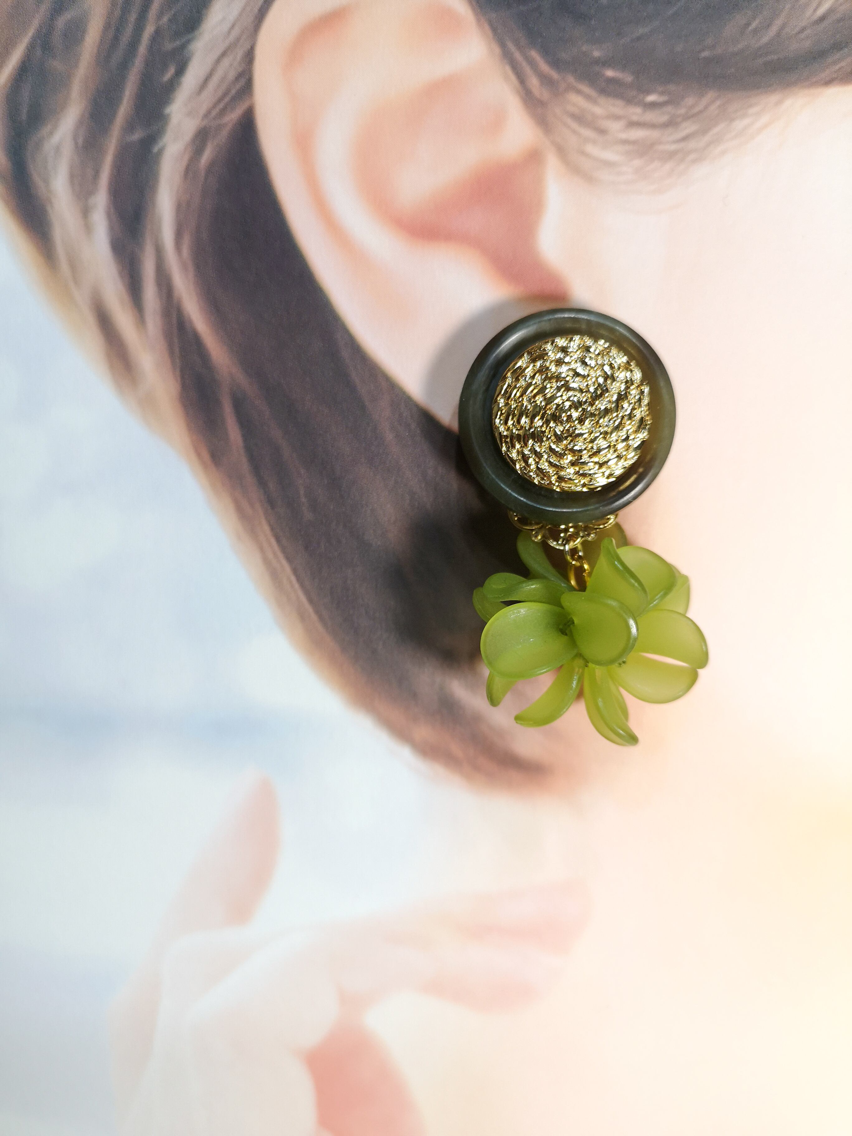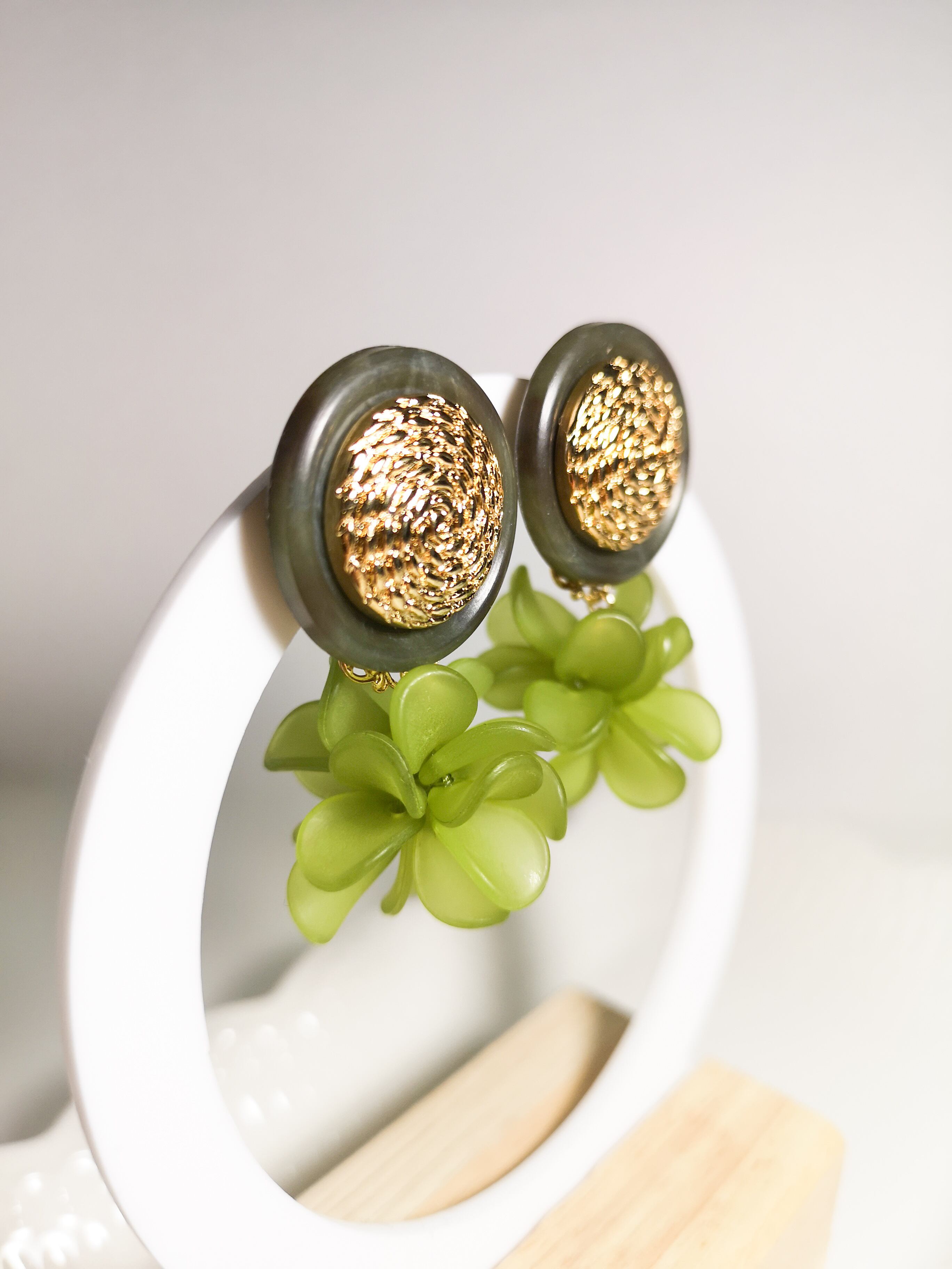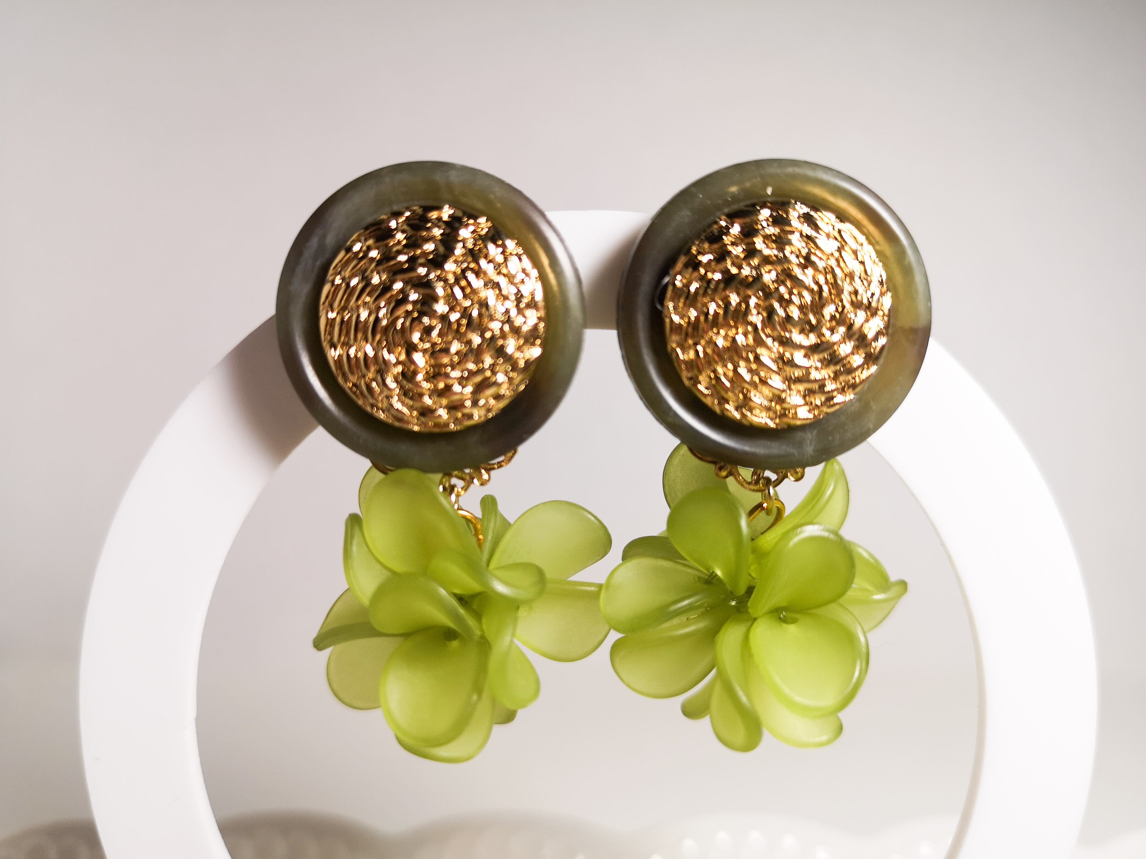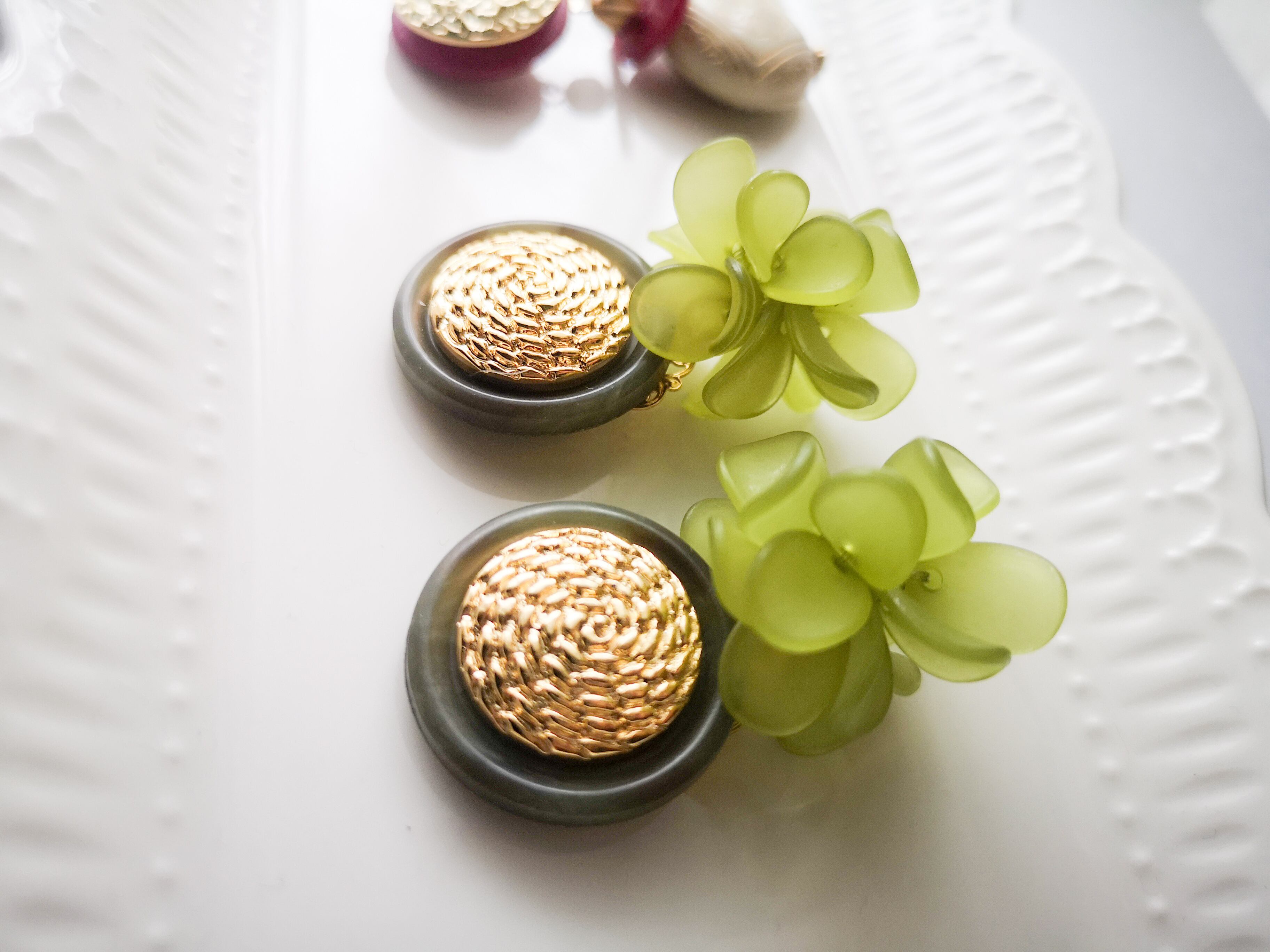 No.35 ヴィンテージボタンのグリーン×ゴールドの大ぶりお花ピアス&イヤリング