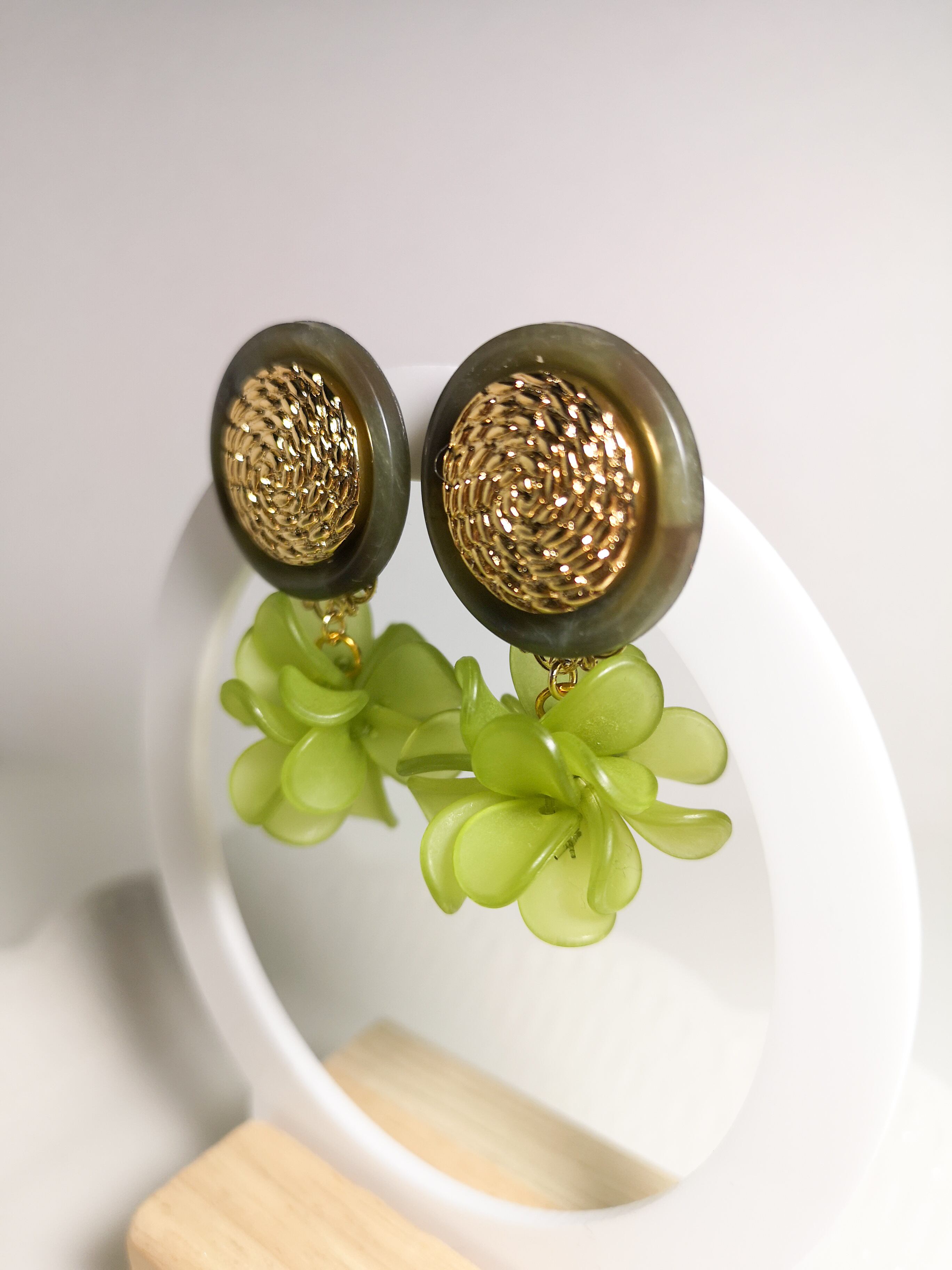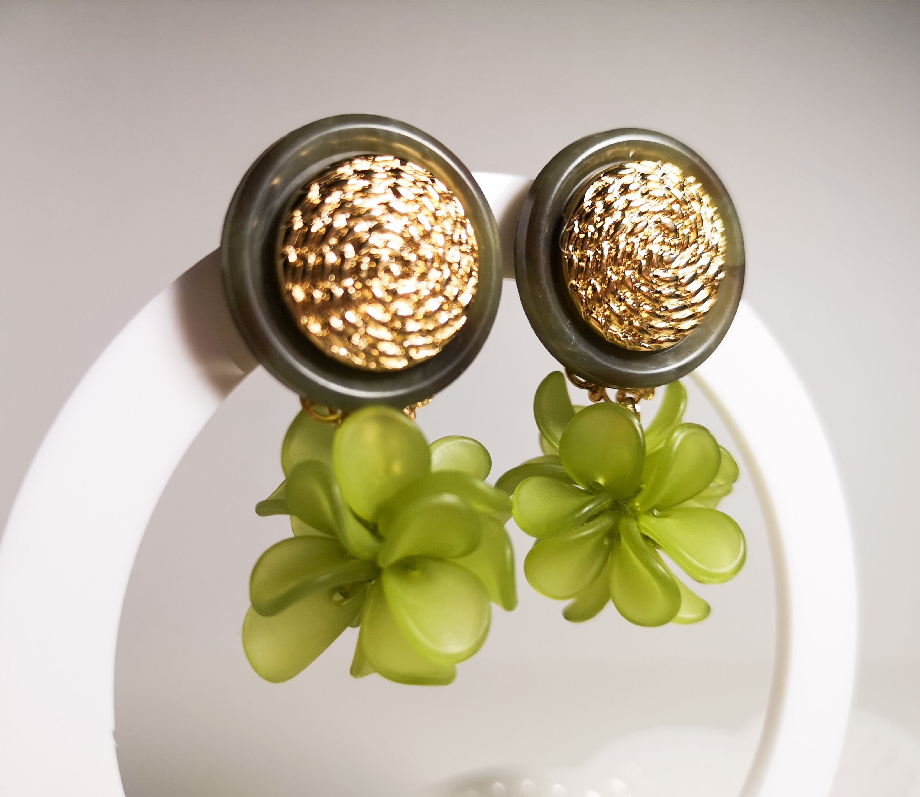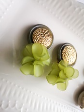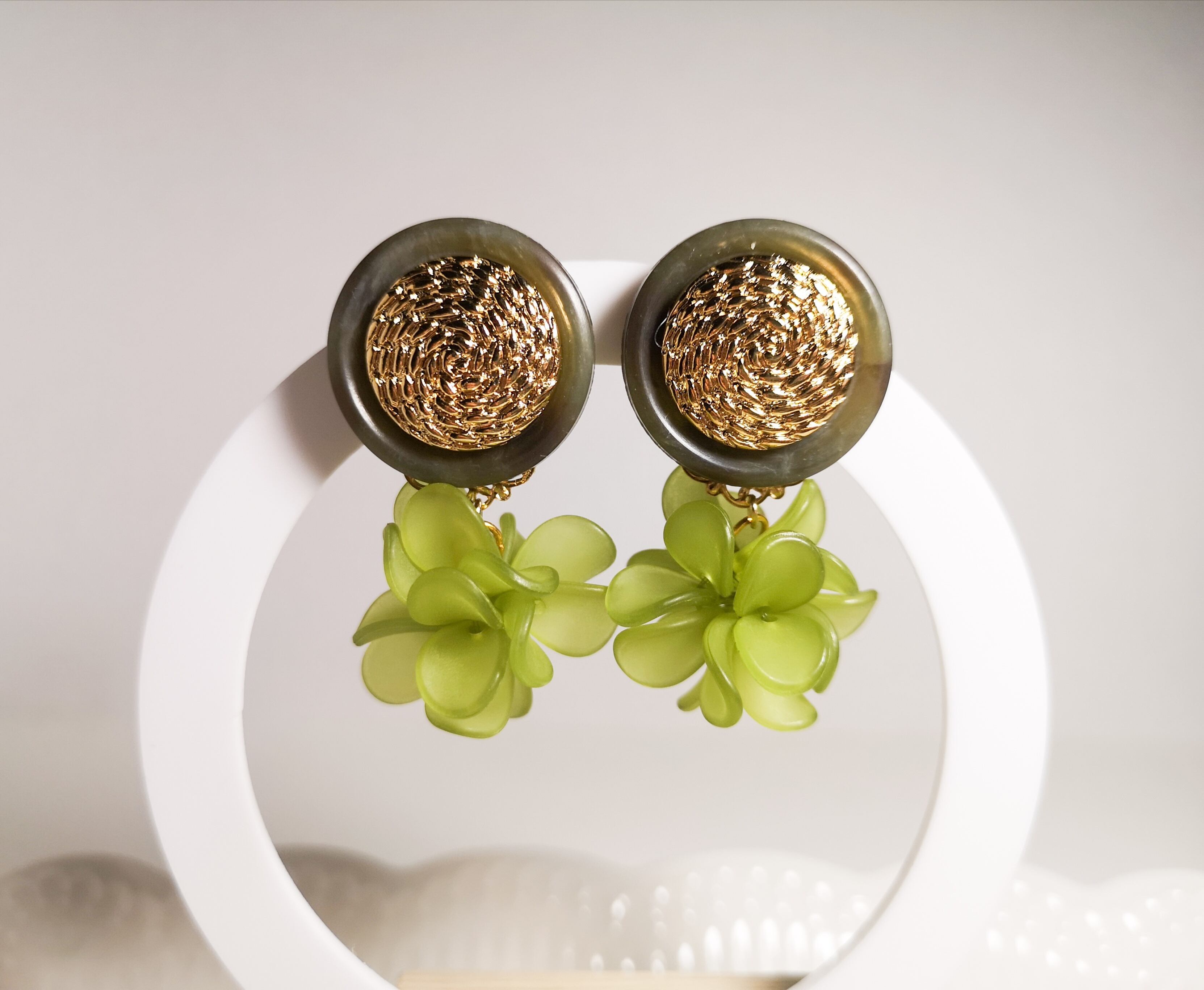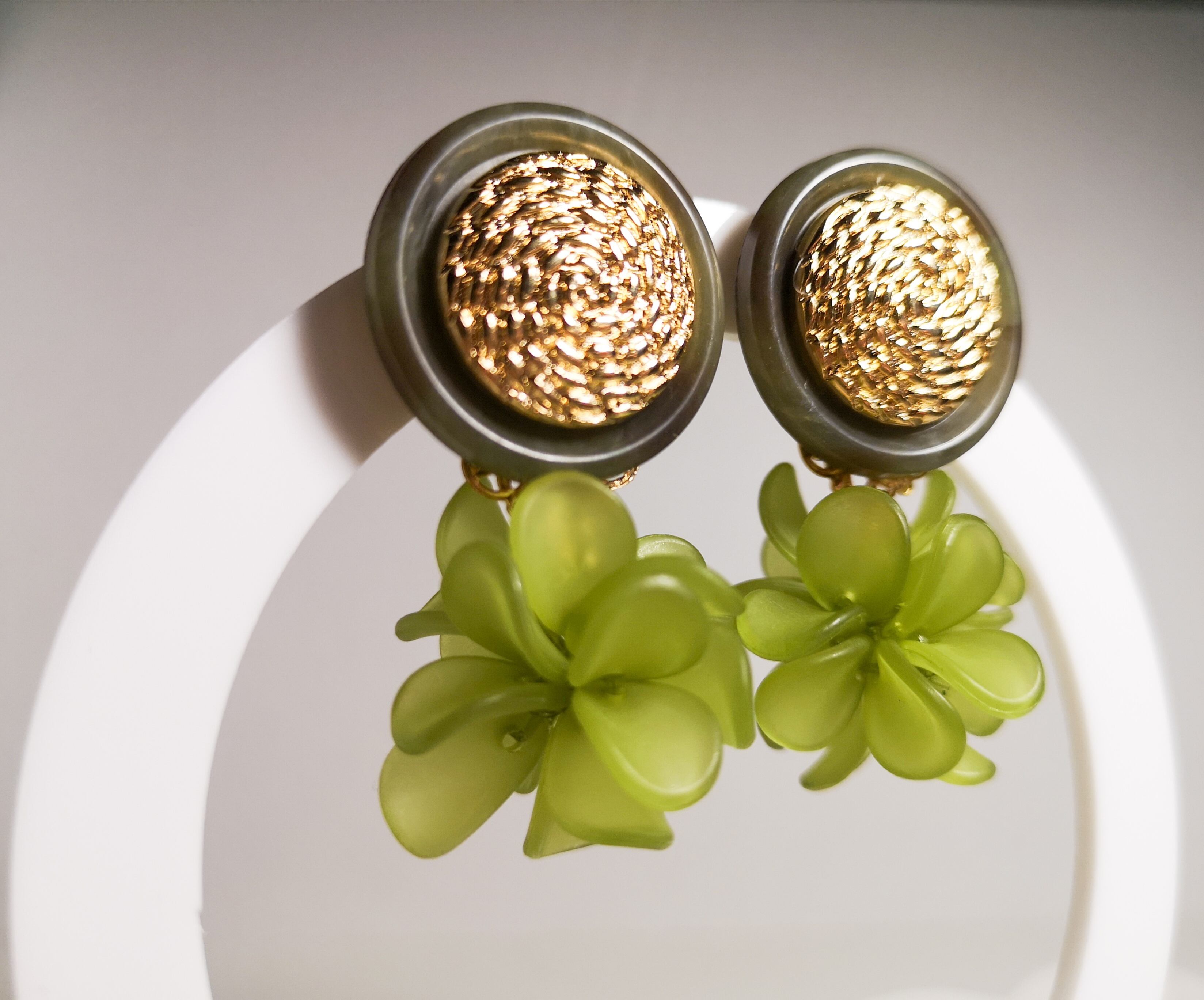 No.35 ヴィンテージボタンのグリーン×ゴールドの大ぶりお花ピアス&イヤリング