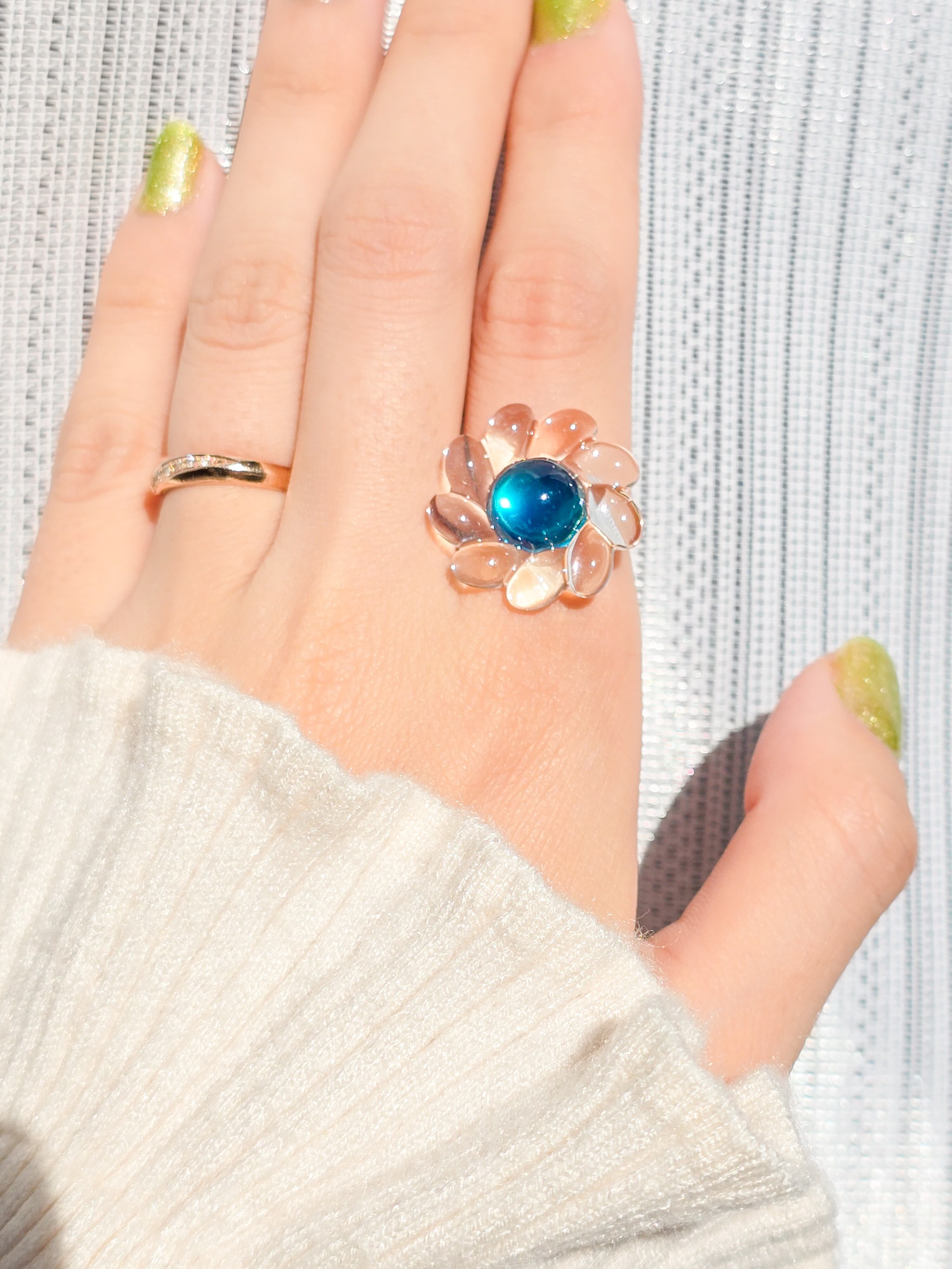 鮮やかで透明感いっぱいのクリアブルーのお花が手元を優雅に飾る、レトロで可愛いデザインのリングです❁︎