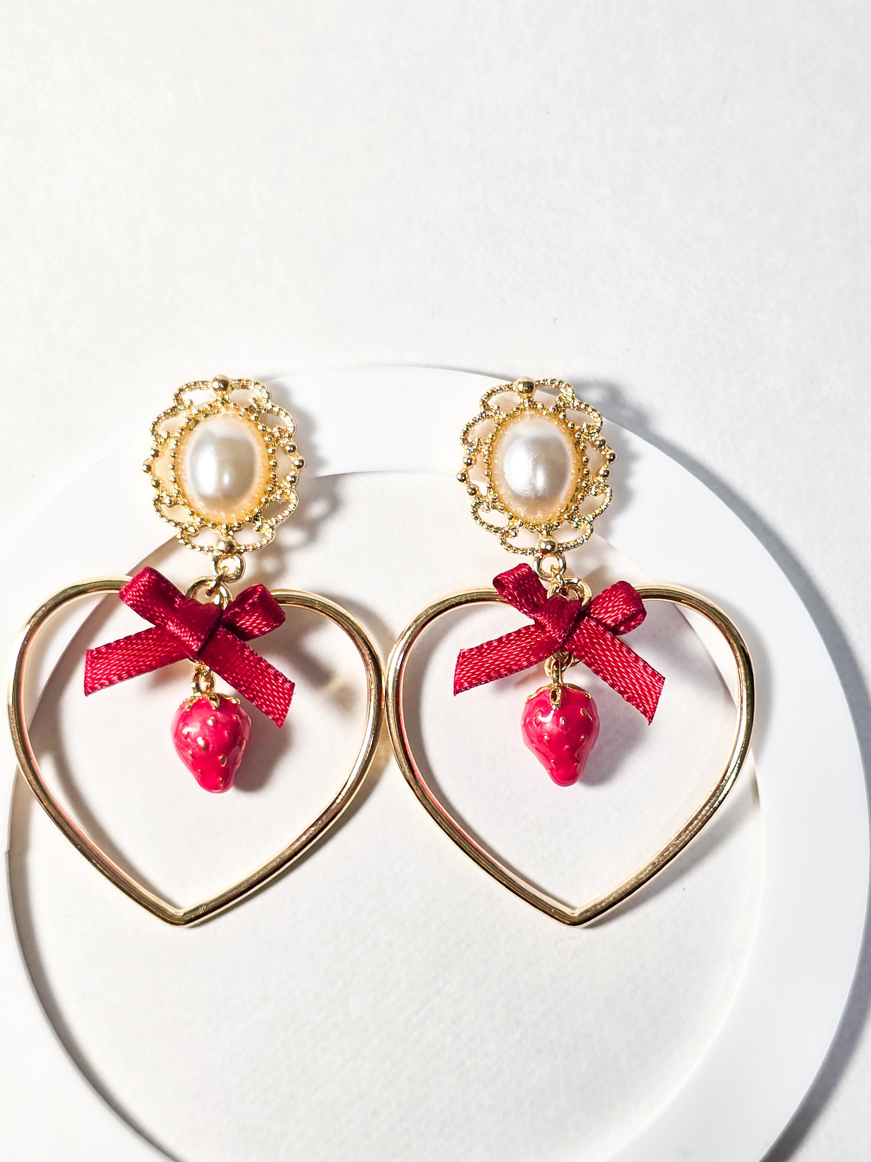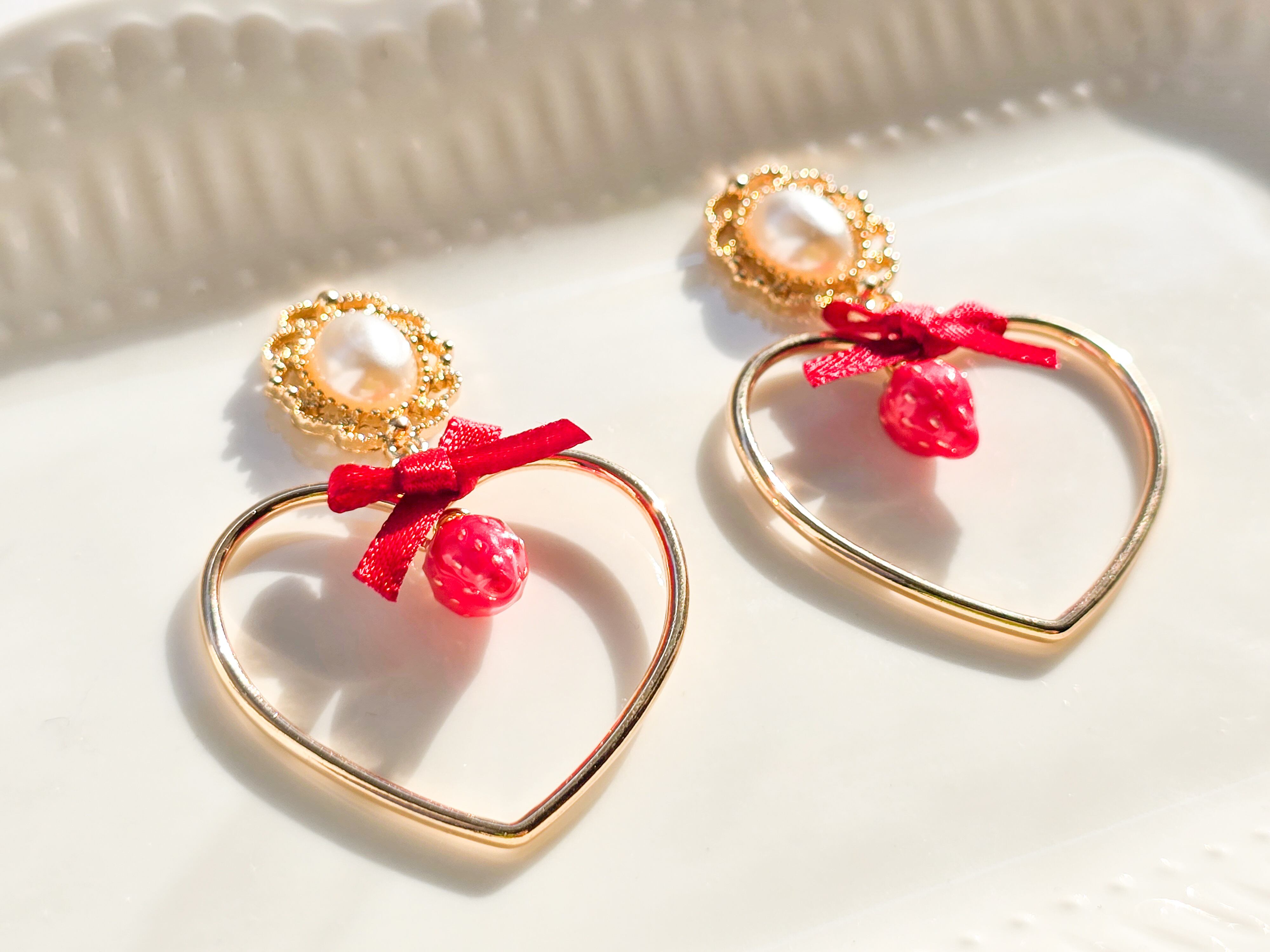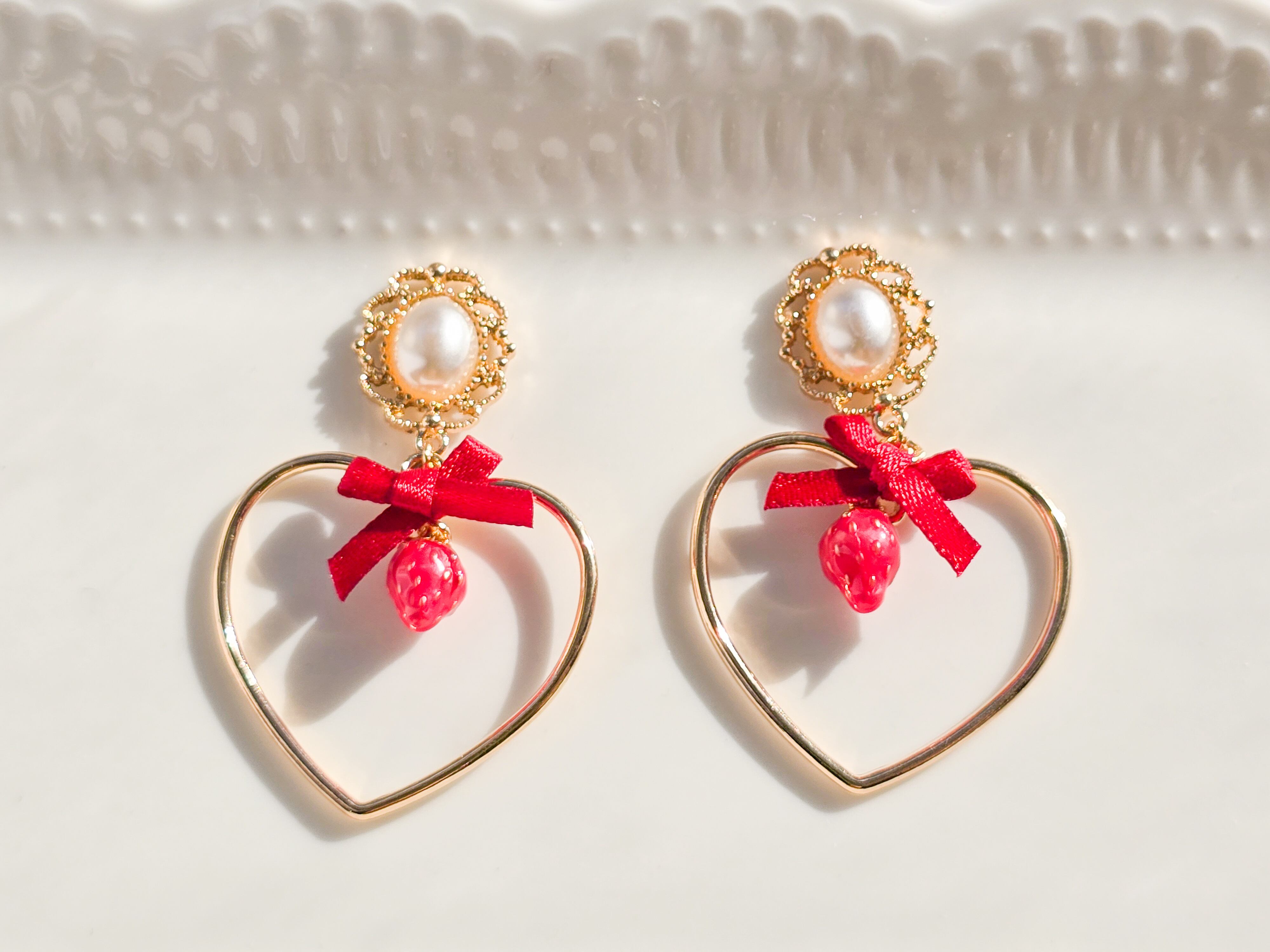 愛らしいいちごのチャームとハートフレーム、赤いリボンのデザインがあなたの耳元に乙女心をプラスします❁︎