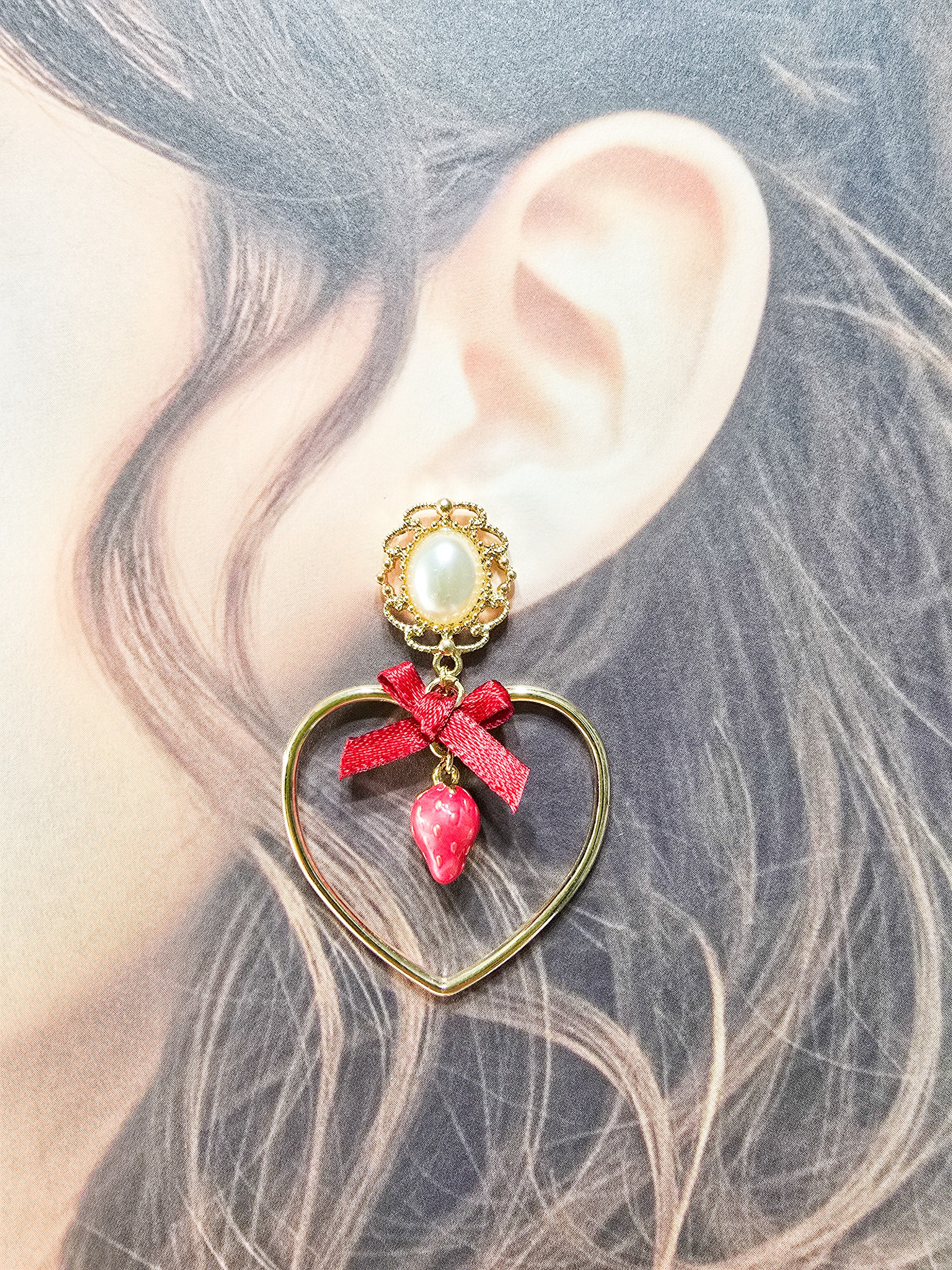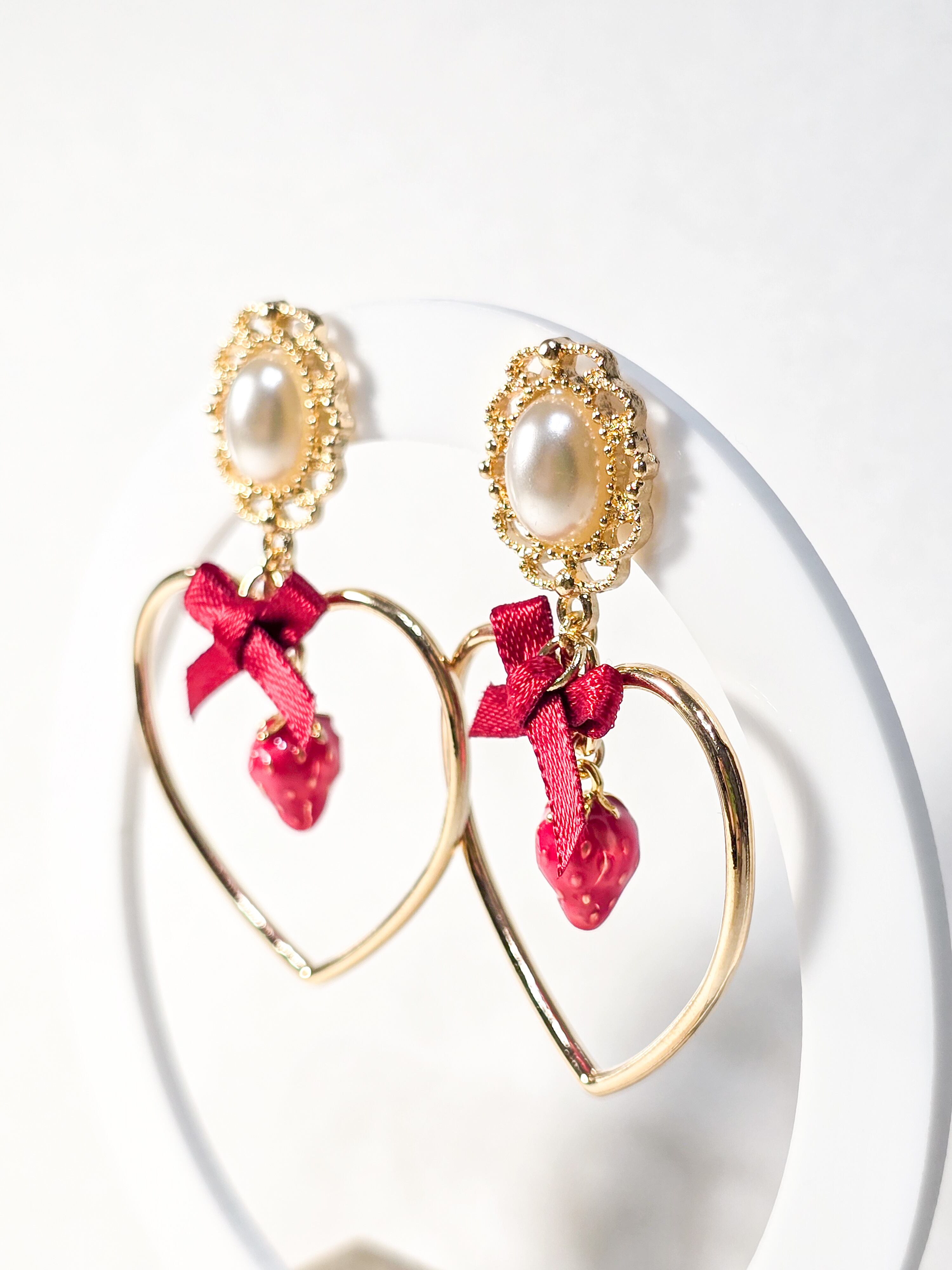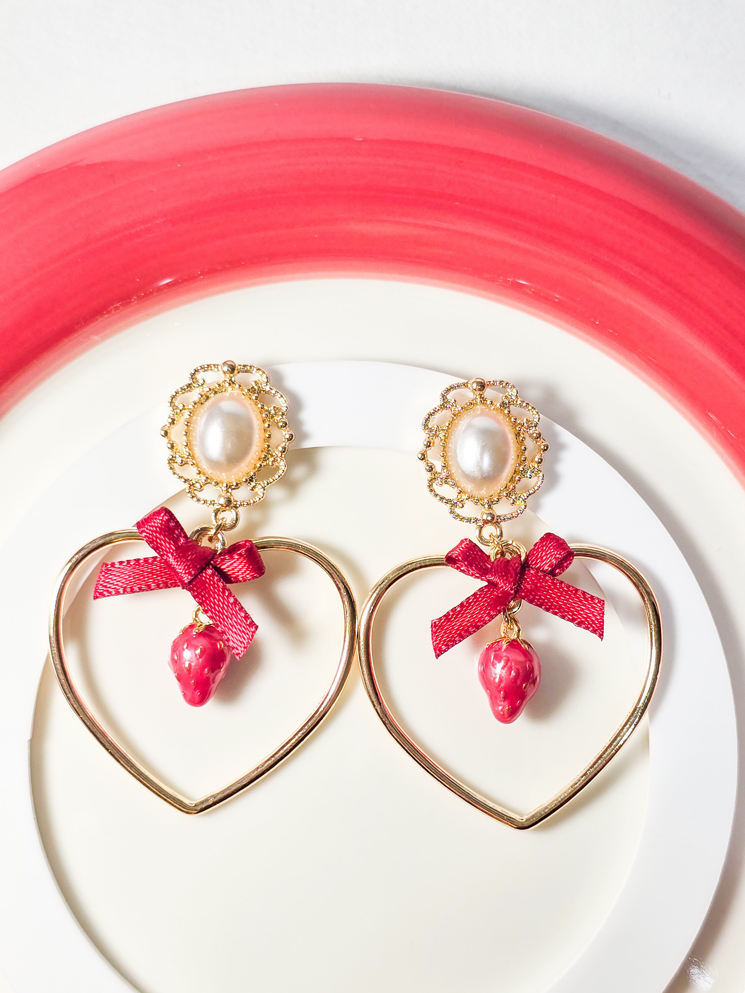 愛らしいいちごのチャームとハートフレーム、赤いリボンのデザインがあなたの耳元に乙女心をプラスします❁︎