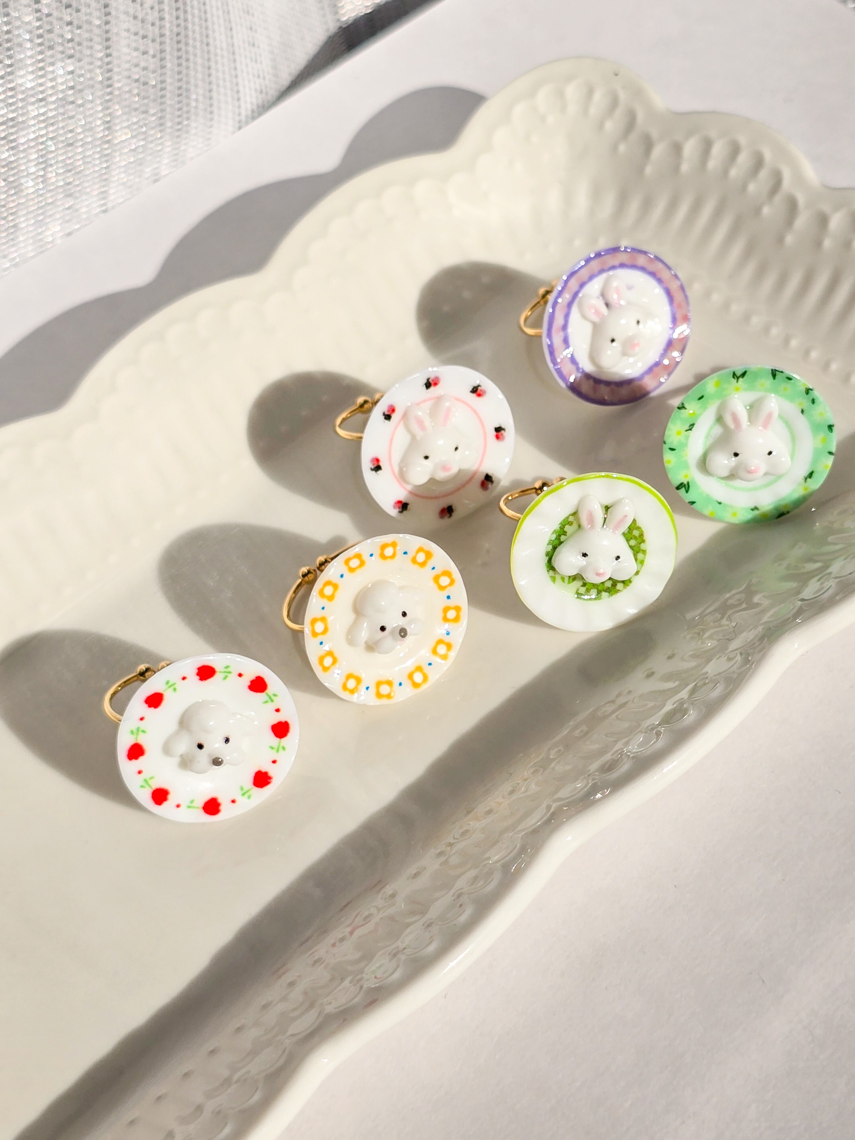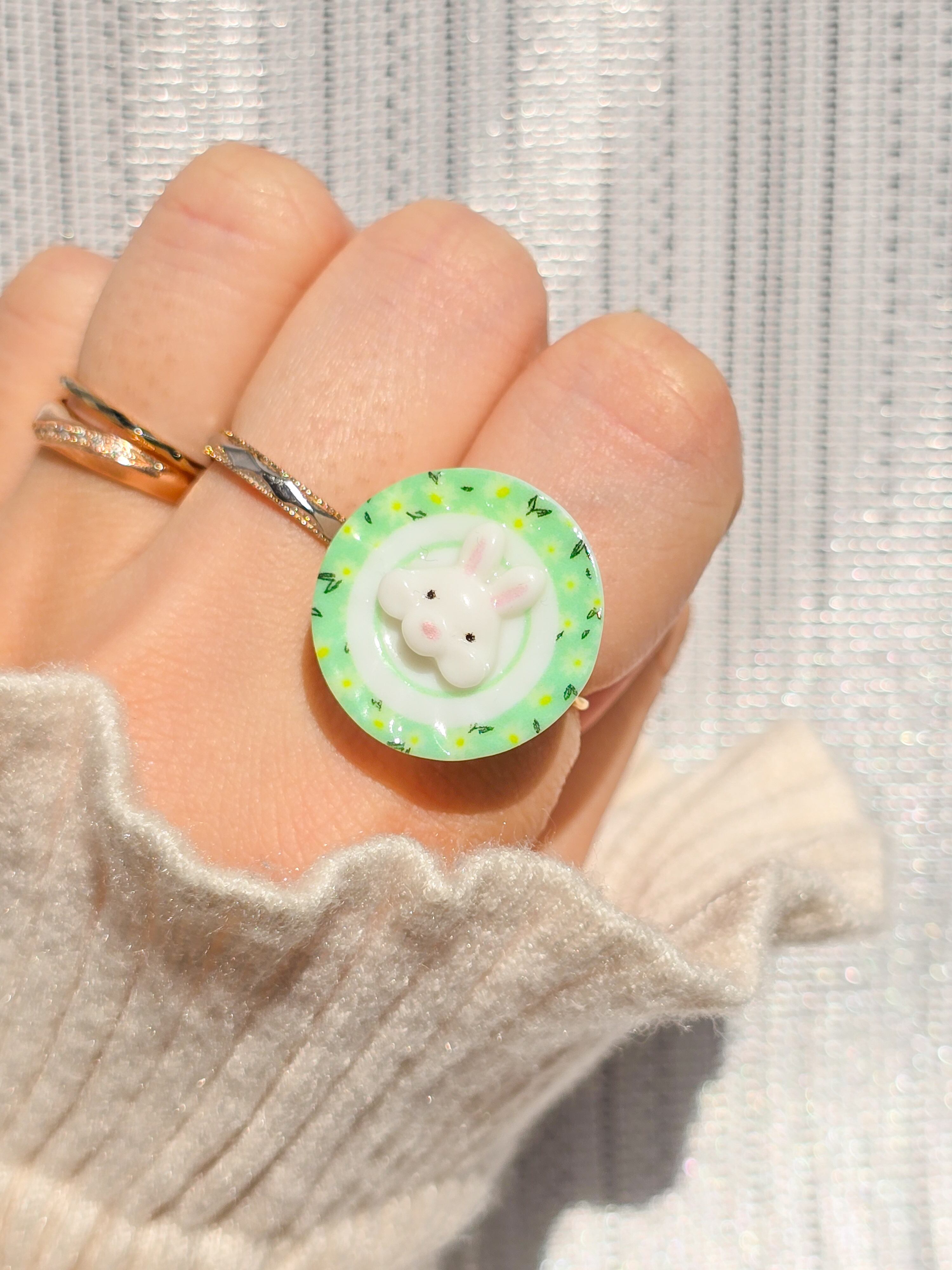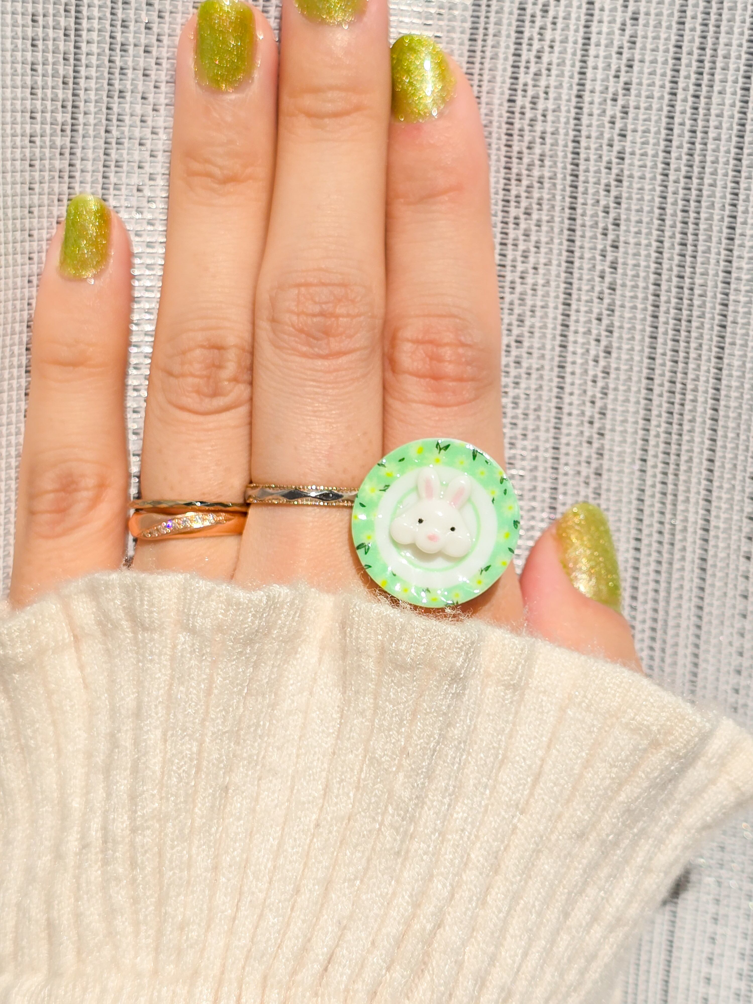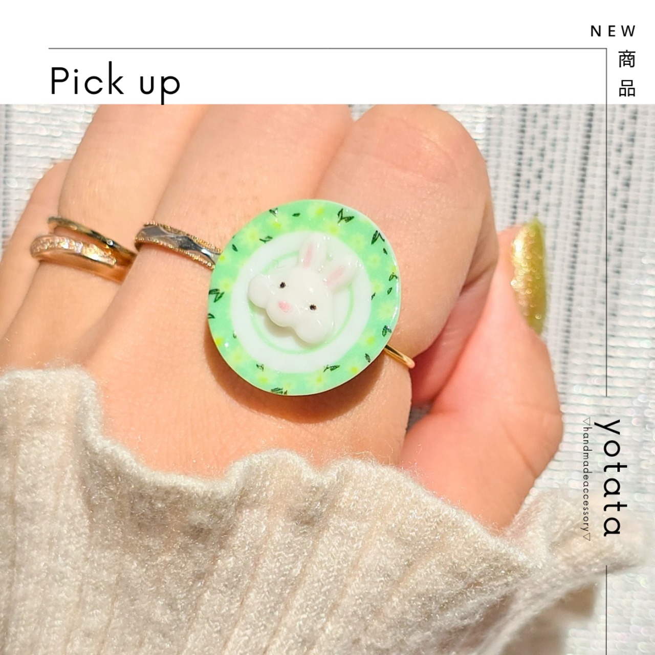 グリーンのお花柄のデザインに愛らしいうさぎちゃんがデザインされた丸型のリングが遊び心を添えます❁︎