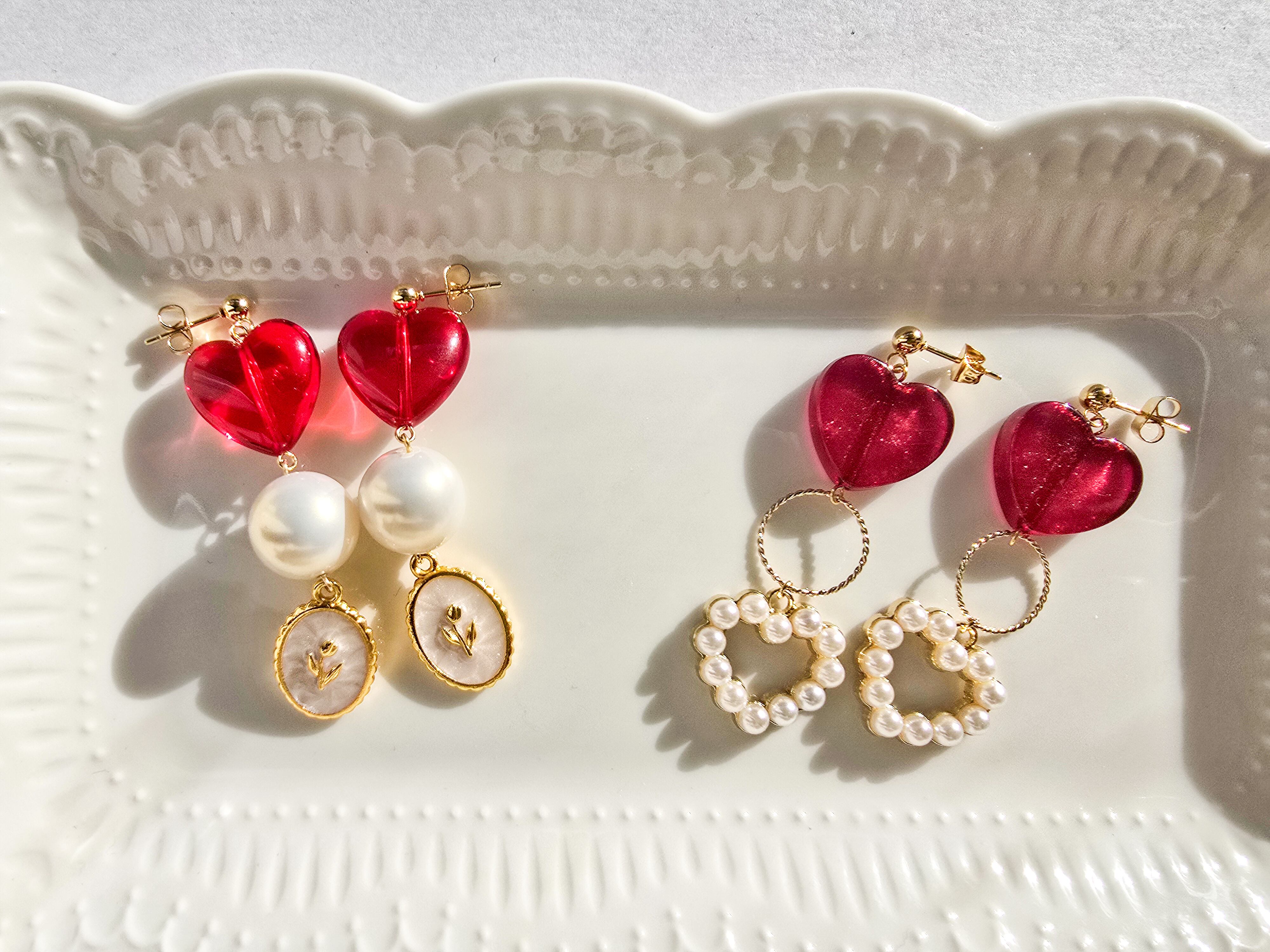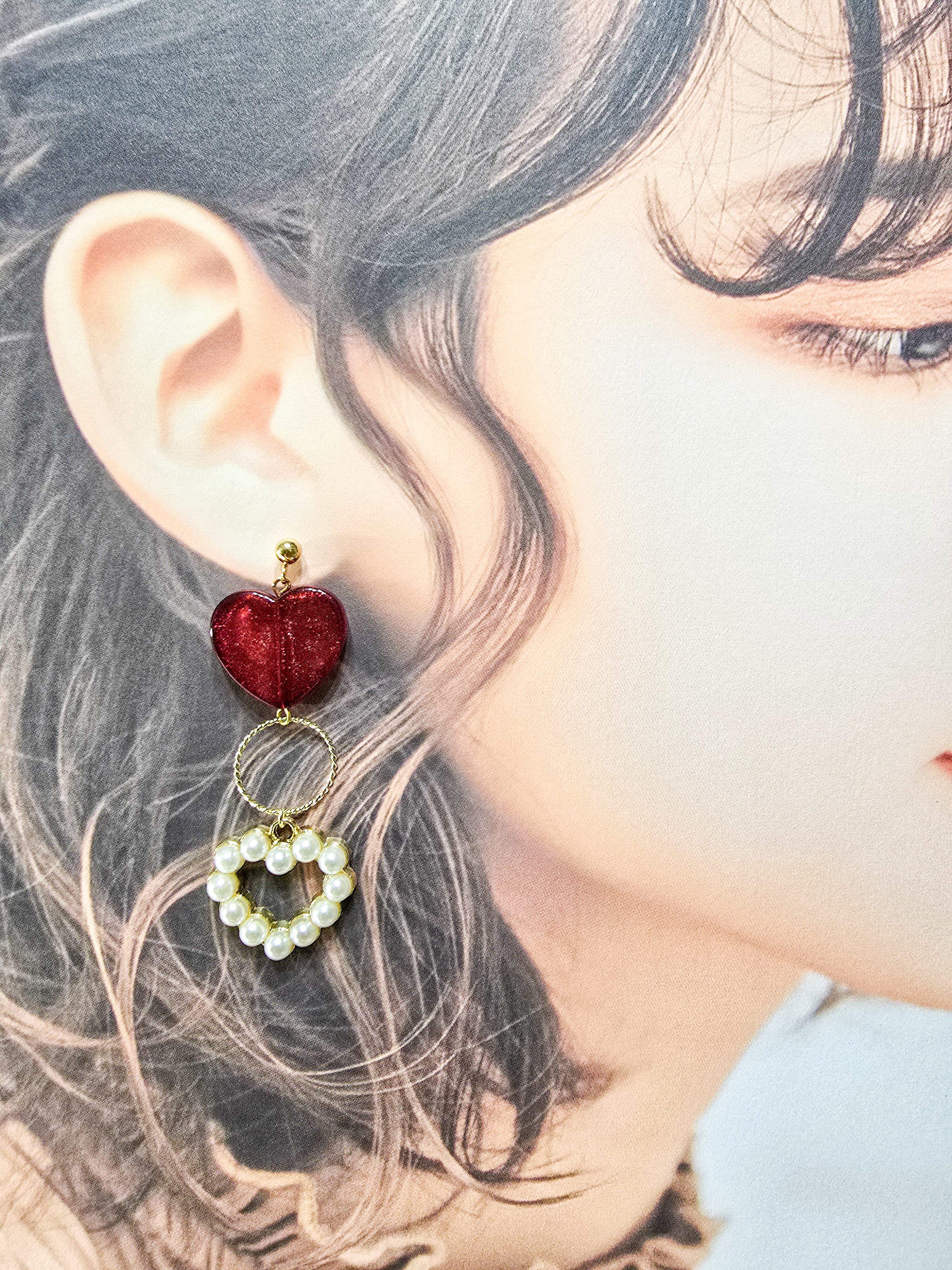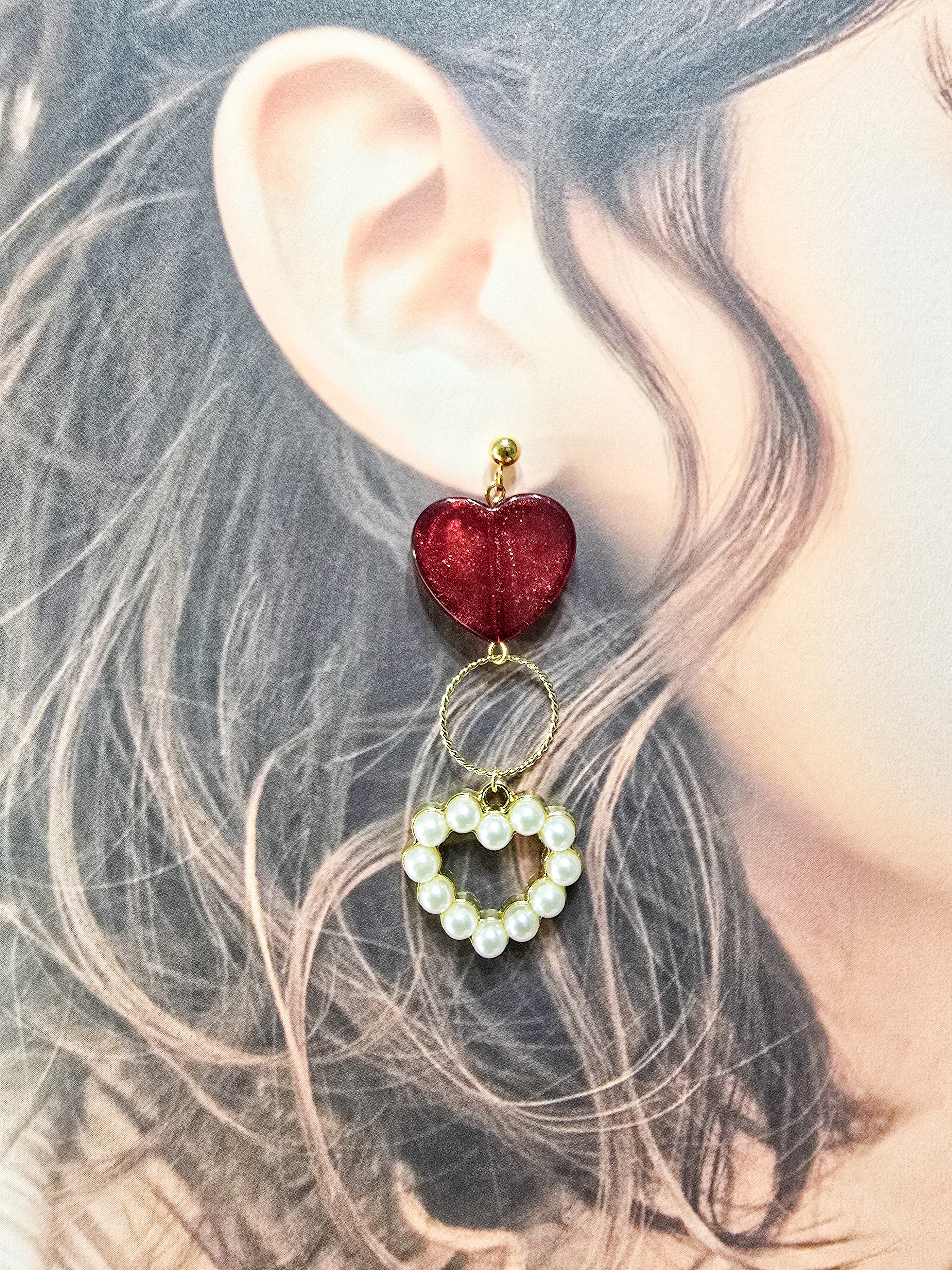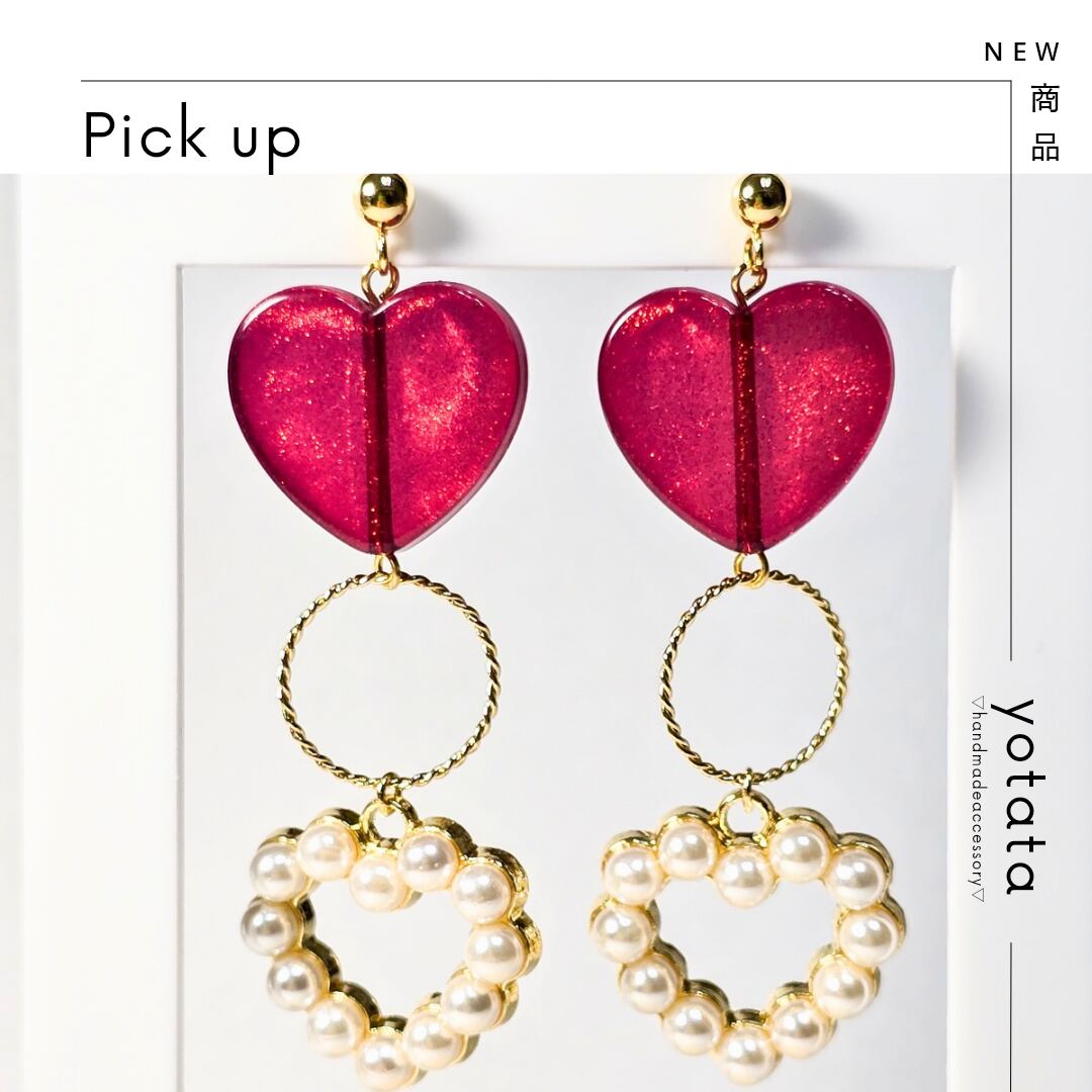 華やかなハート型のパールチャームに、キラキラと深みのあるオーロラディープレッドのハートが華やかさを添えてくれます❁︎